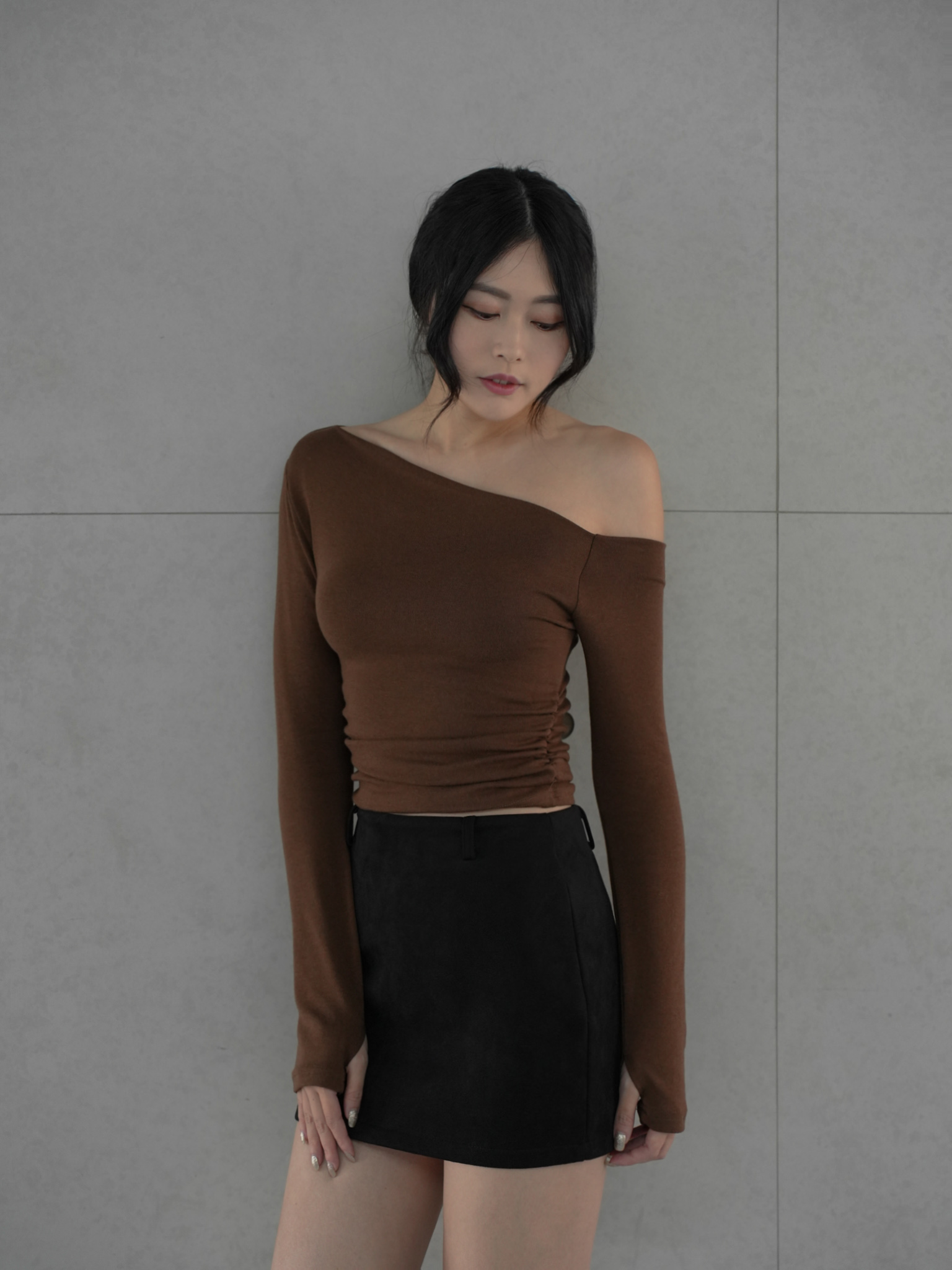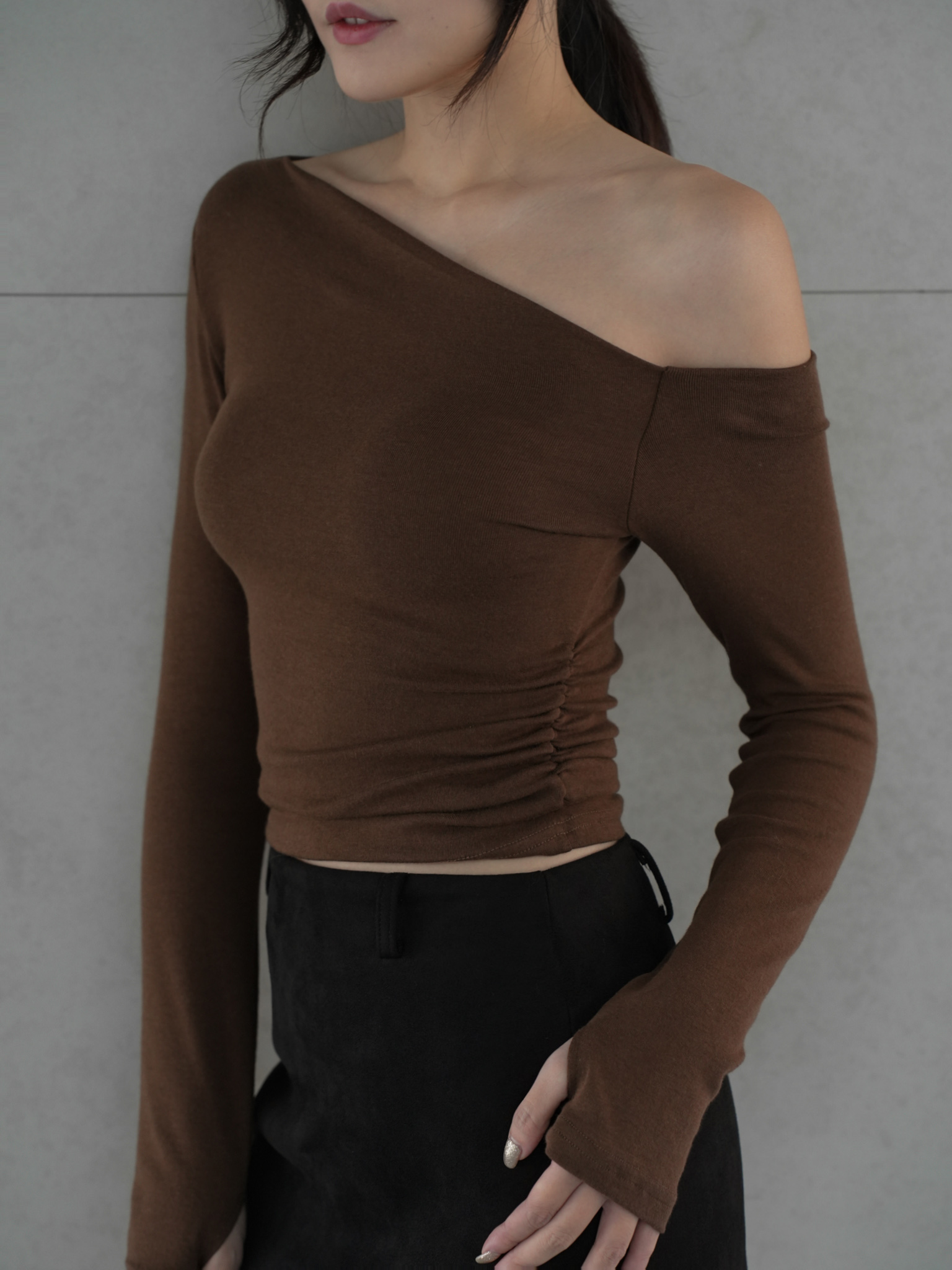 斜肩/兩側抓皺/整件彈性/磨毛棉質