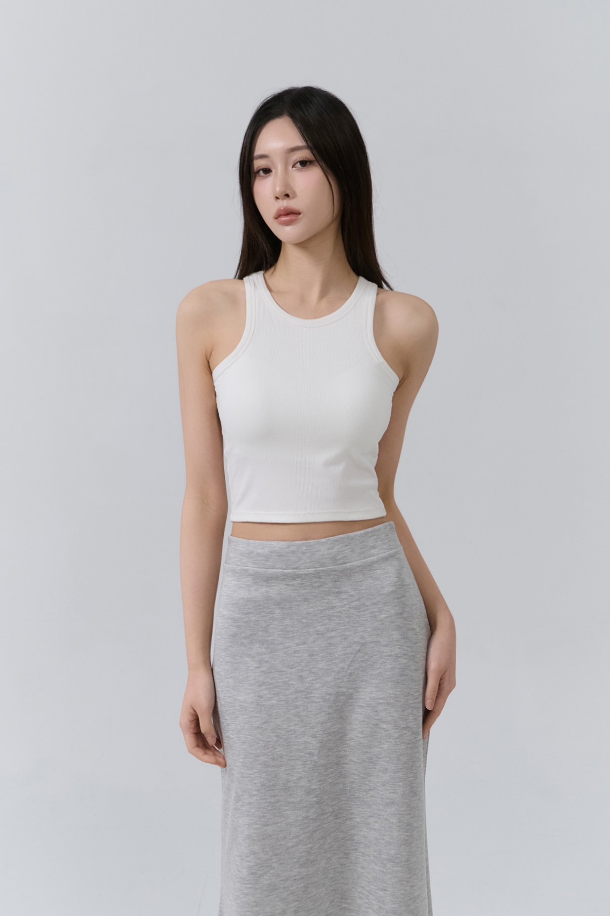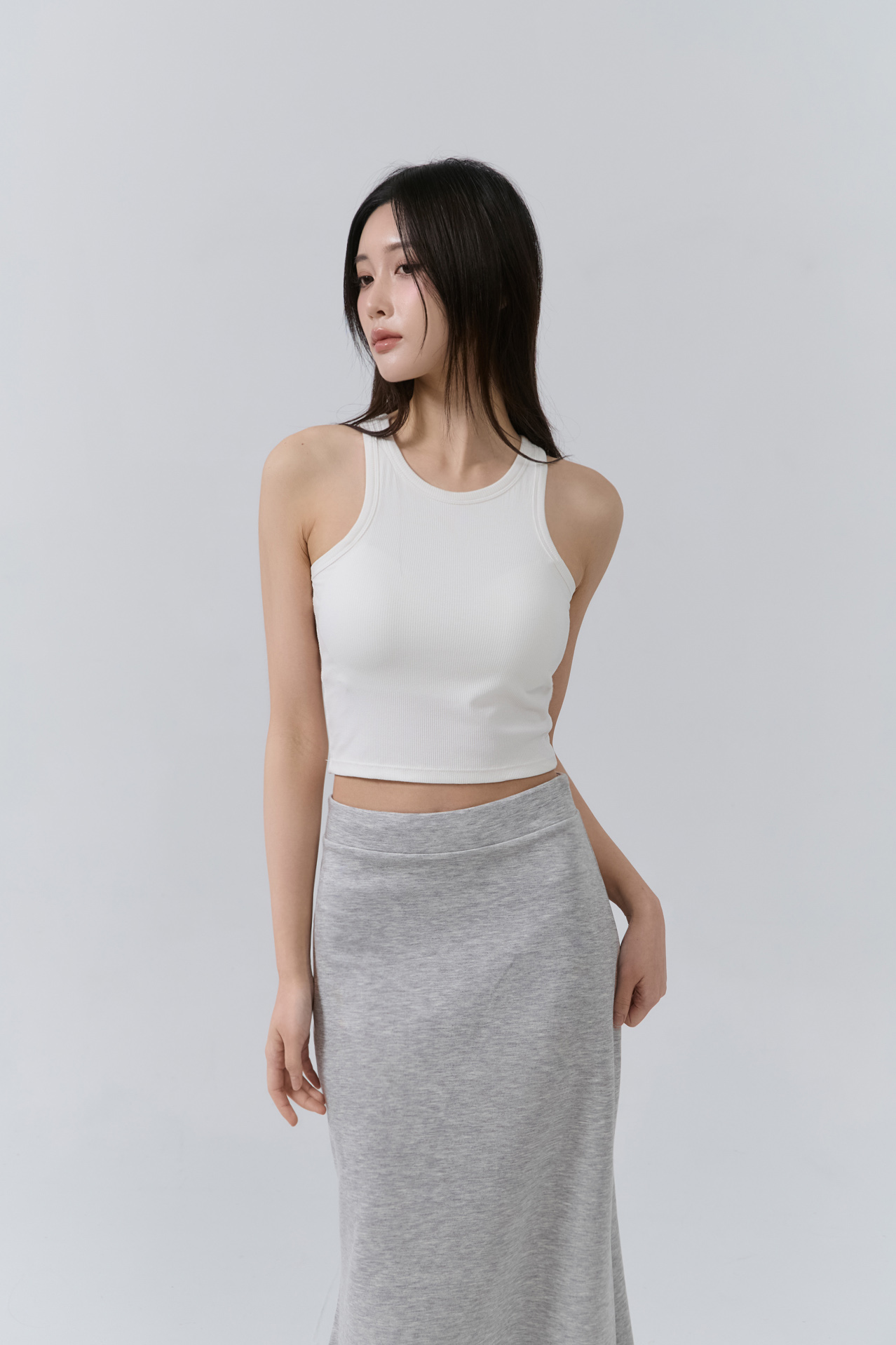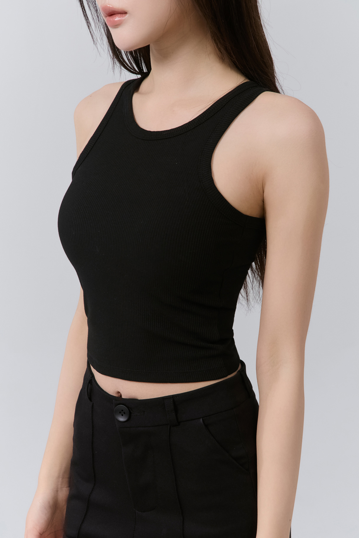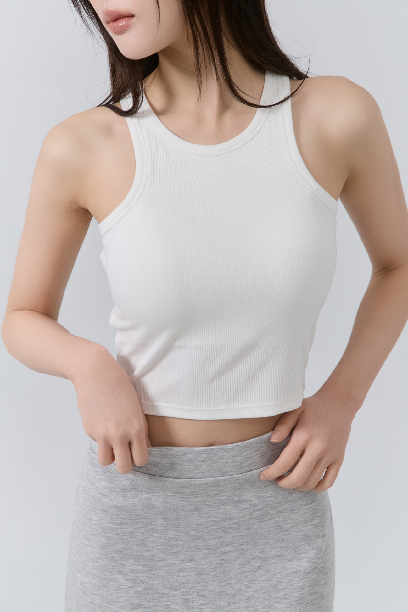 削肩 / 微短版 / 固定式乳膠胸墊 / 下緣彈性鬆緊 / 羅紋彈性棉質