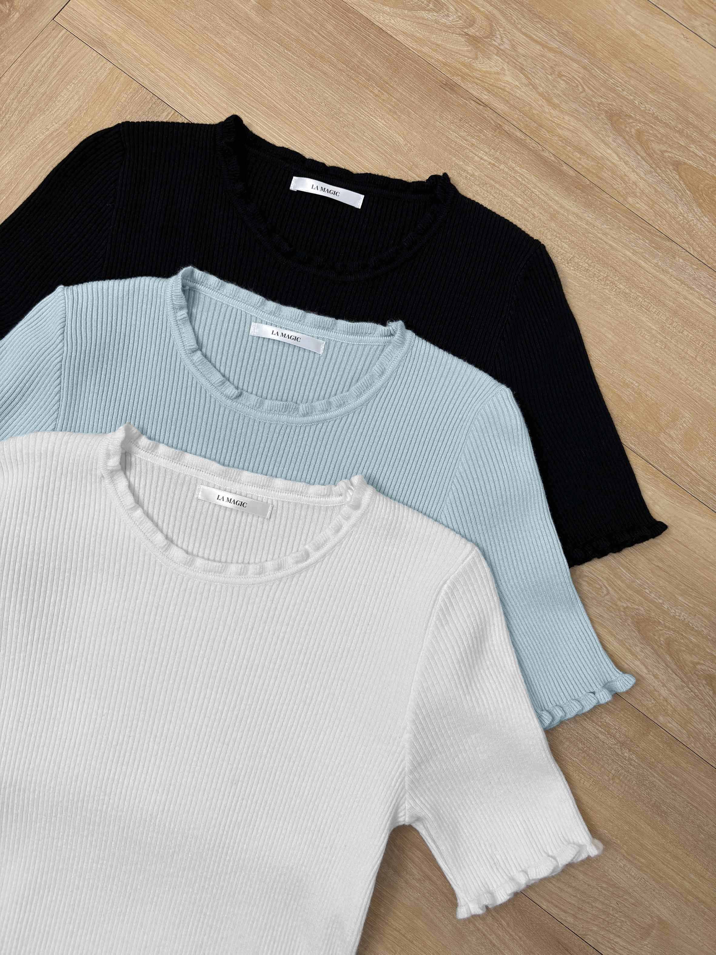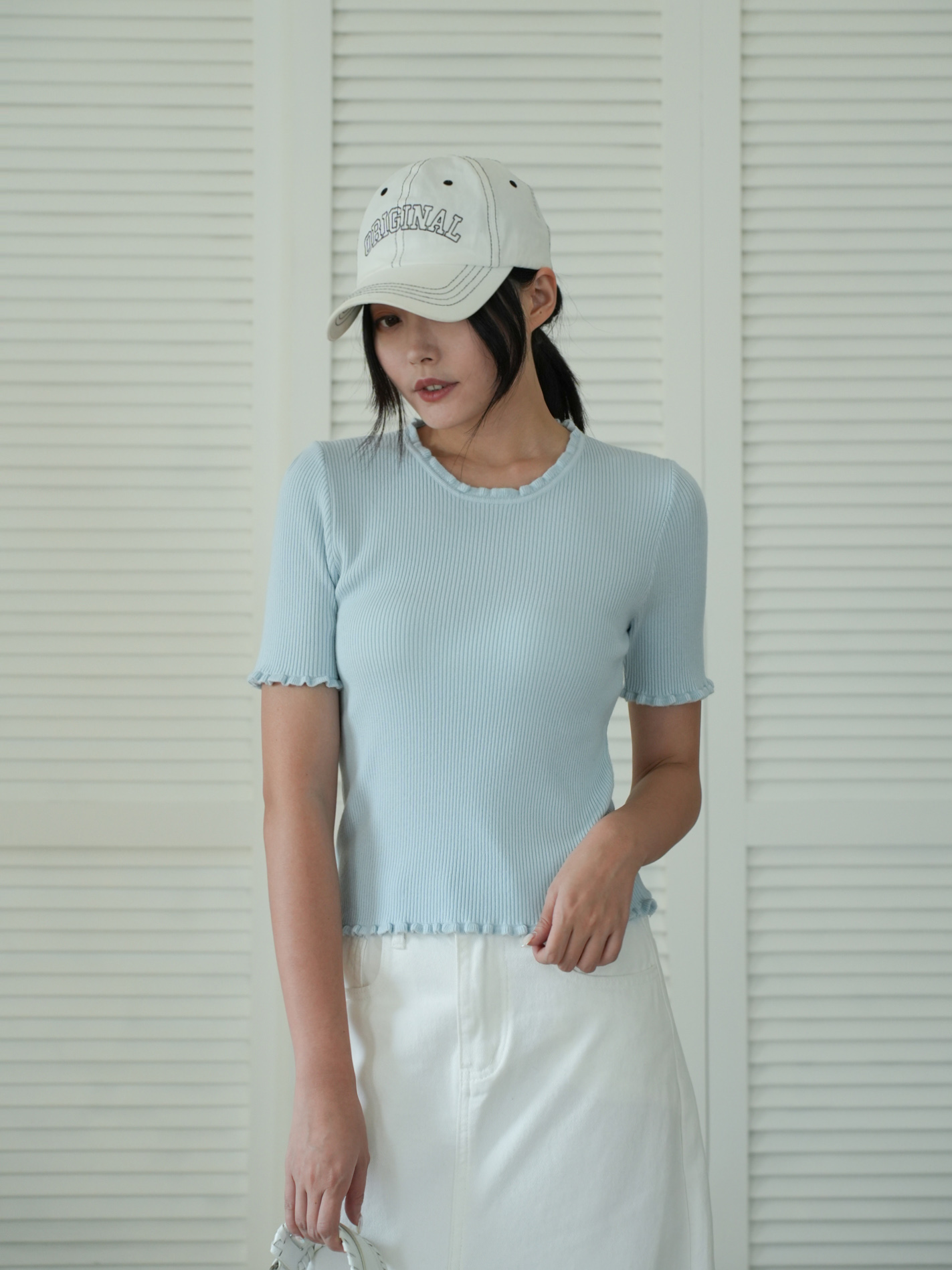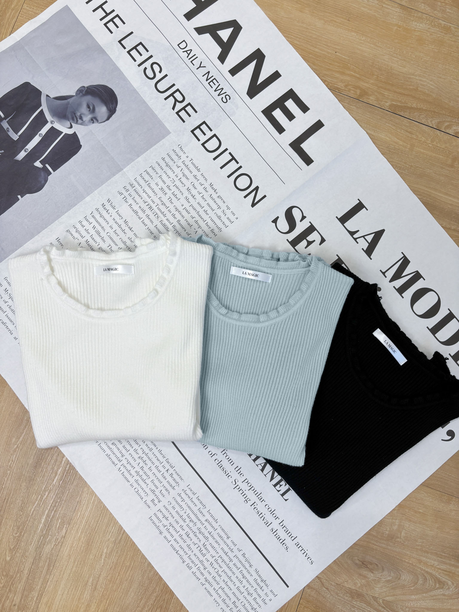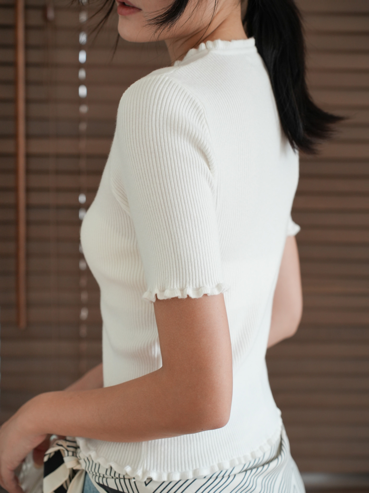 圓領 / 修身版型 / 木耳邊設計 / 坑條細針織