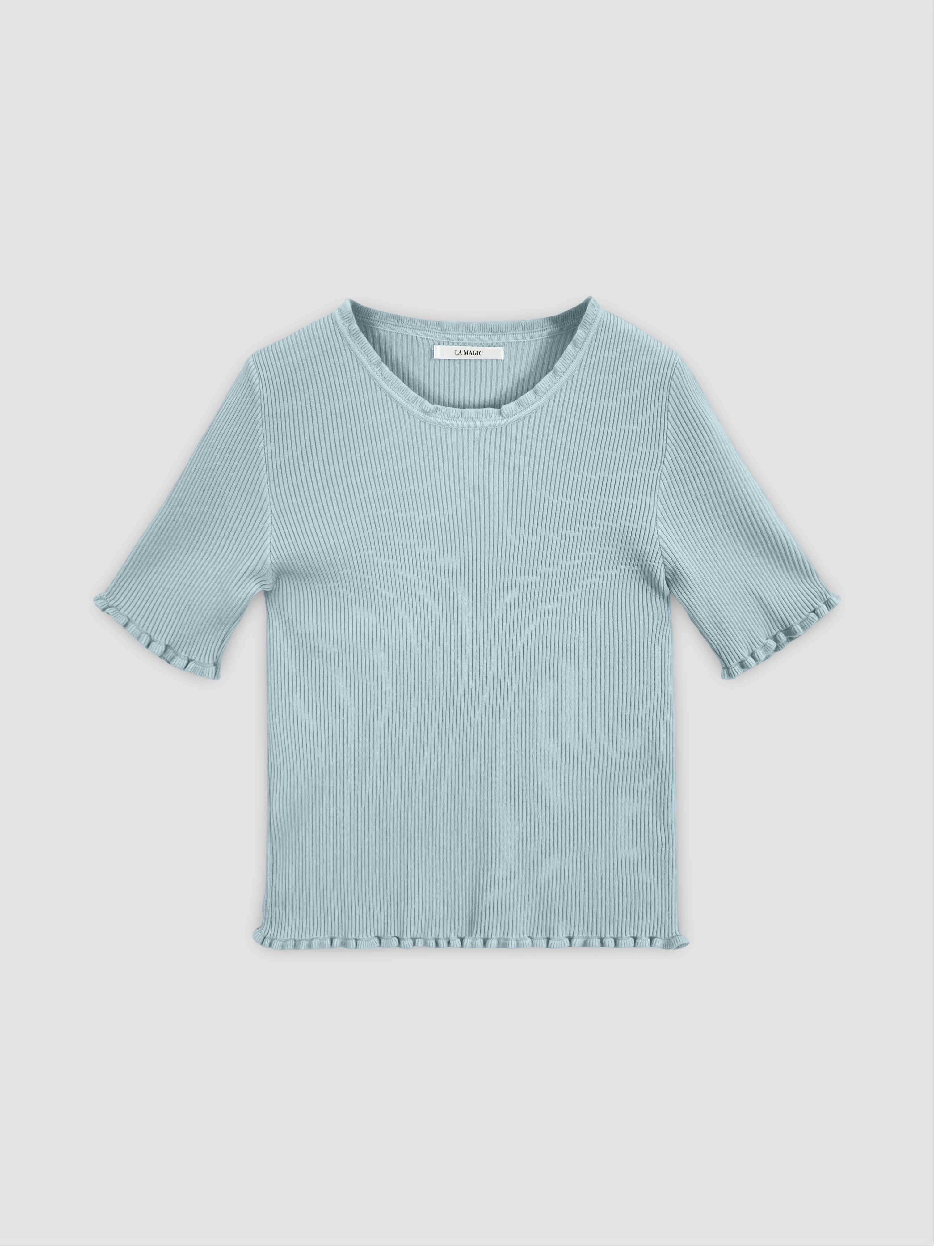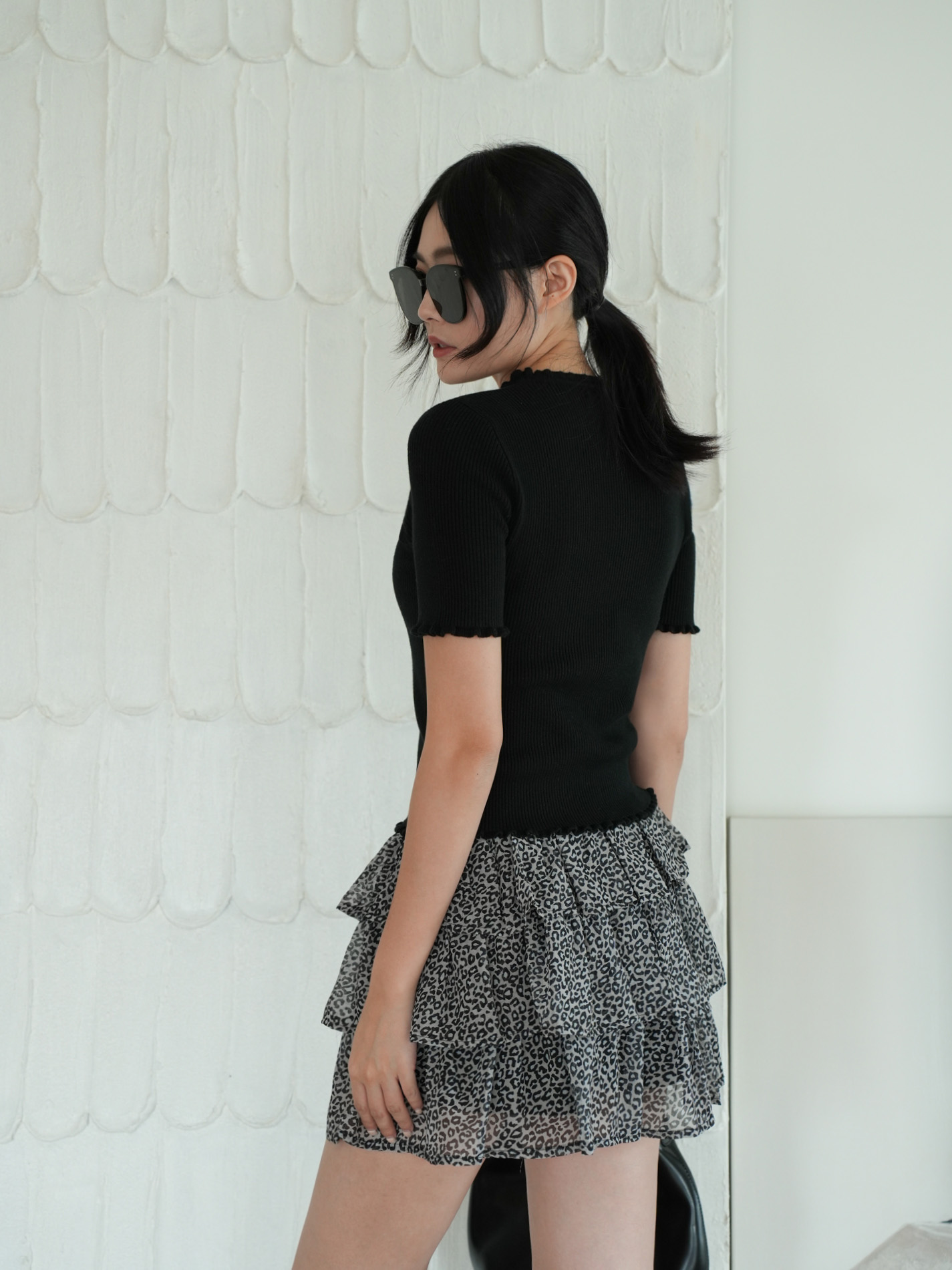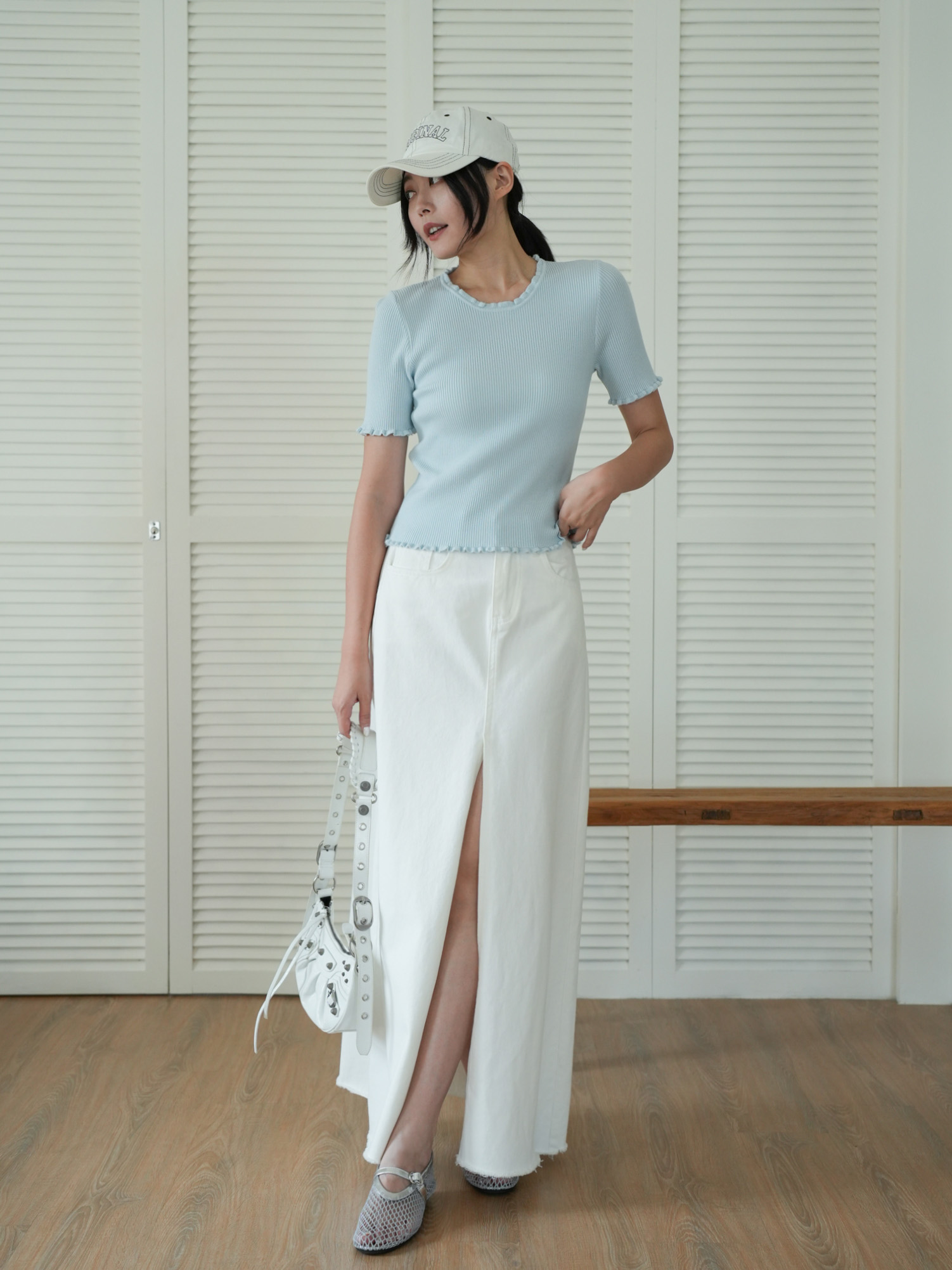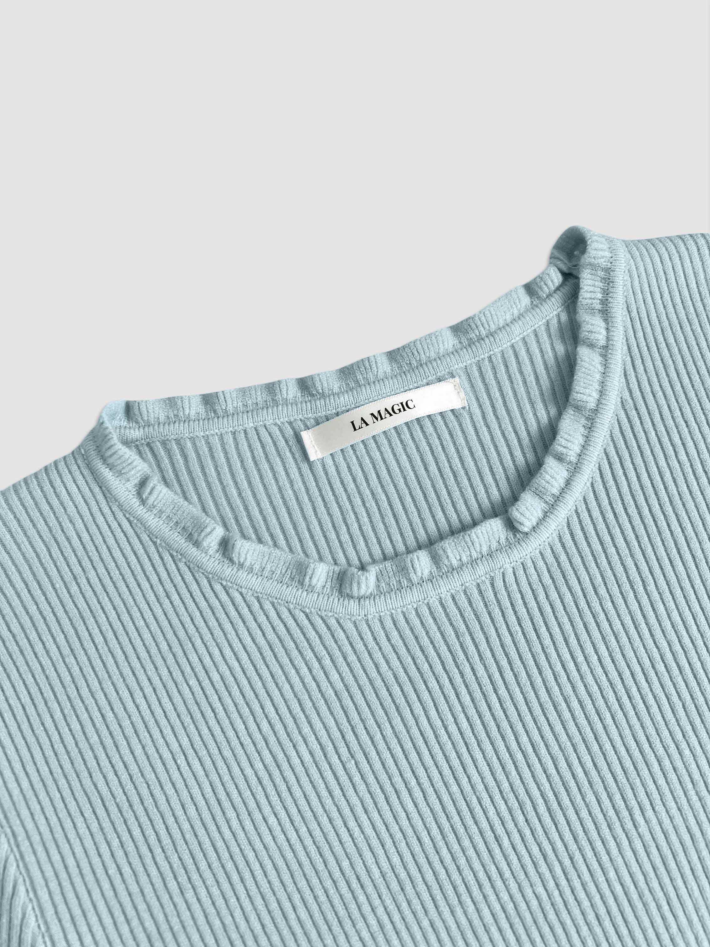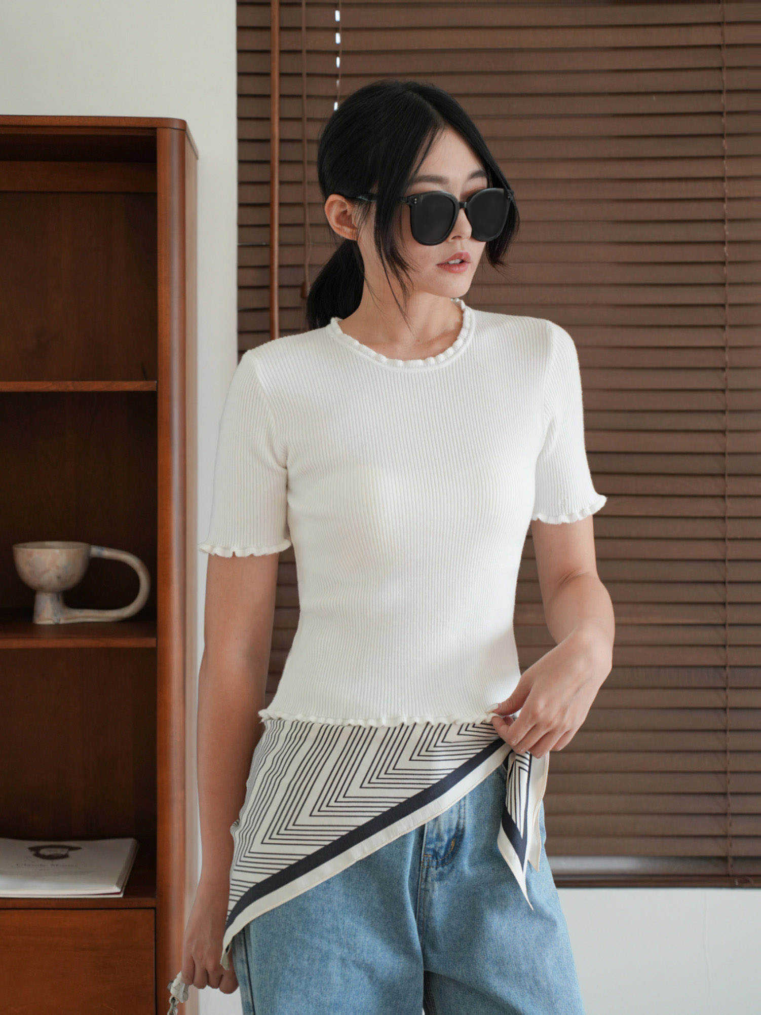 圓領 / 修身版型 / 木耳邊設計 / 坑條細針織