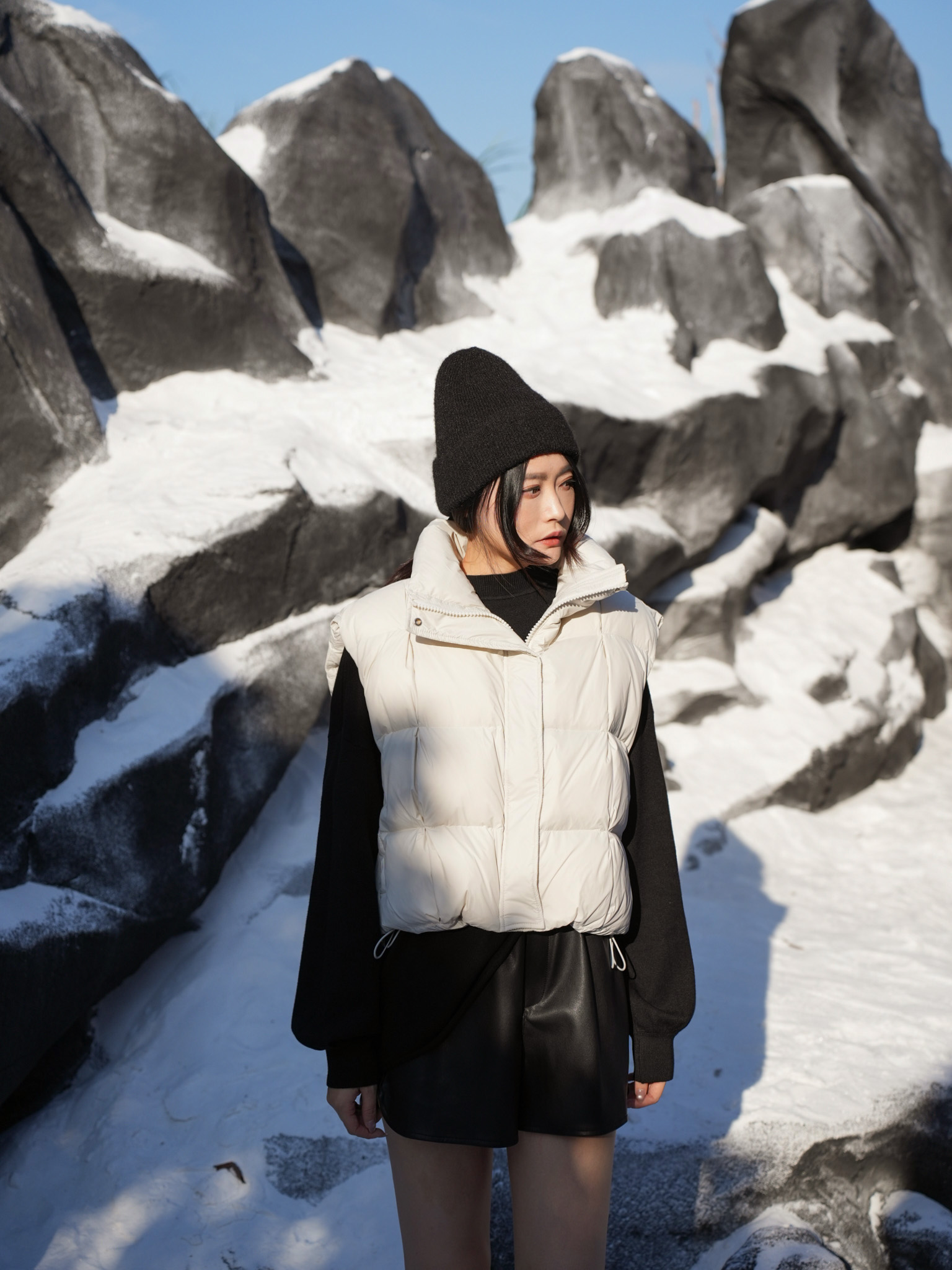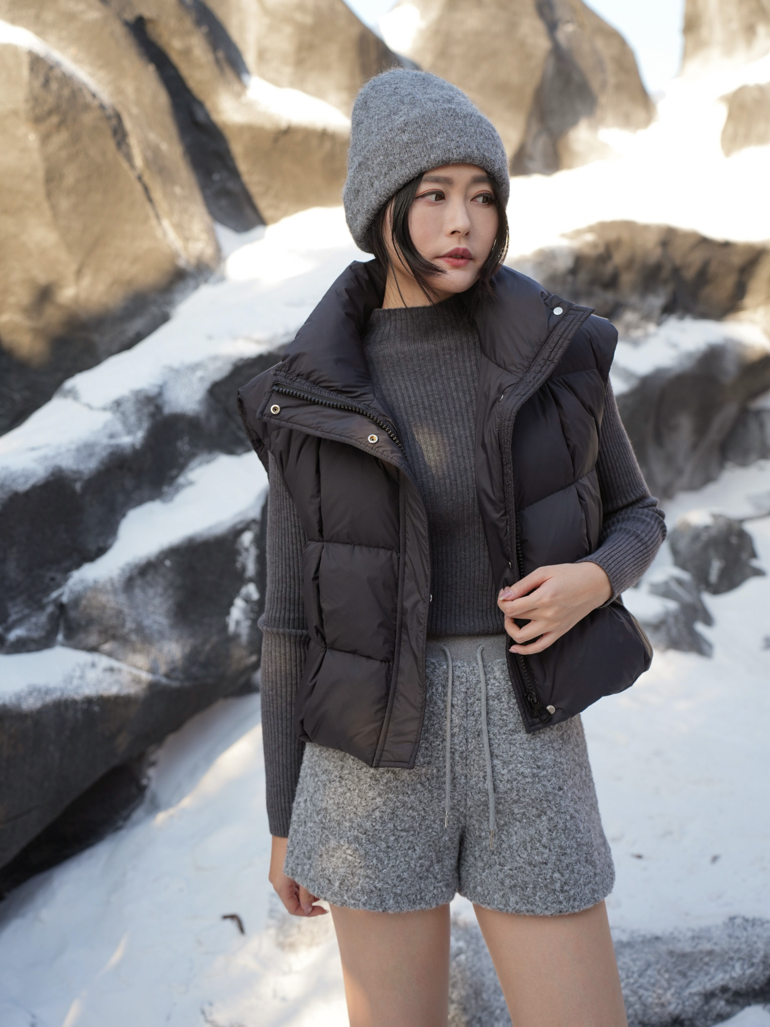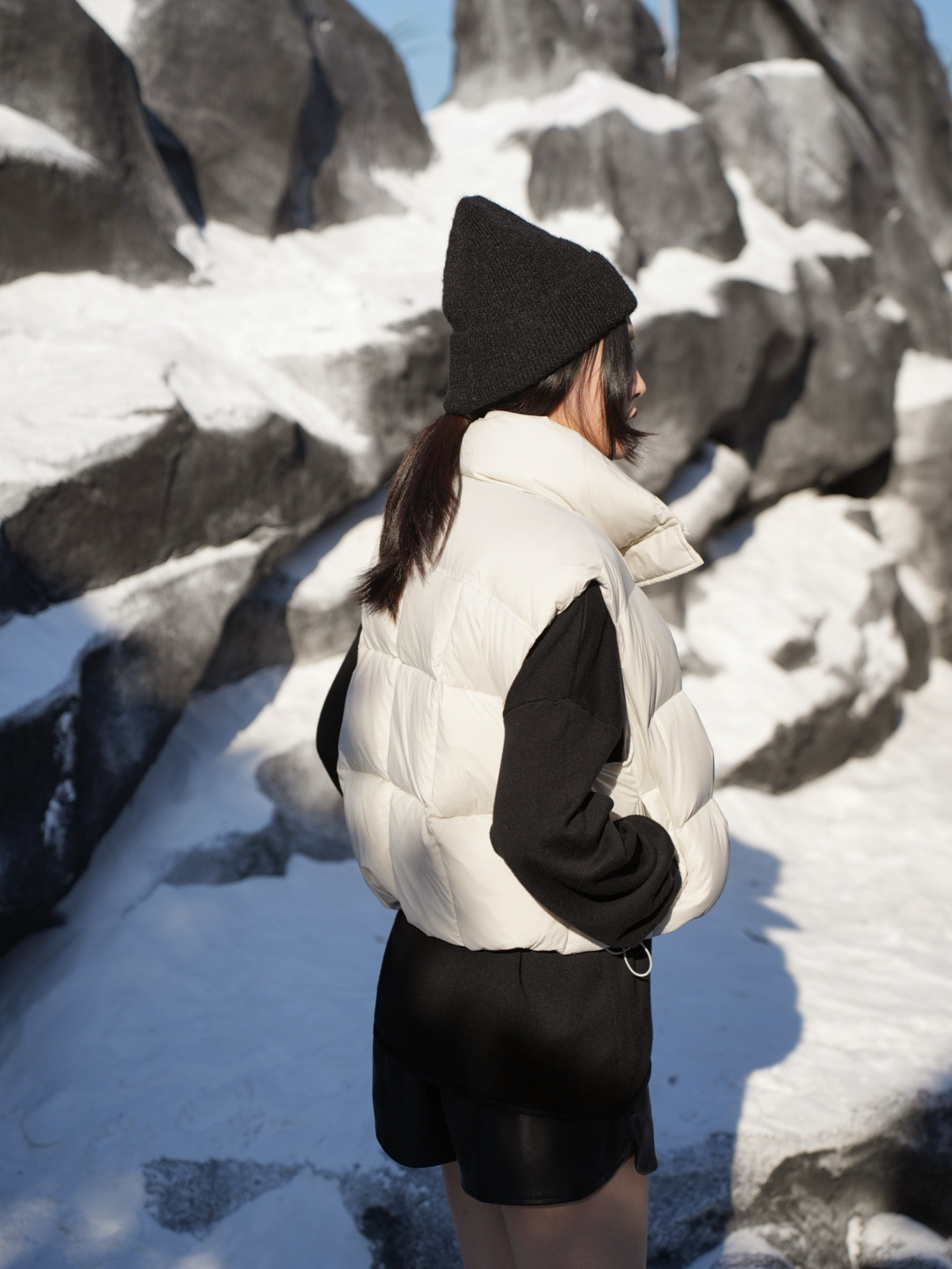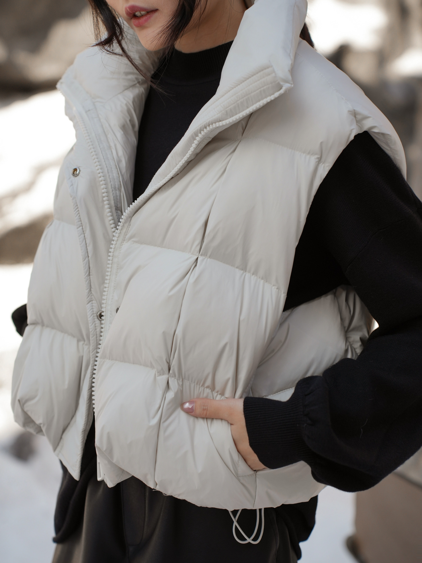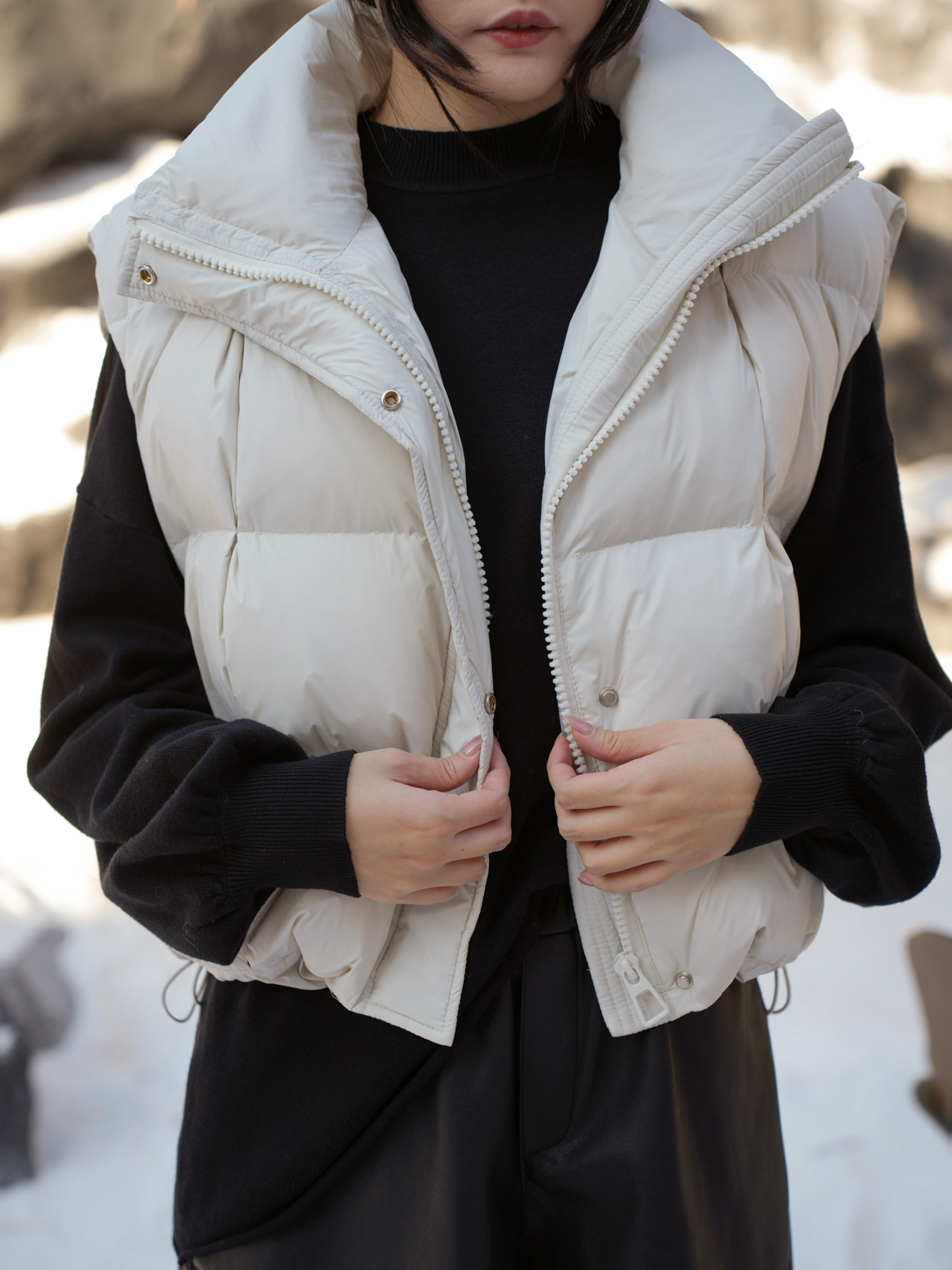 立領 / 馬甲式背心 / 拉鍊及暗釦 / 下擺抽繩可調節 / 保暖羽絨