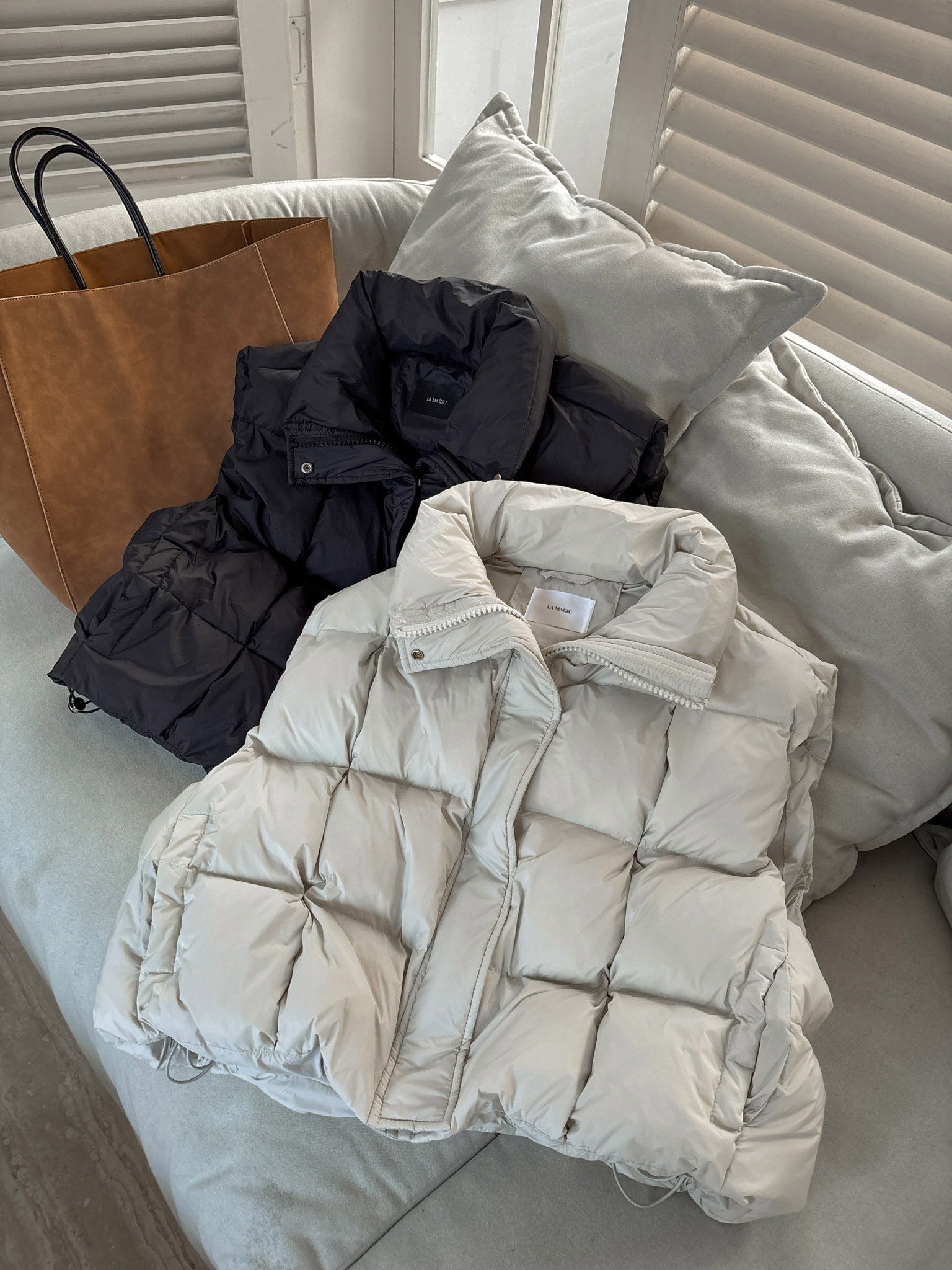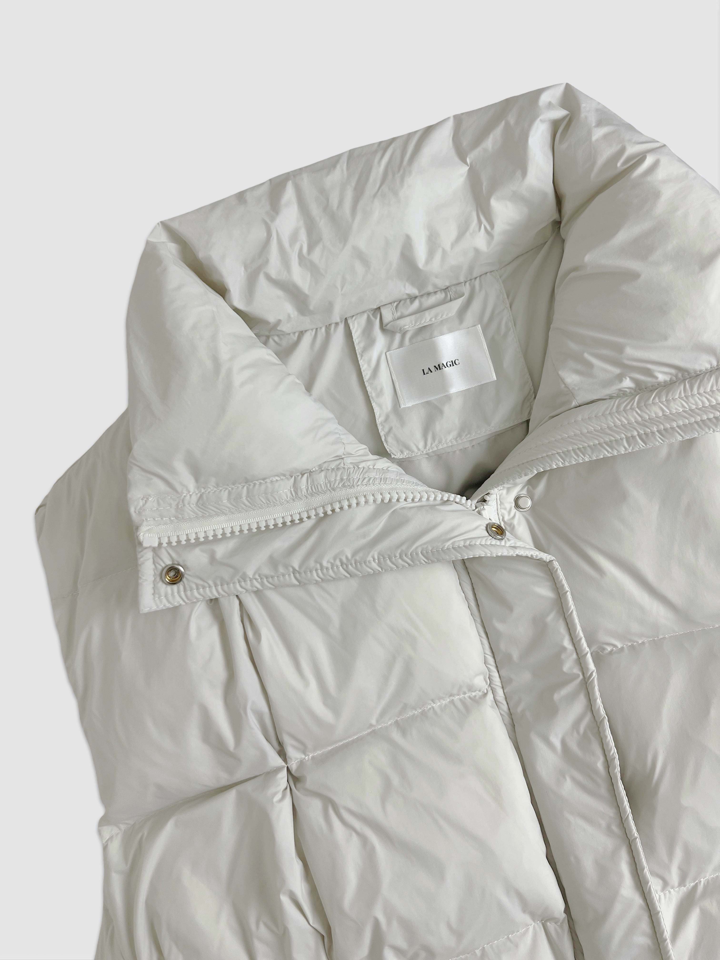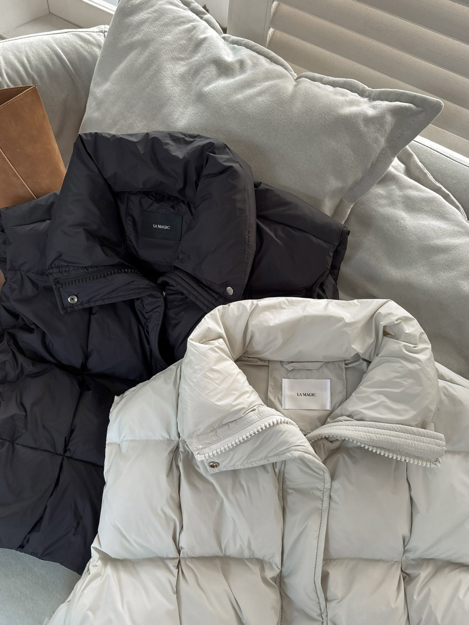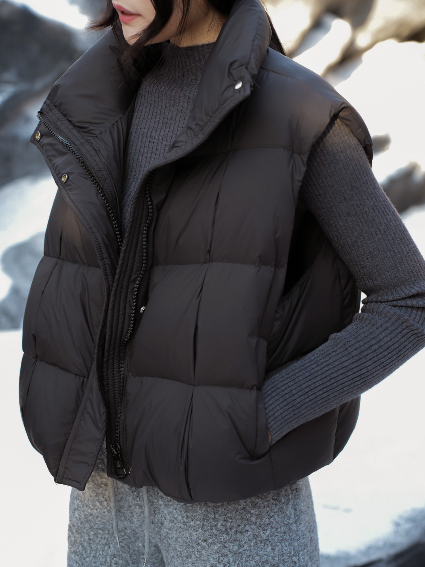 立領 / 馬甲式背心 / 拉鍊及暗釦 / 下擺抽繩可調節 / 保暖羽絨