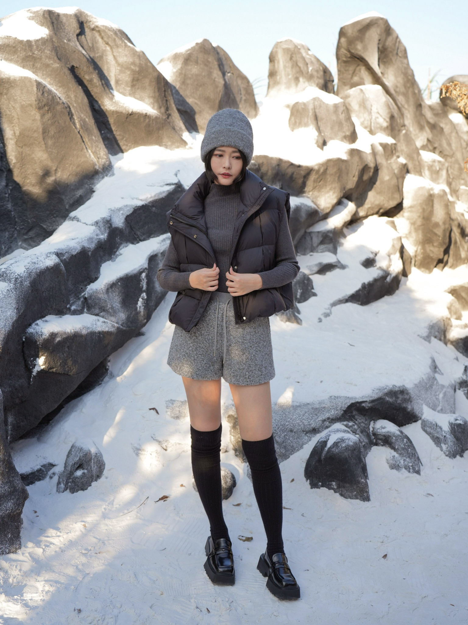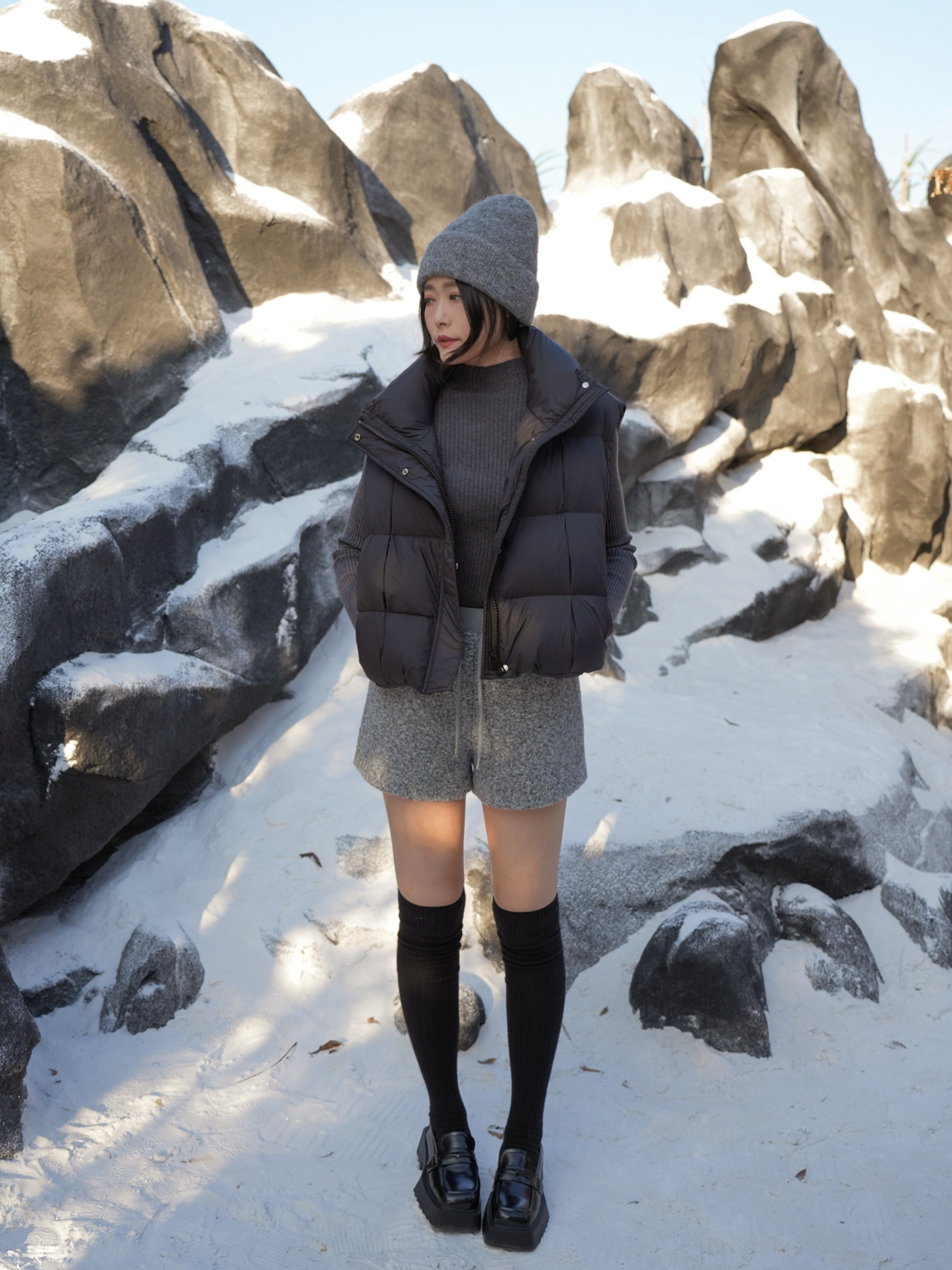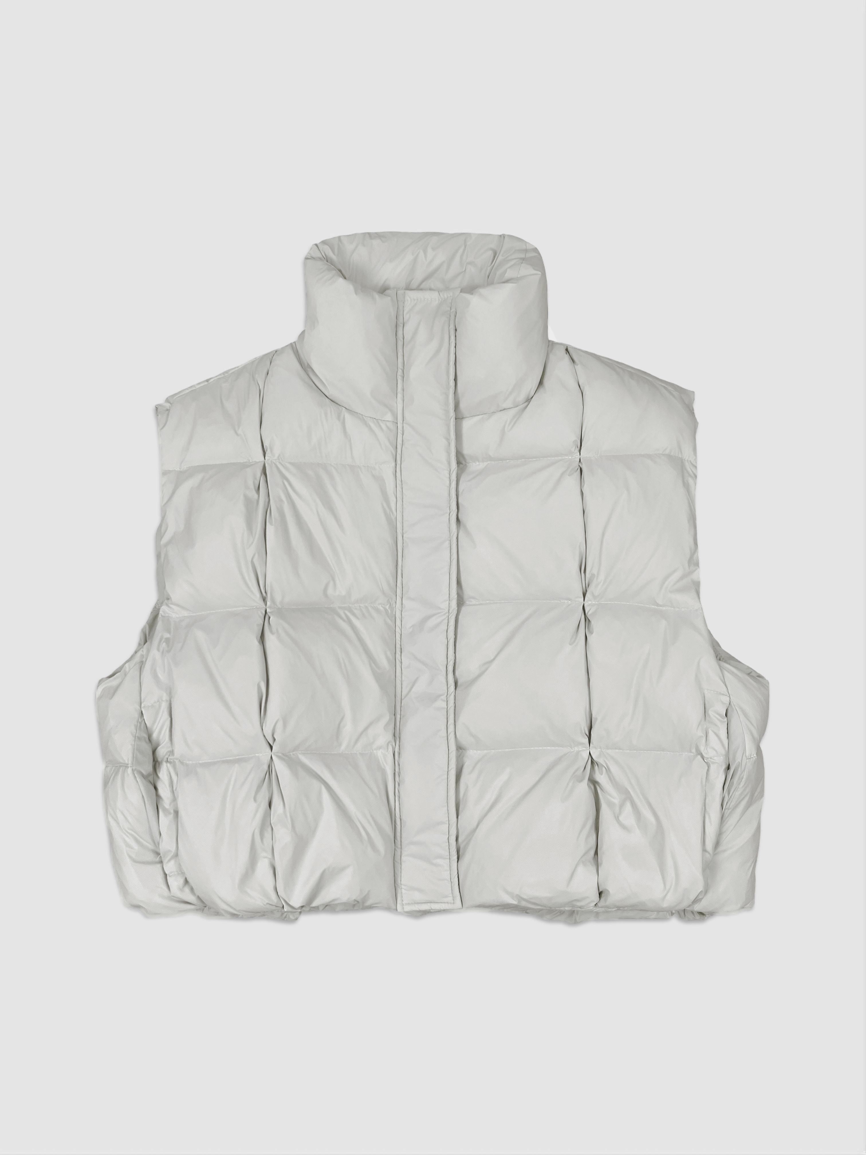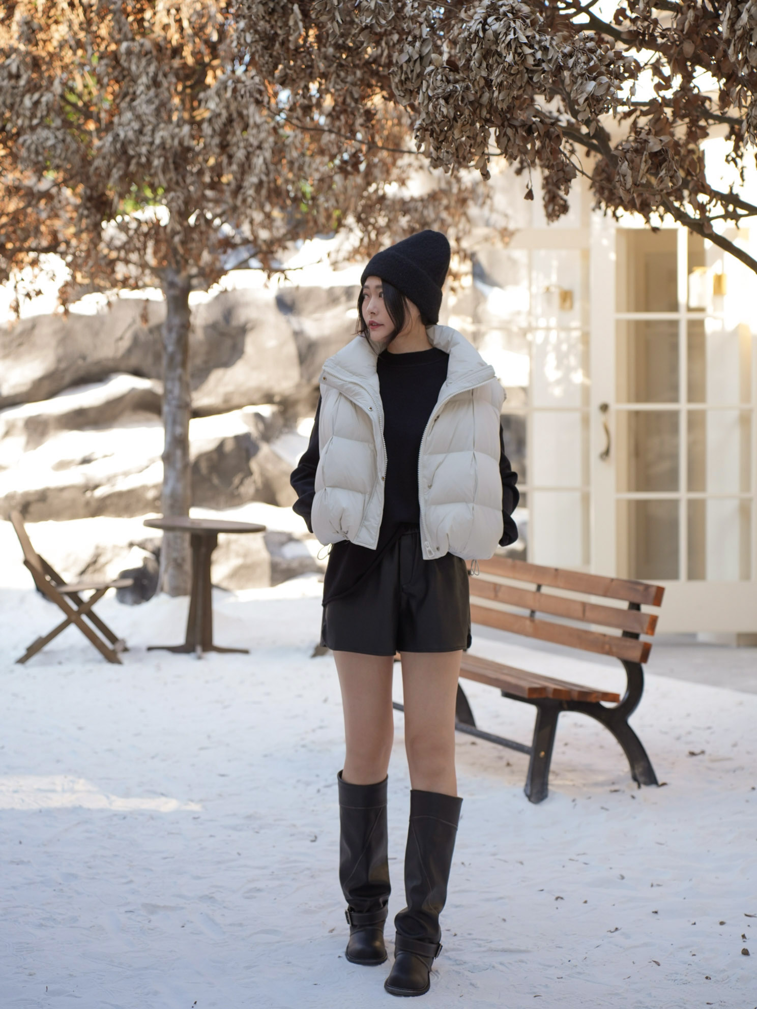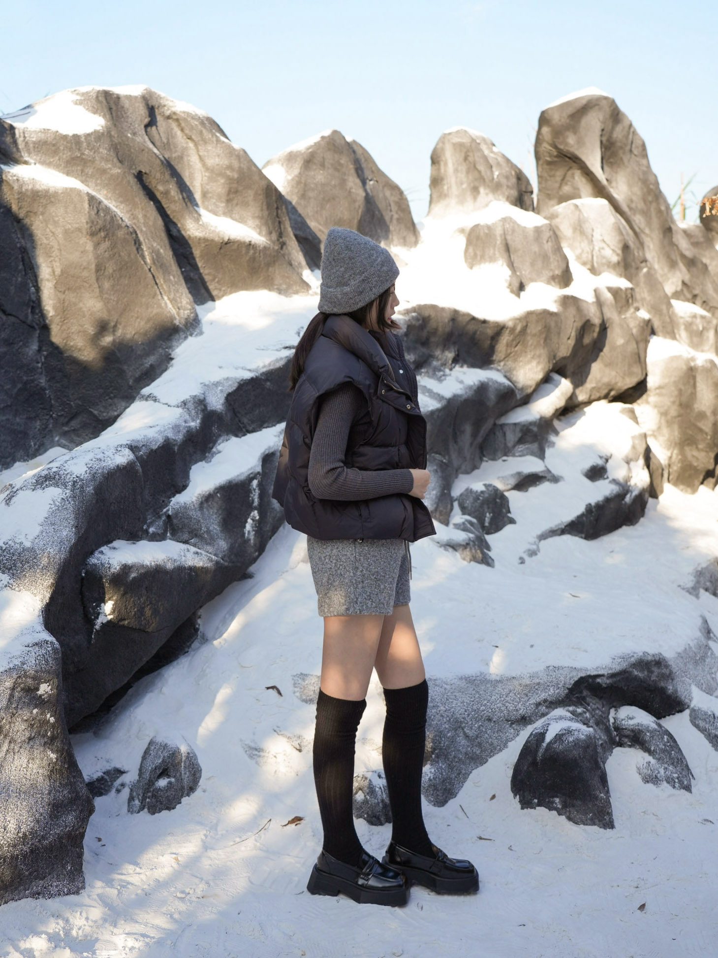 立領 / 馬甲式背心 / 拉鍊及暗釦 / 下擺抽繩可調節 / 保暖羽絨