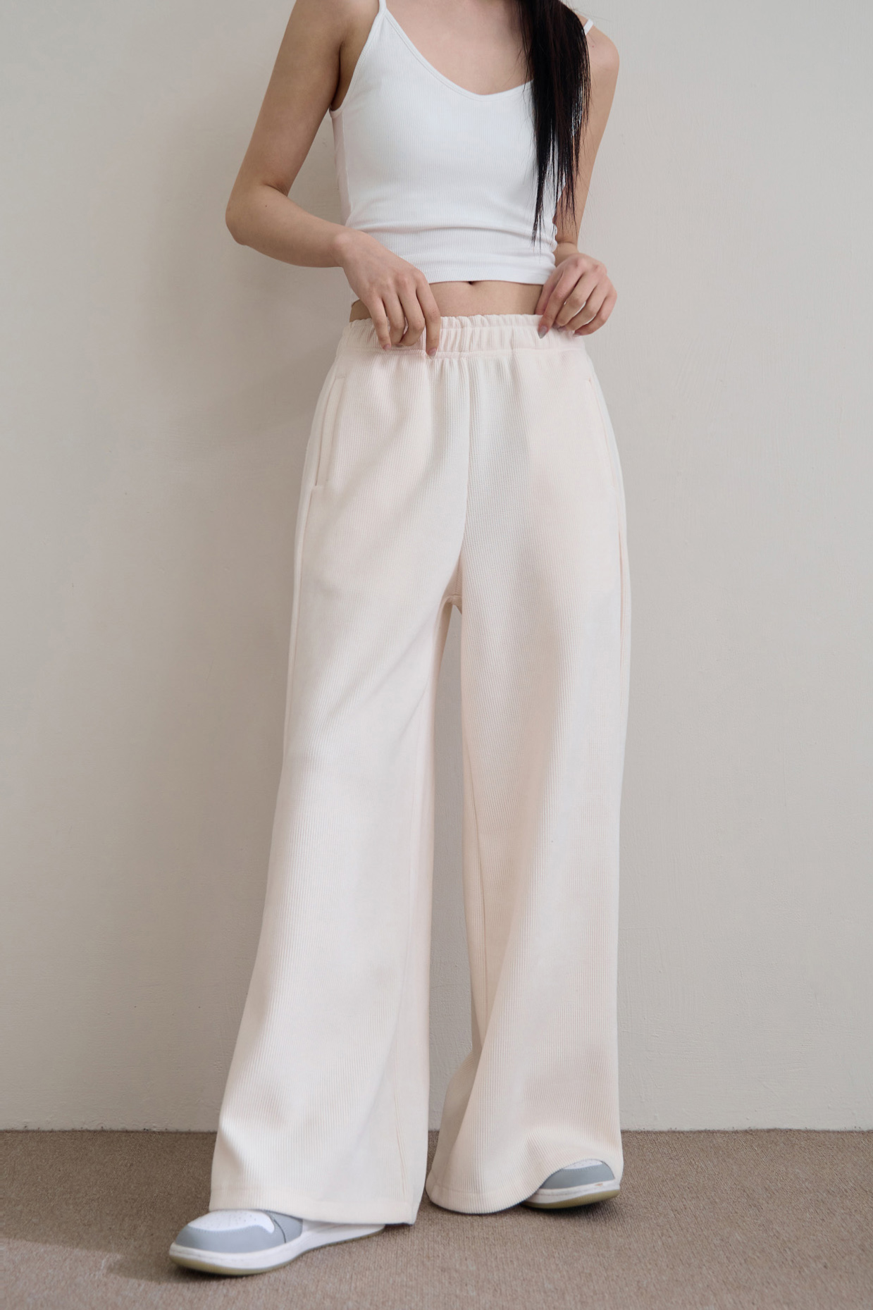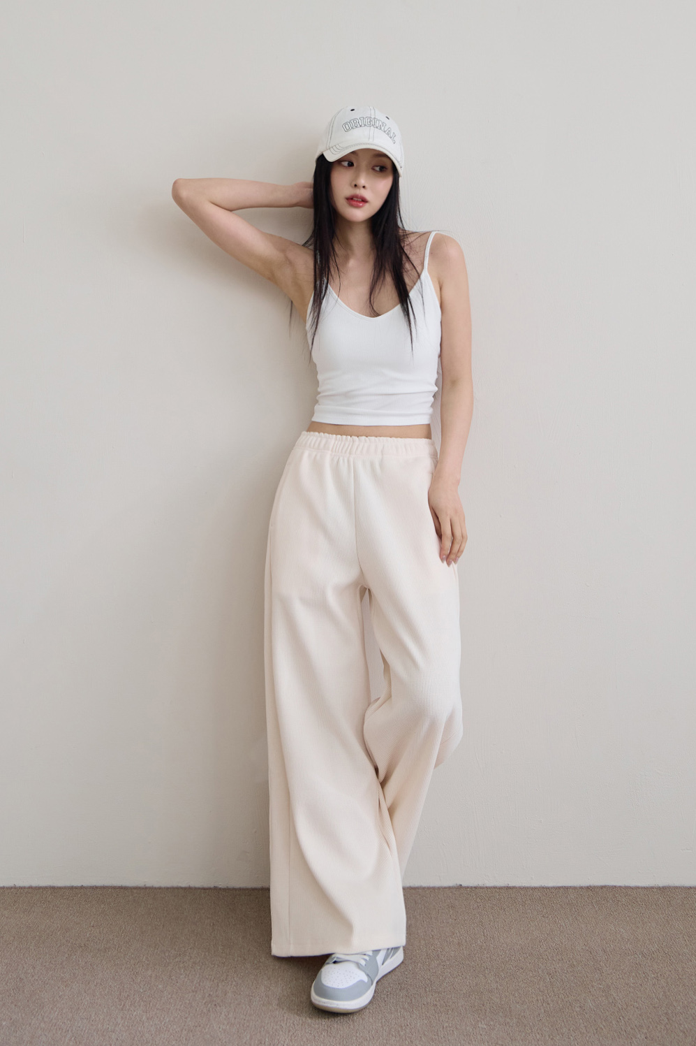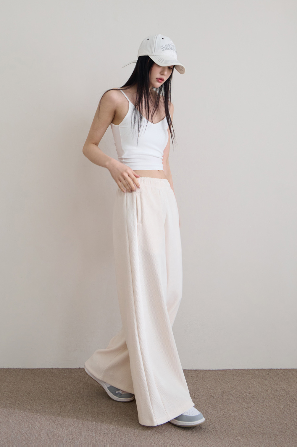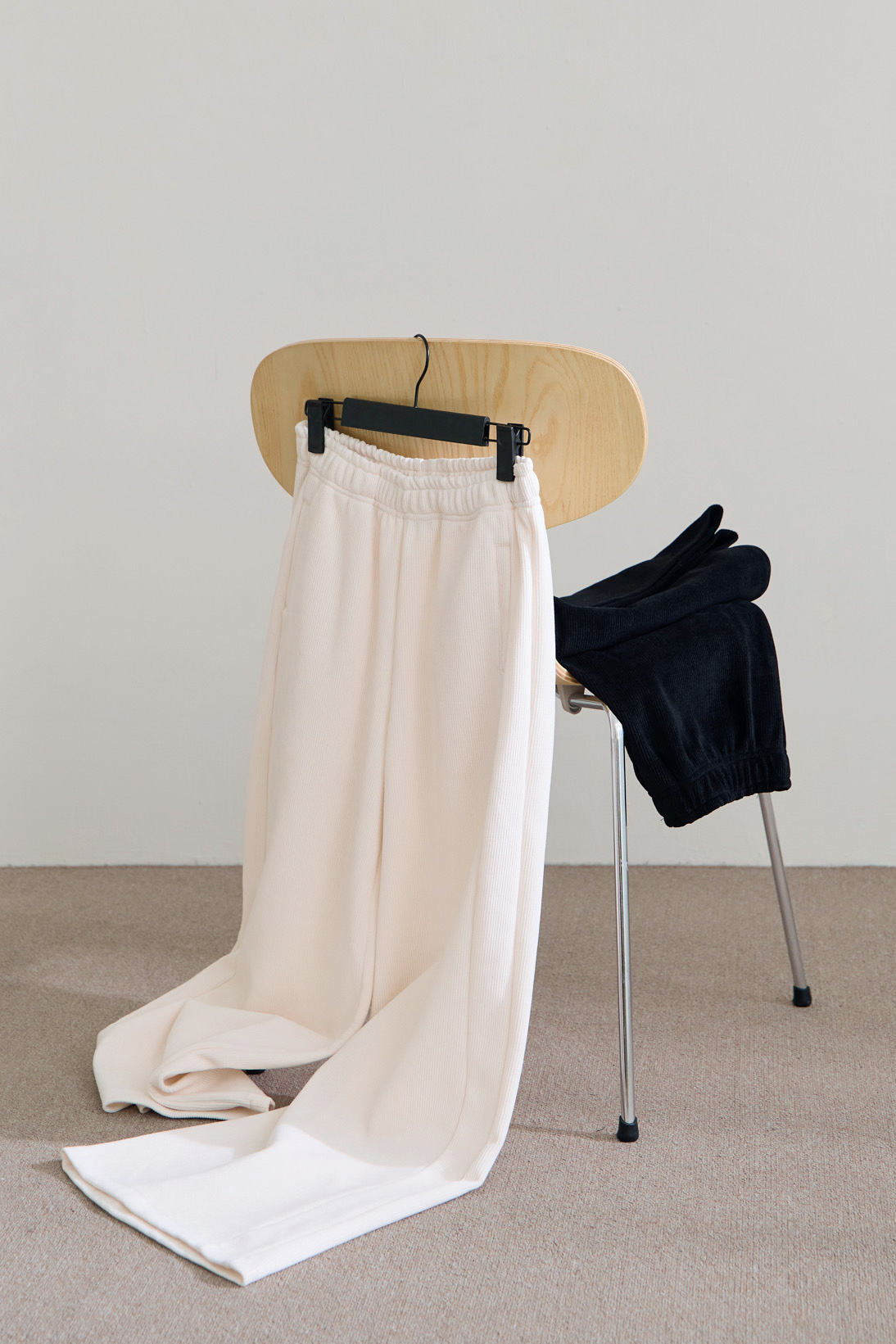 整圈鬆緊 / 兩側口袋 / 寬褲版型 / 挺版坑紋棉面料