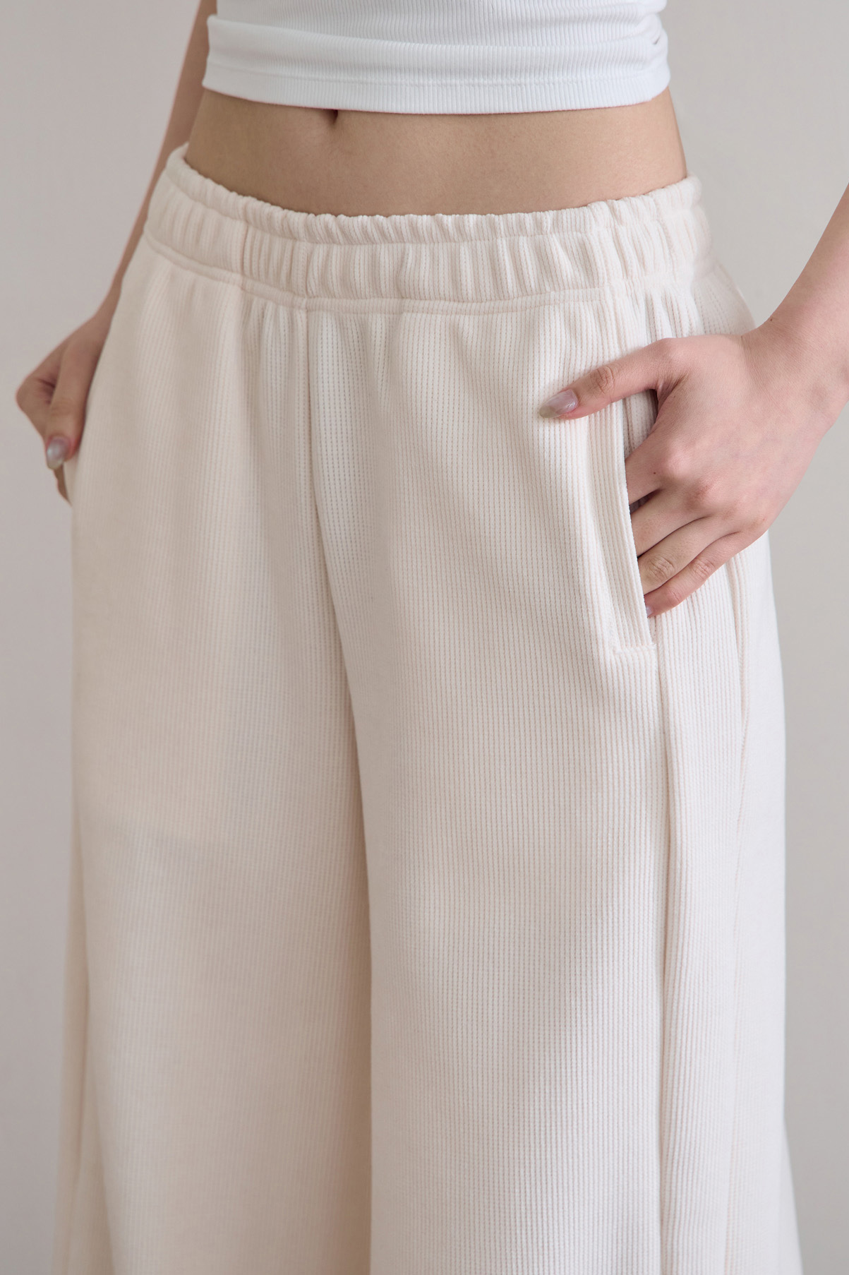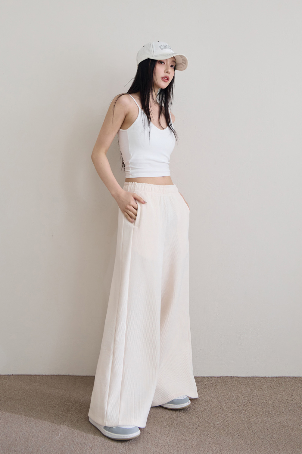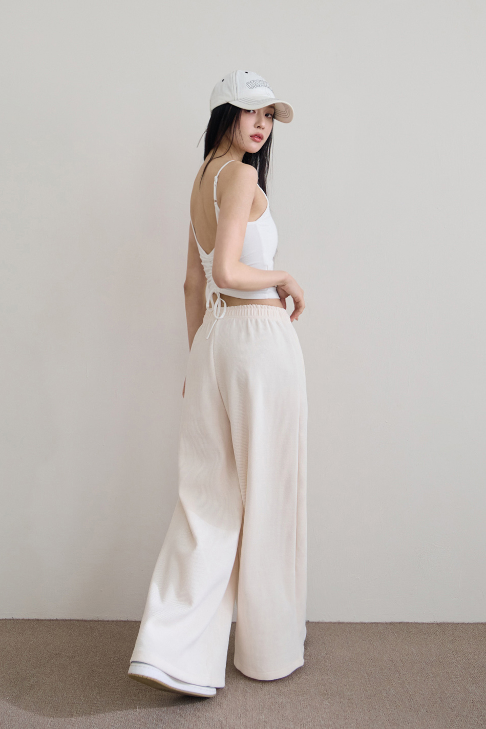 整圈鬆緊 / 兩側口袋 / 寬褲版型 / 挺版坑紋棉面料