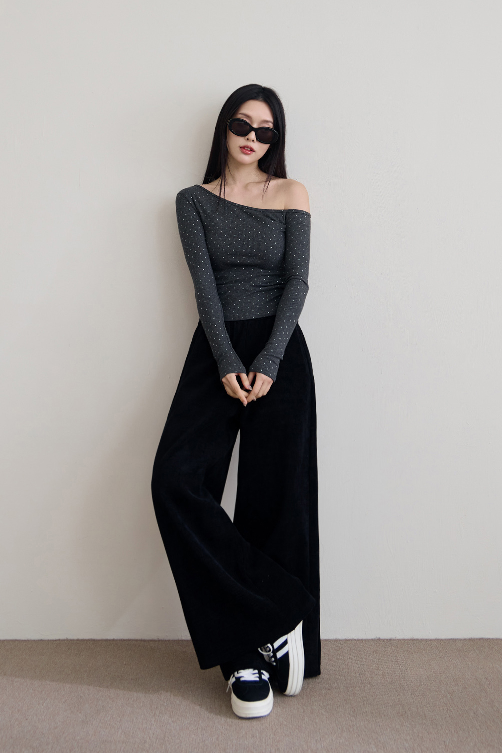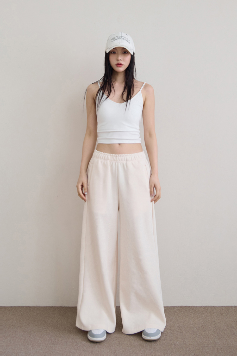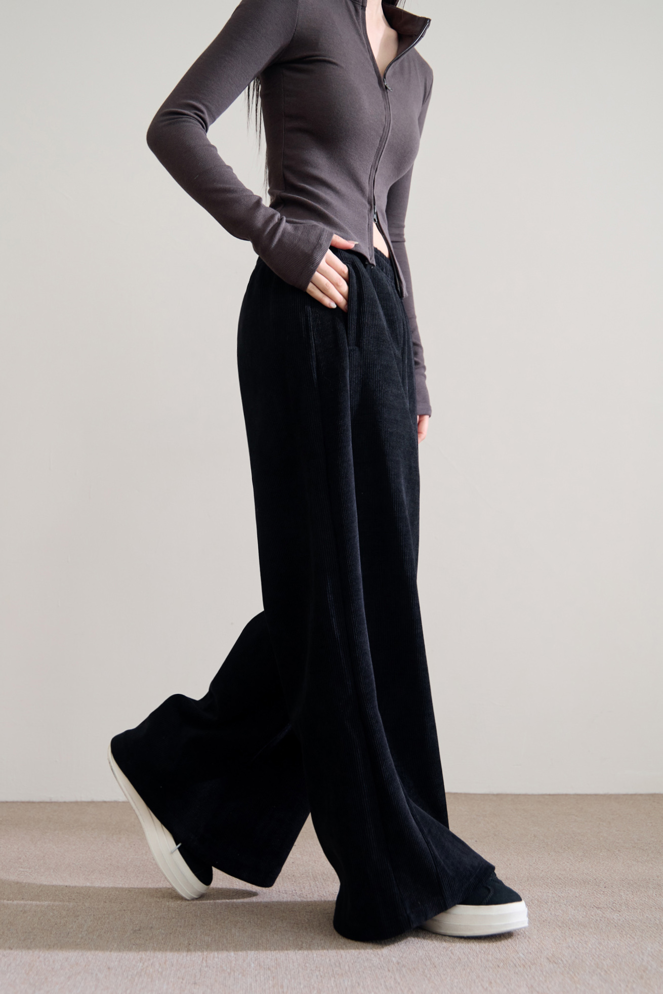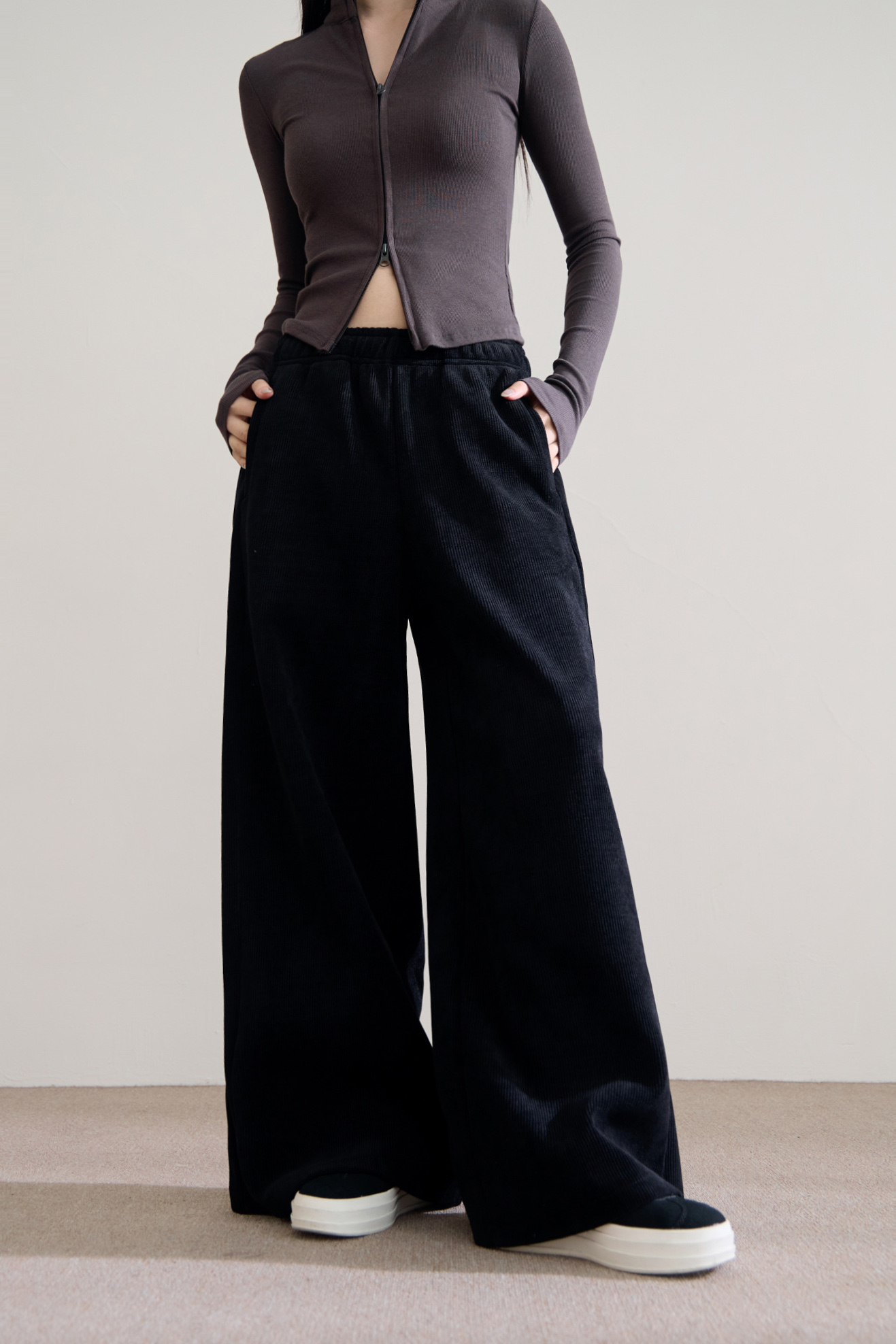 整圈鬆緊 / 兩側口袋 / 寬褲版型 / 挺版坑紋棉面料
