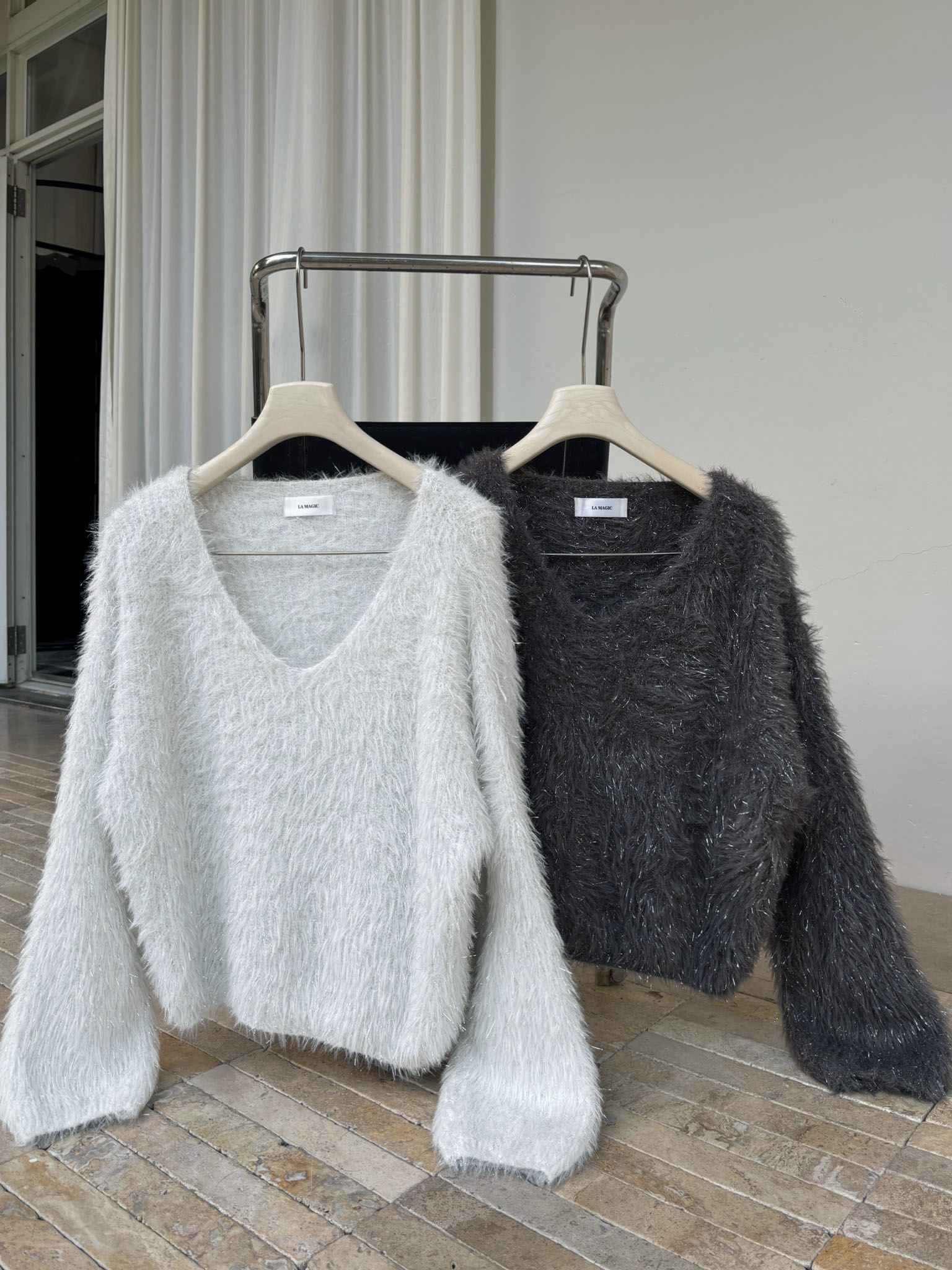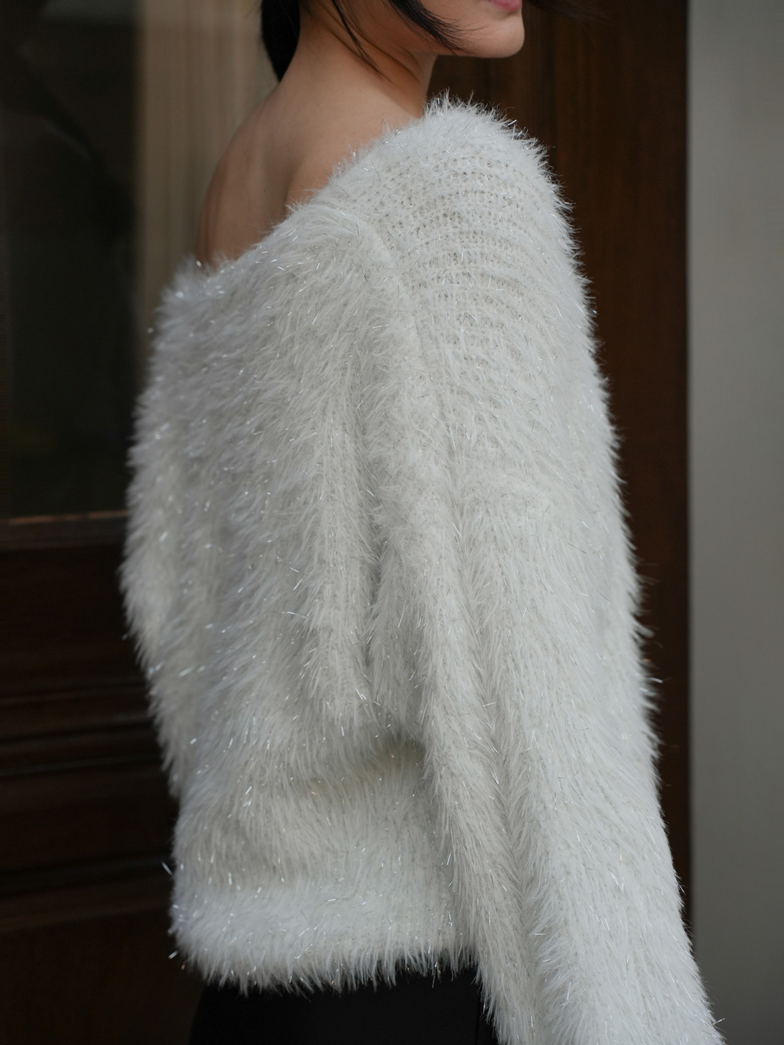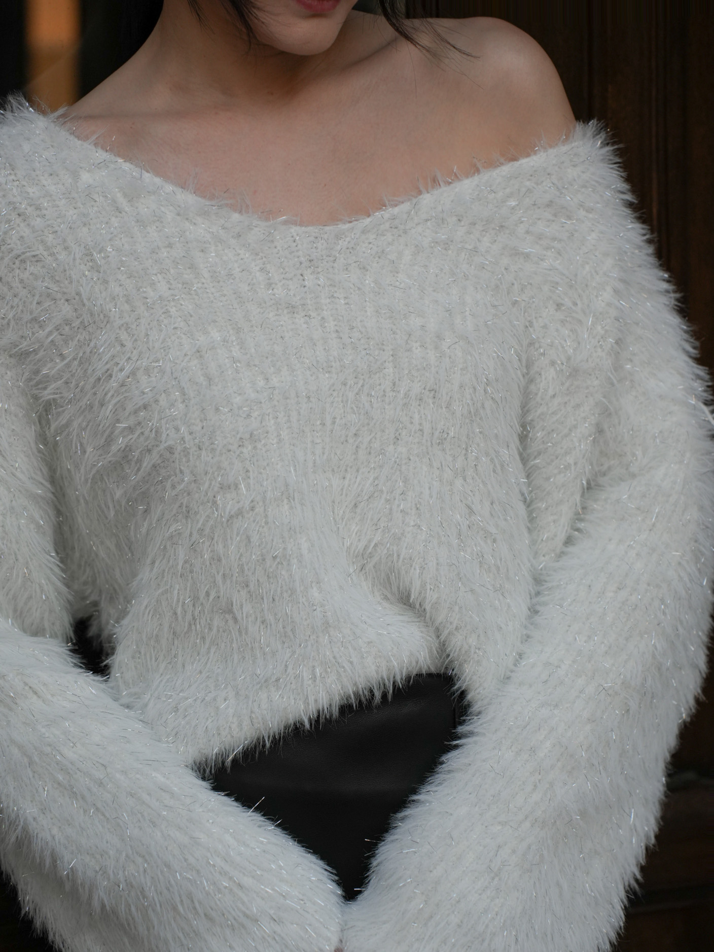 寬鬆落肩 / 大V領可穿斜肩&一字領 / 混銀蔥細節(不刺膚) / 柔軟水貂毛針織