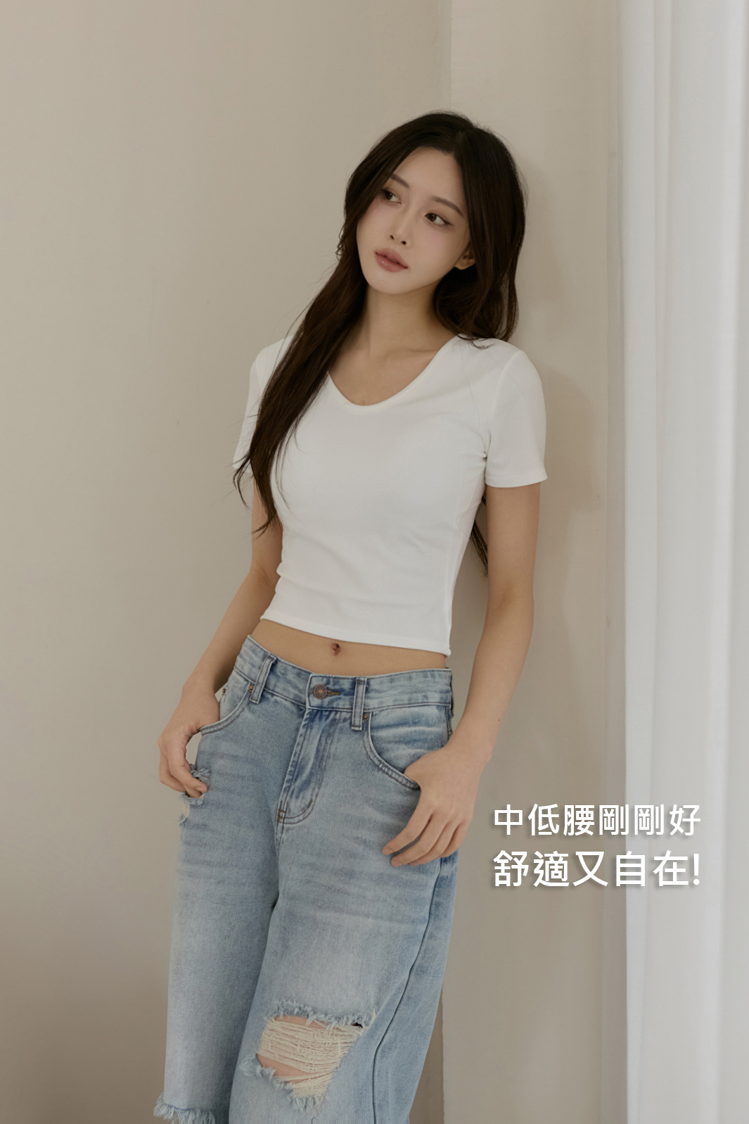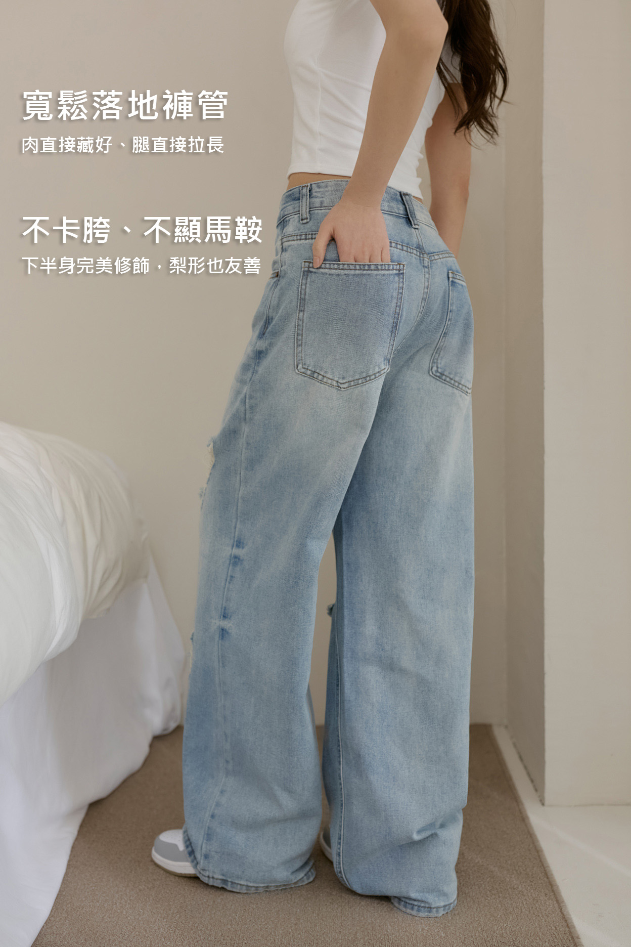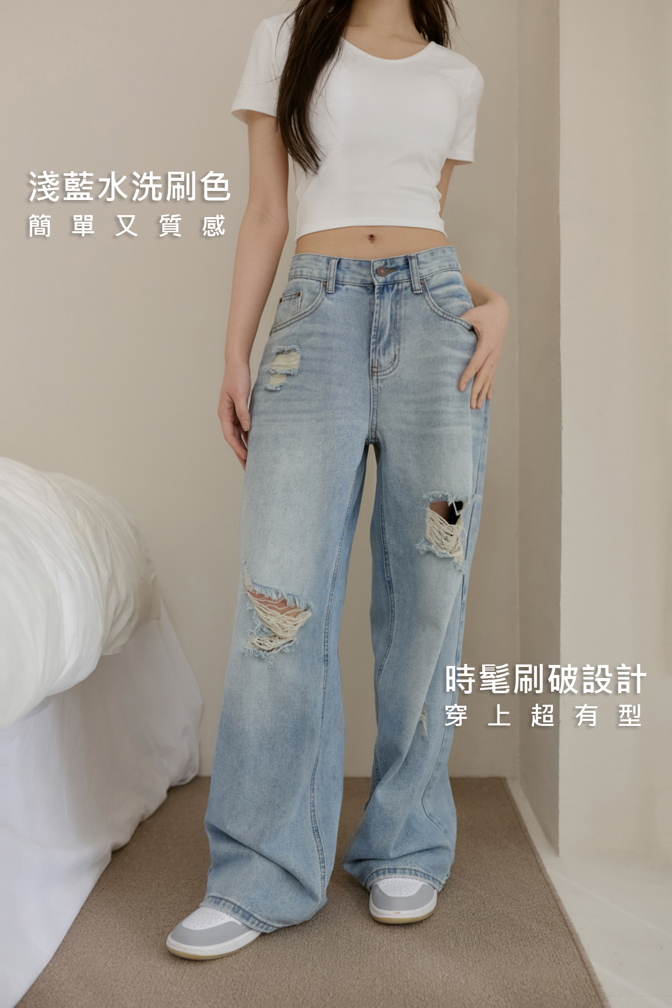 中低腰 / 寬褲版型 / 拉鍊及扭釦 / 兩側口袋 / 刷破設計 / 水洗刷色