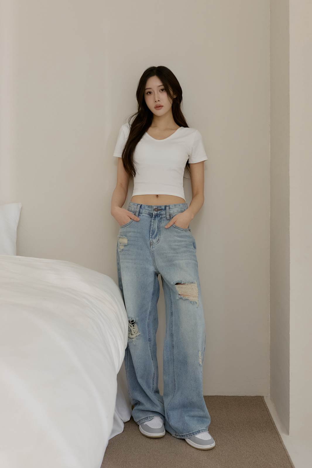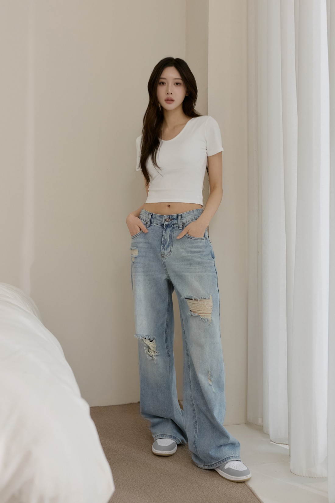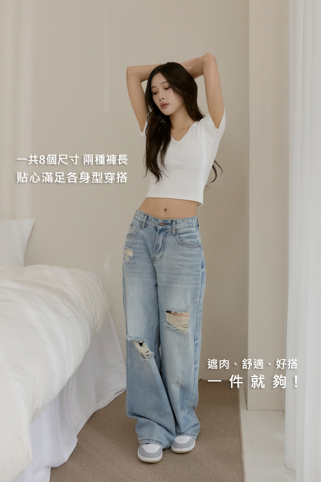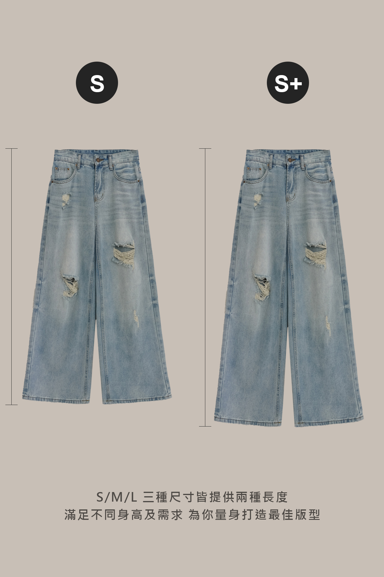 中低腰 / 寬褲版型 / 拉鍊及扭釦 / 兩側口袋 / 刷破設計 / 水洗刷色