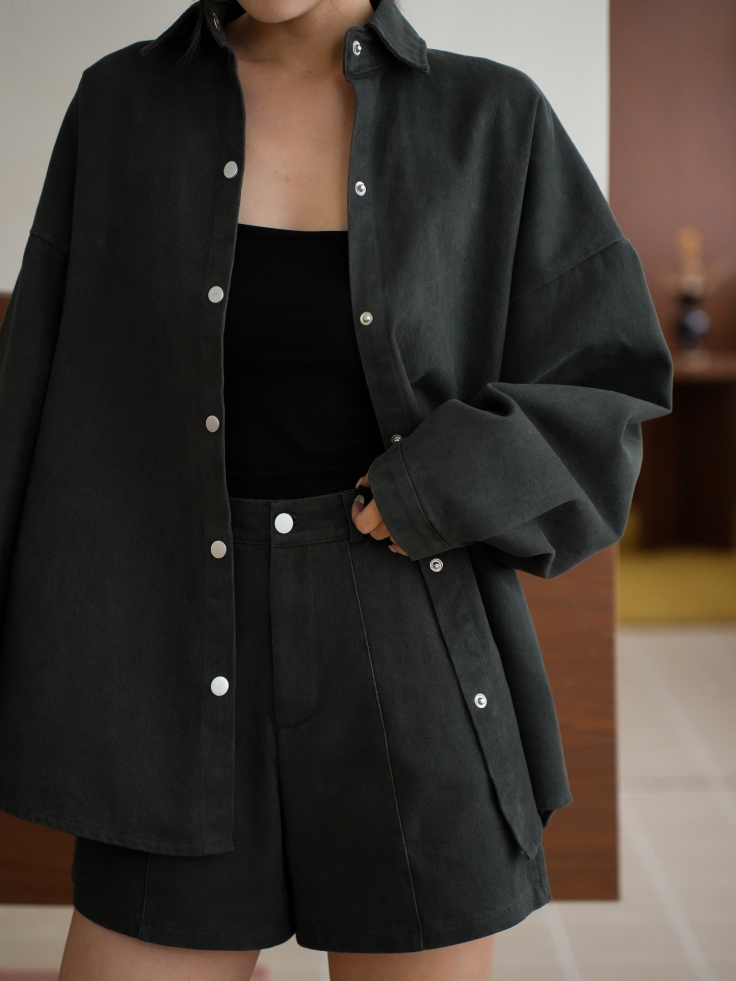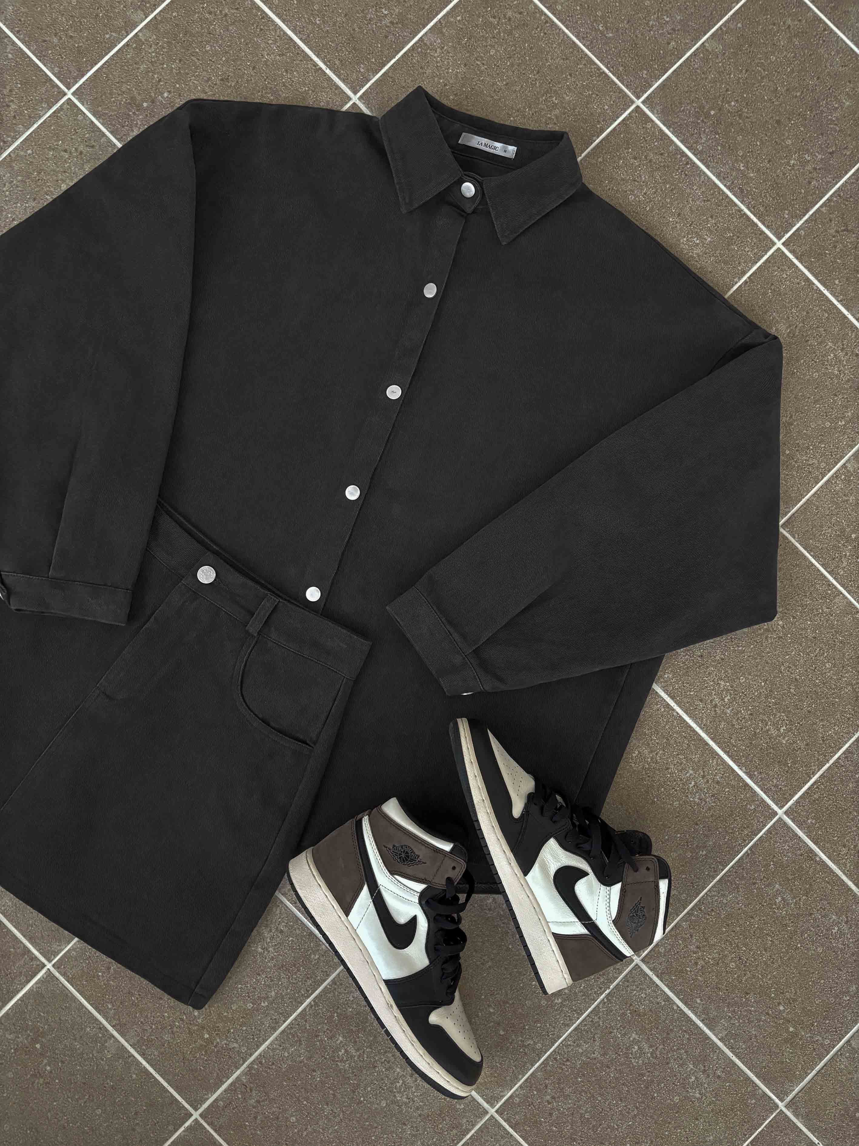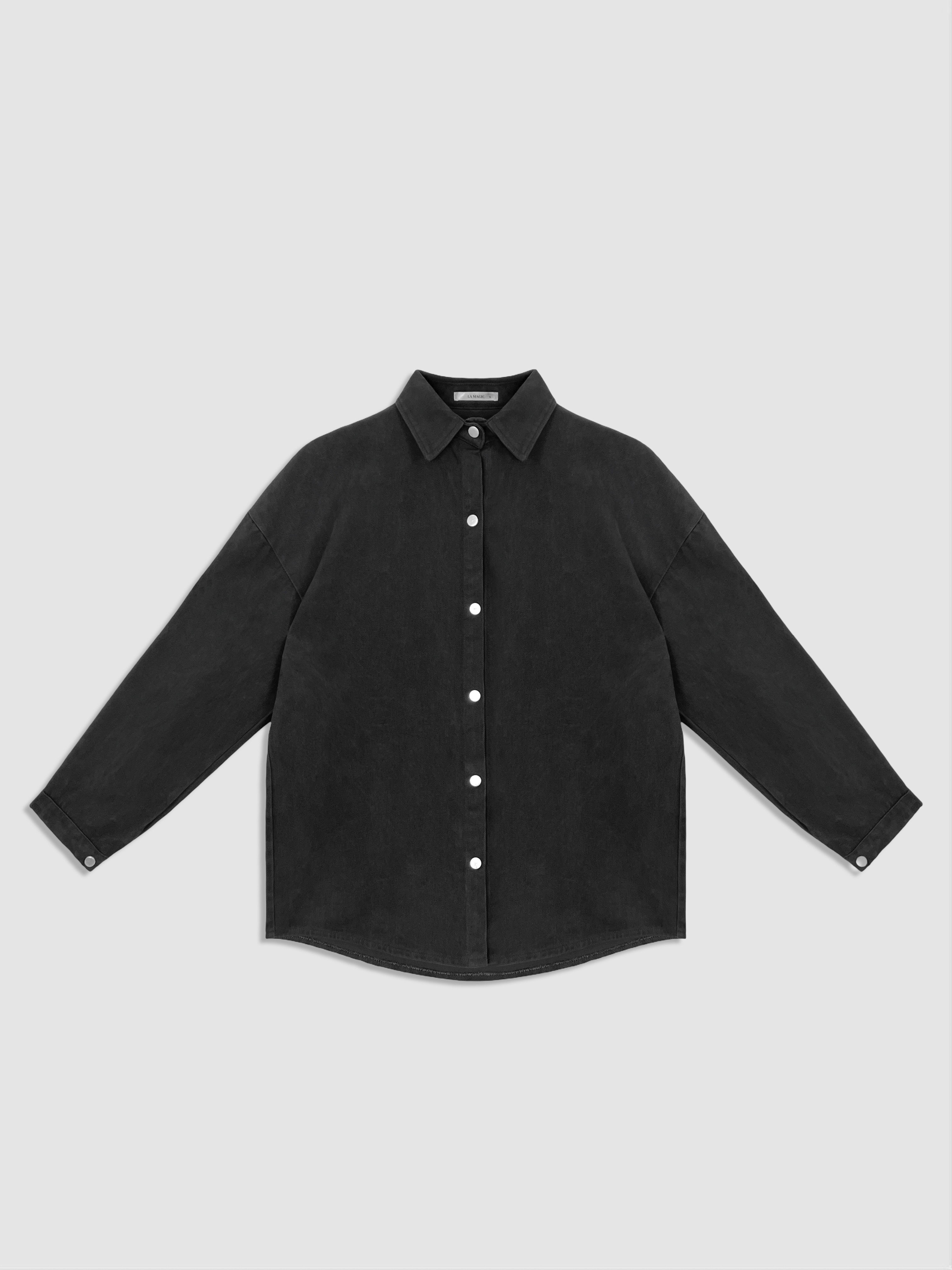 寬鬆落肩版型 / 排釦壓釦設計 / 挺版水洗牛仔