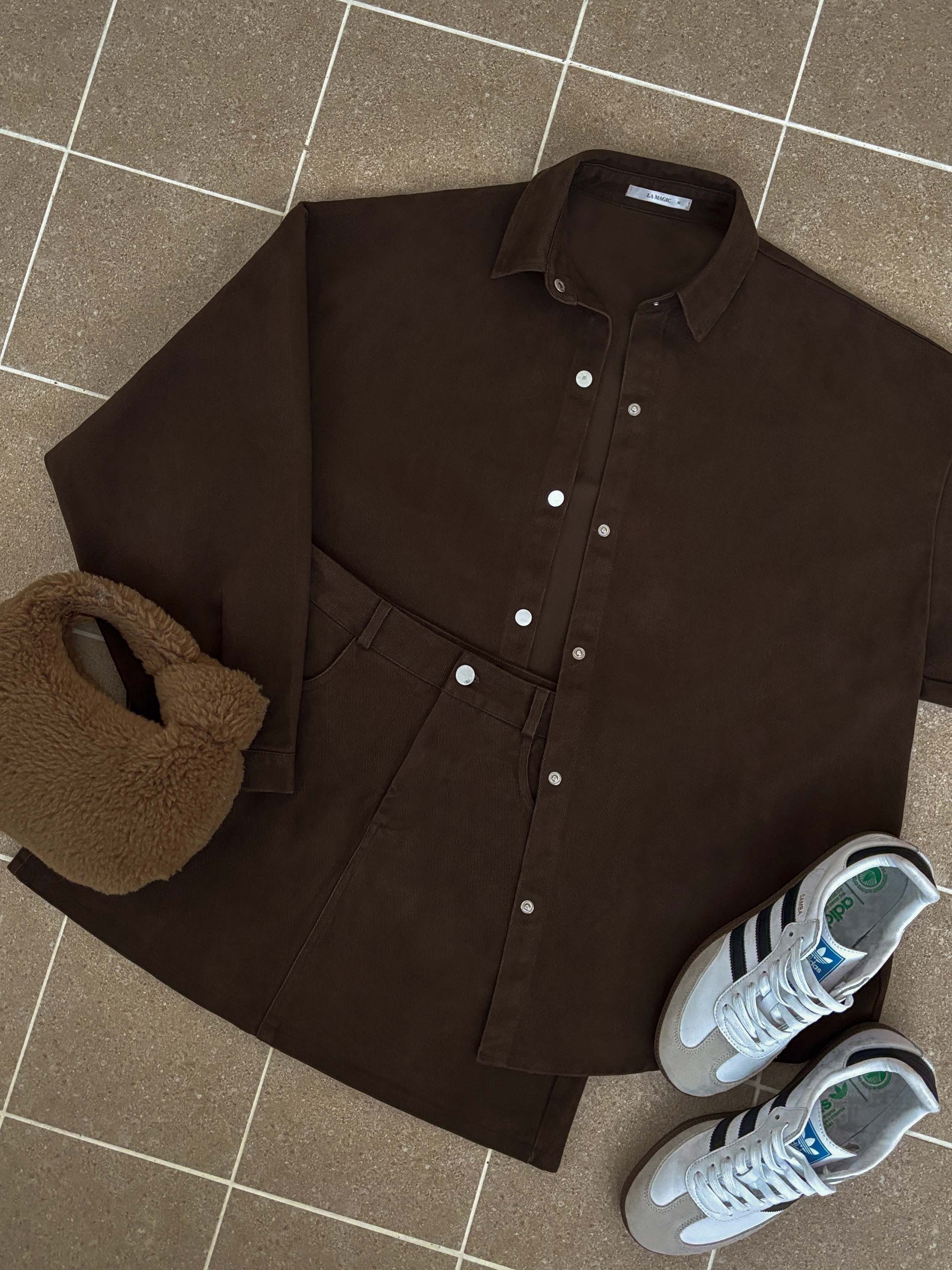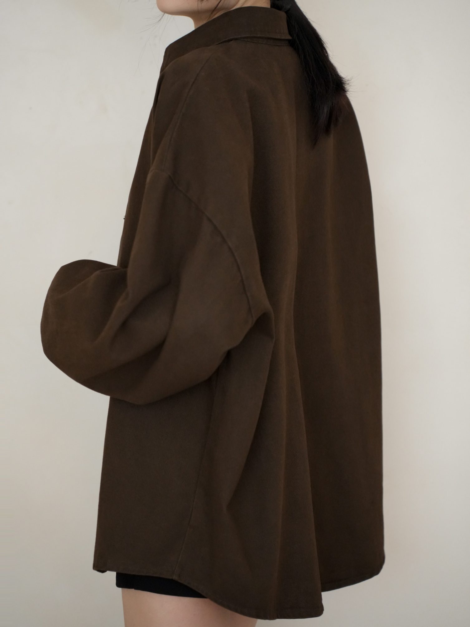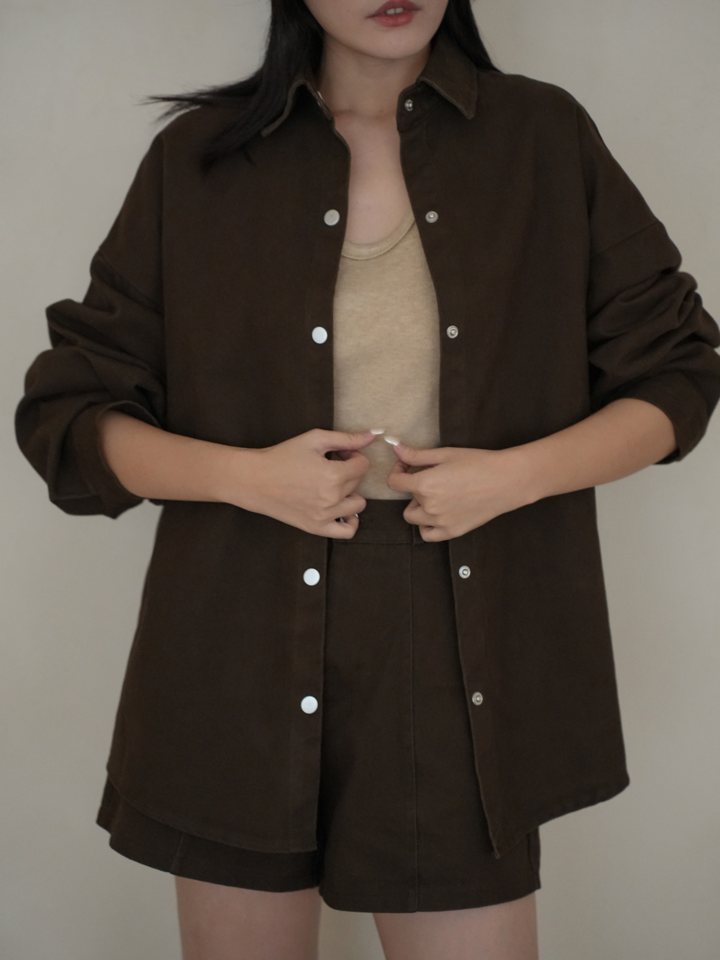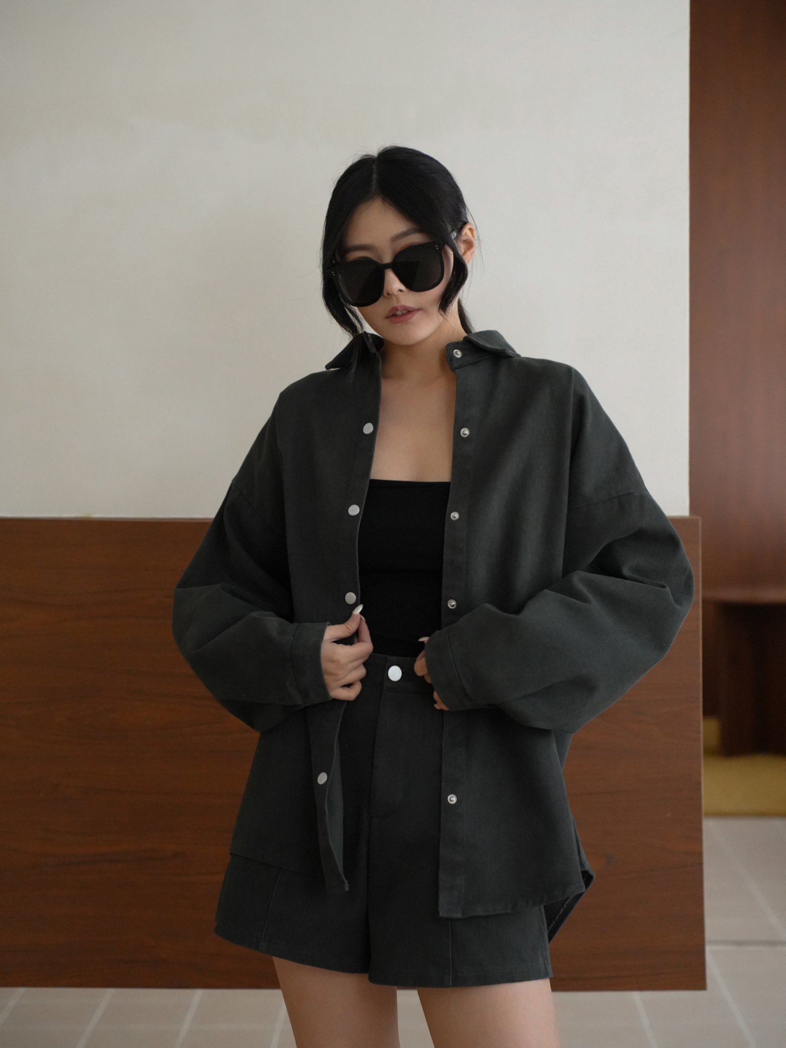 寬鬆落肩版型 / 排釦壓釦設計 / 挺版水洗牛仔
