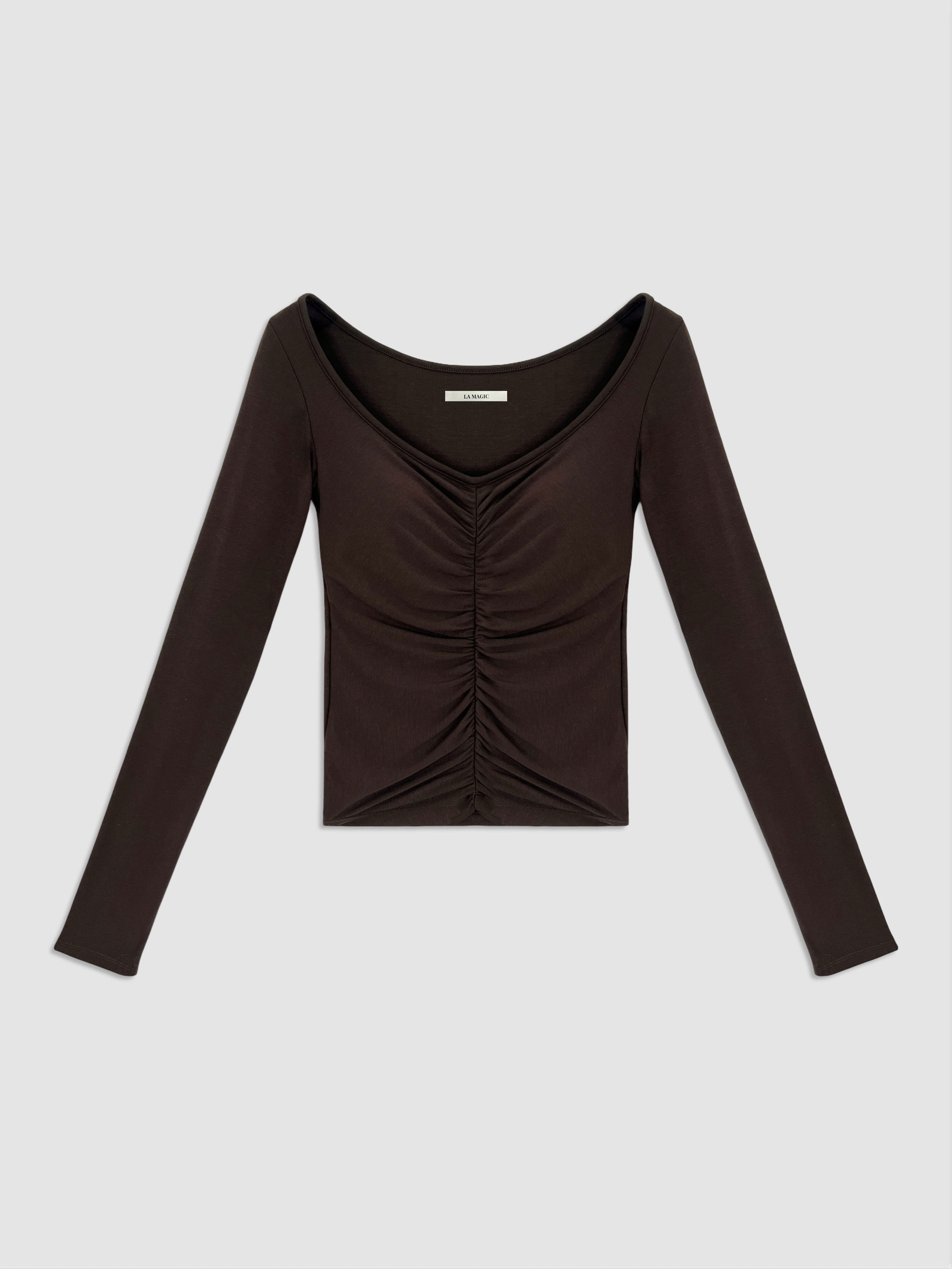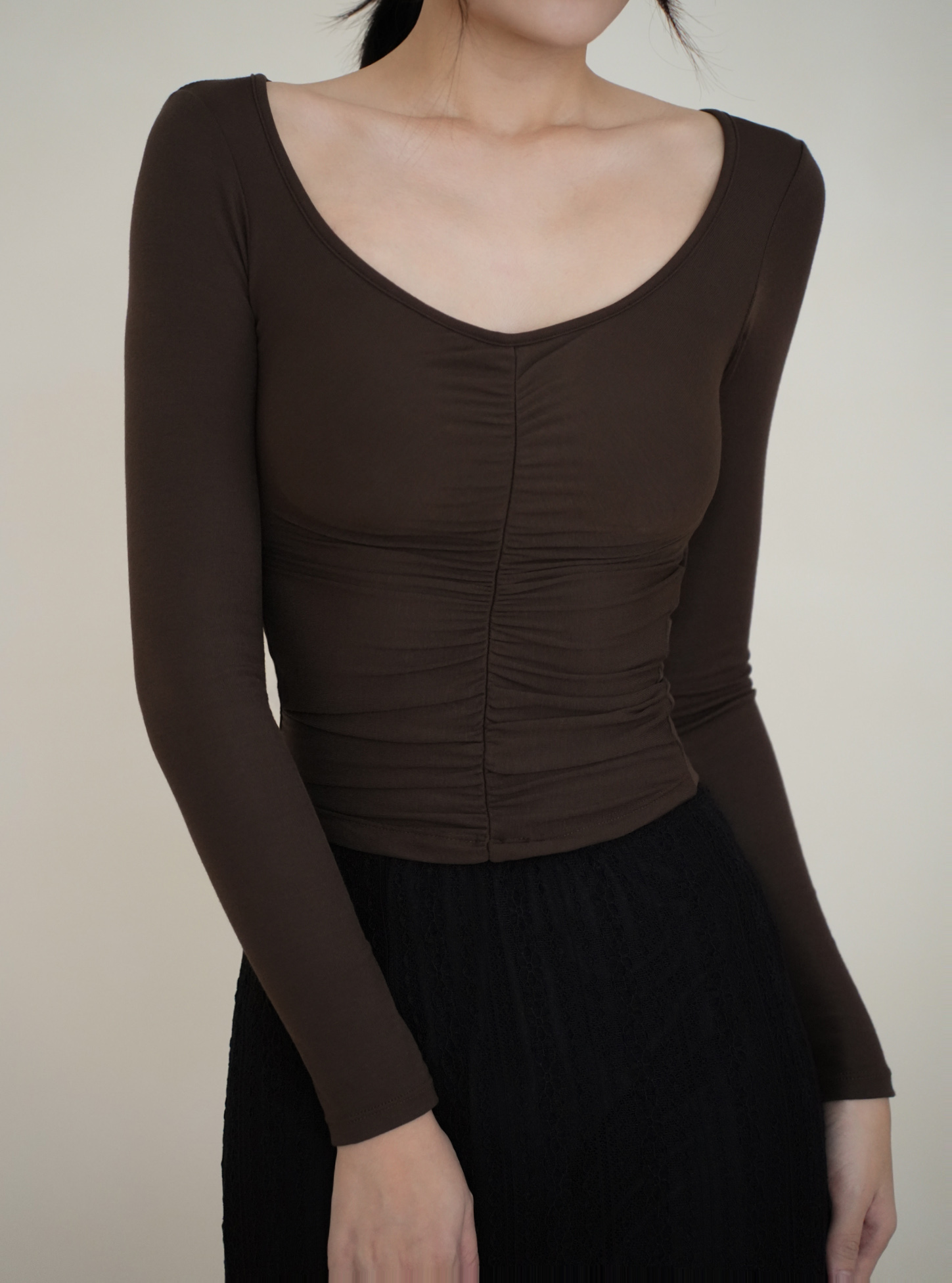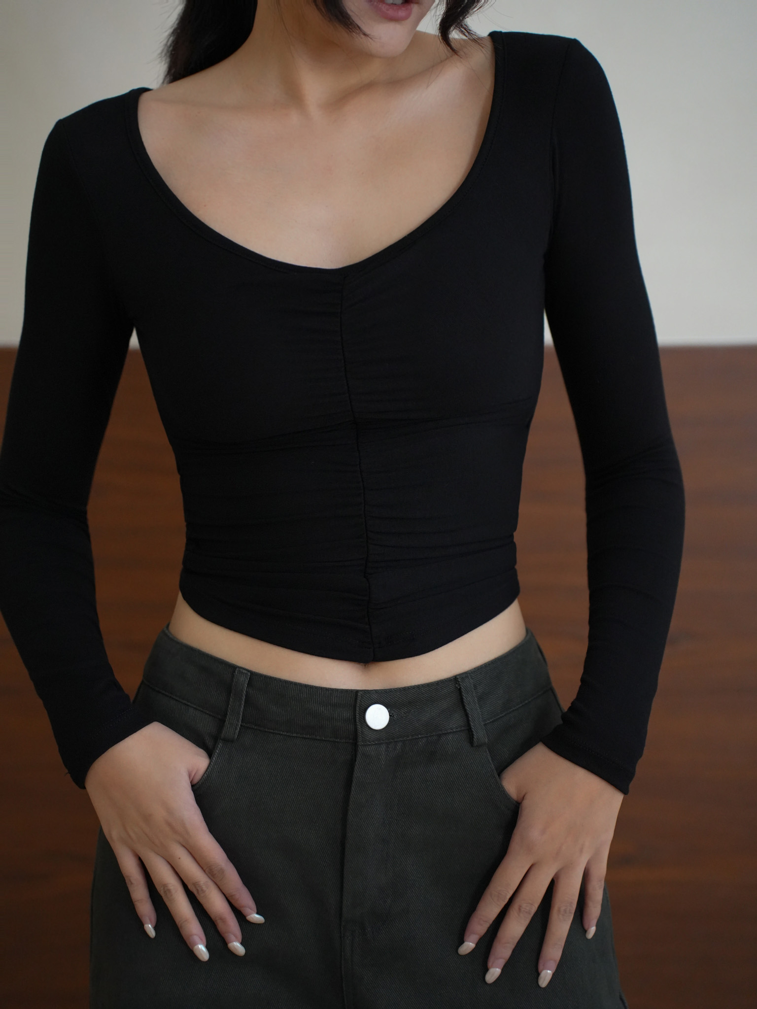 前抓皺顯瘦設計,搭配V領剪裁