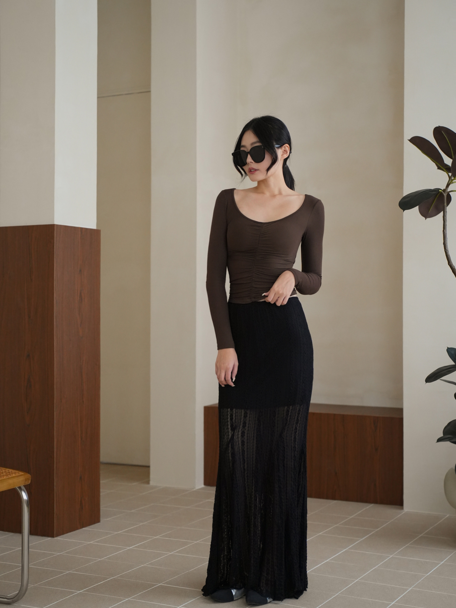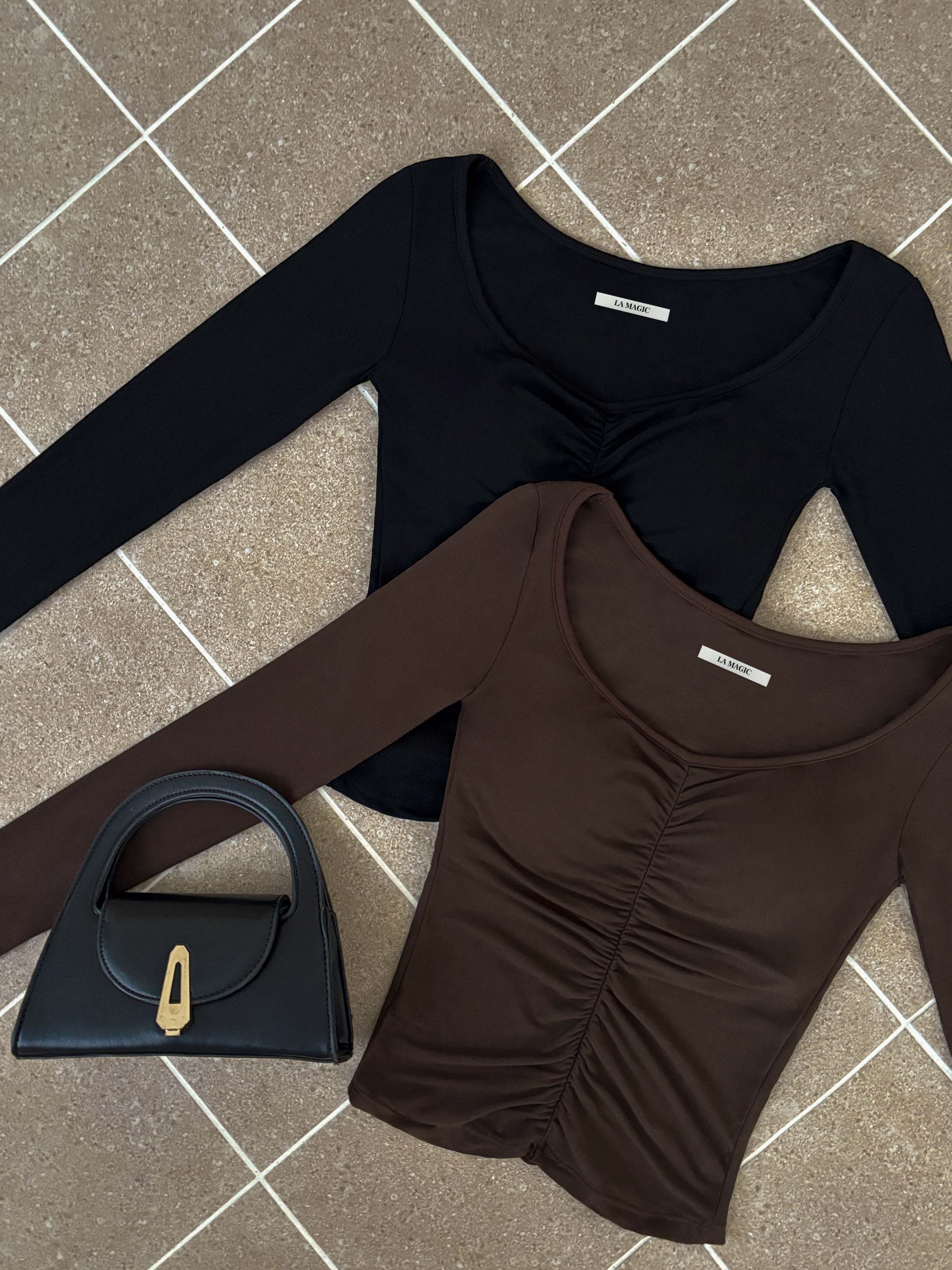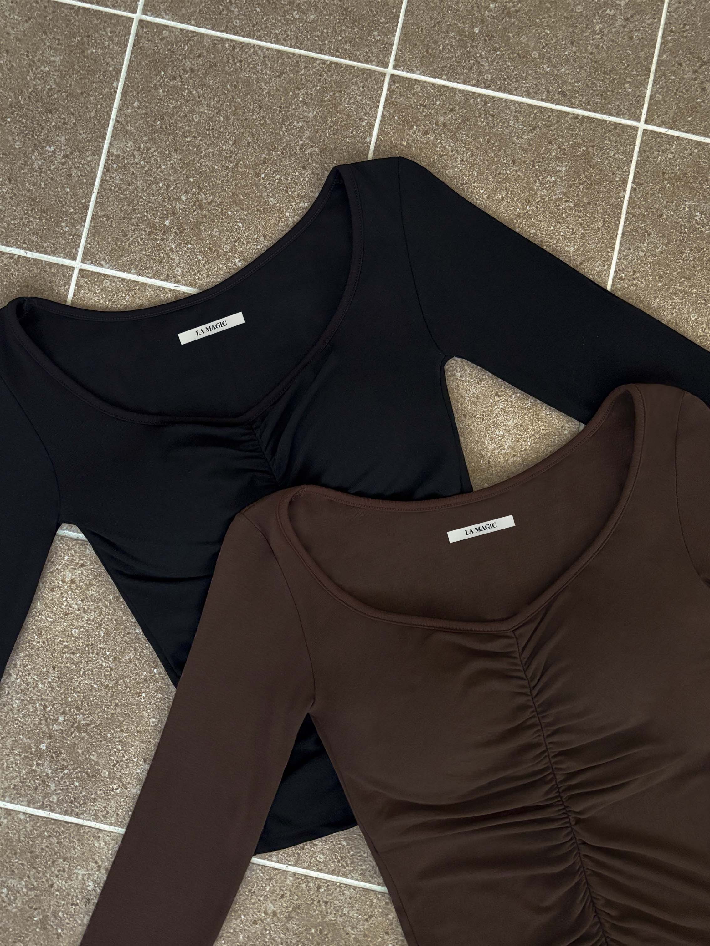 前抓皺顯瘦設計,搭配V領剪裁
