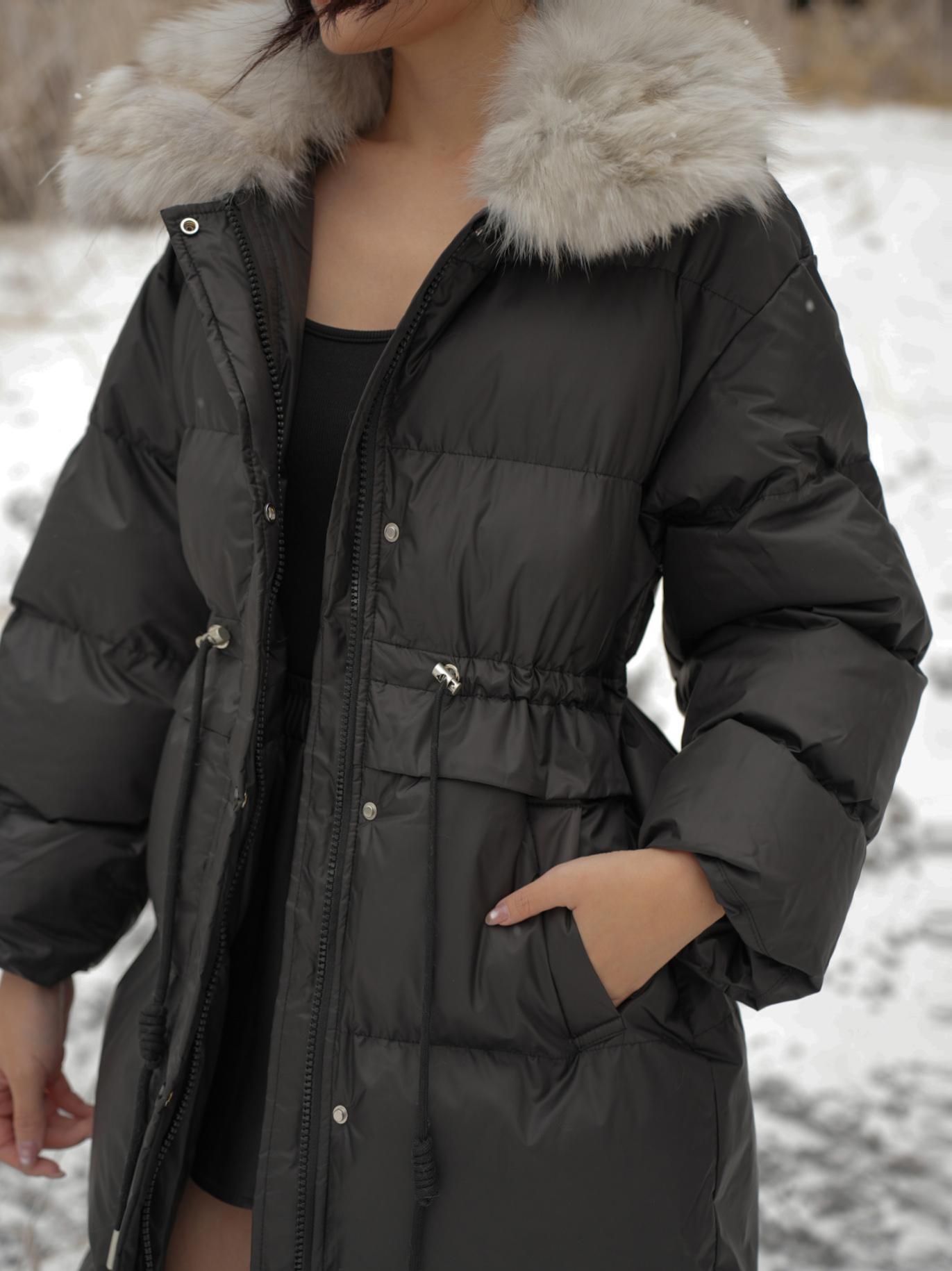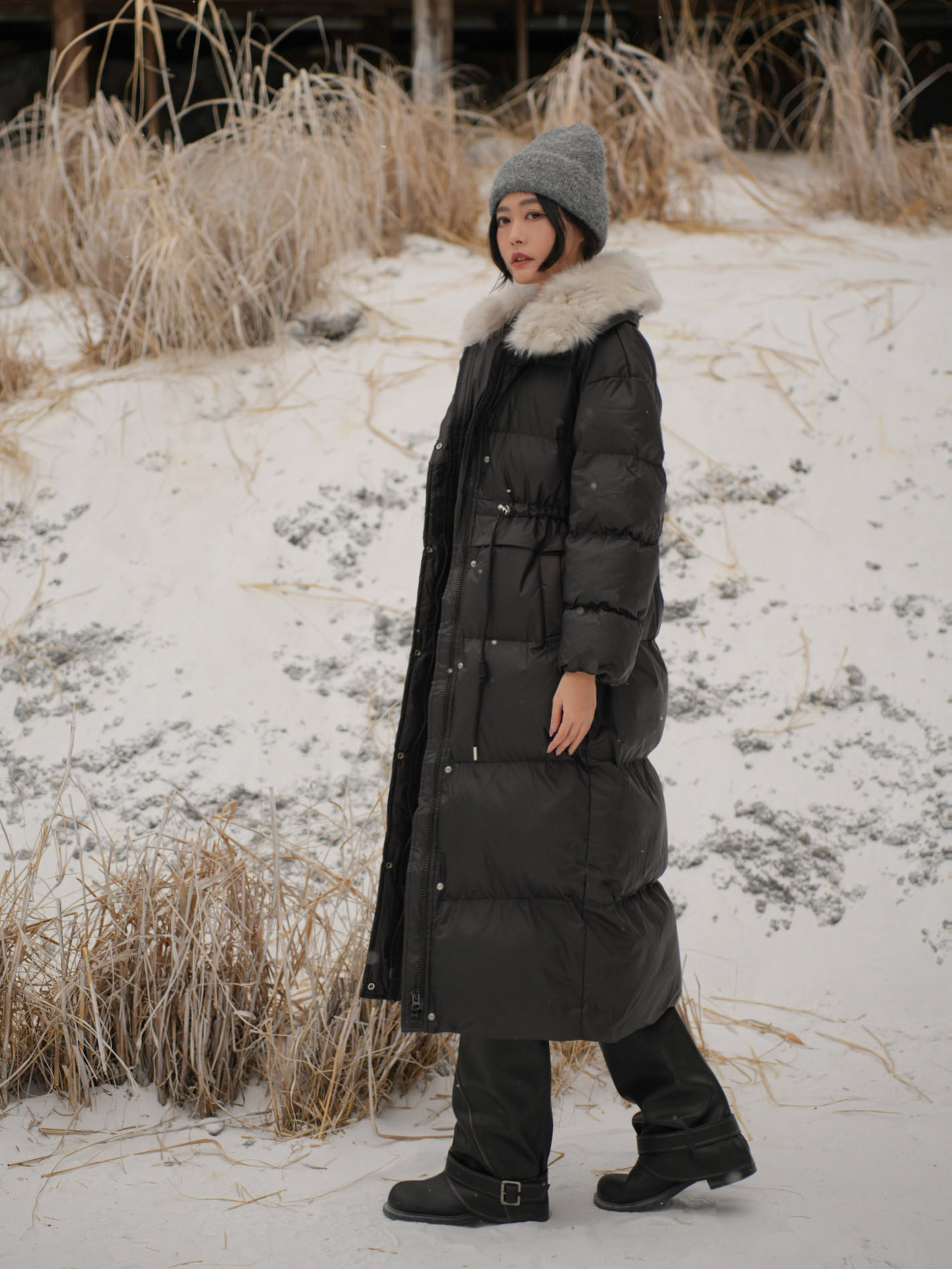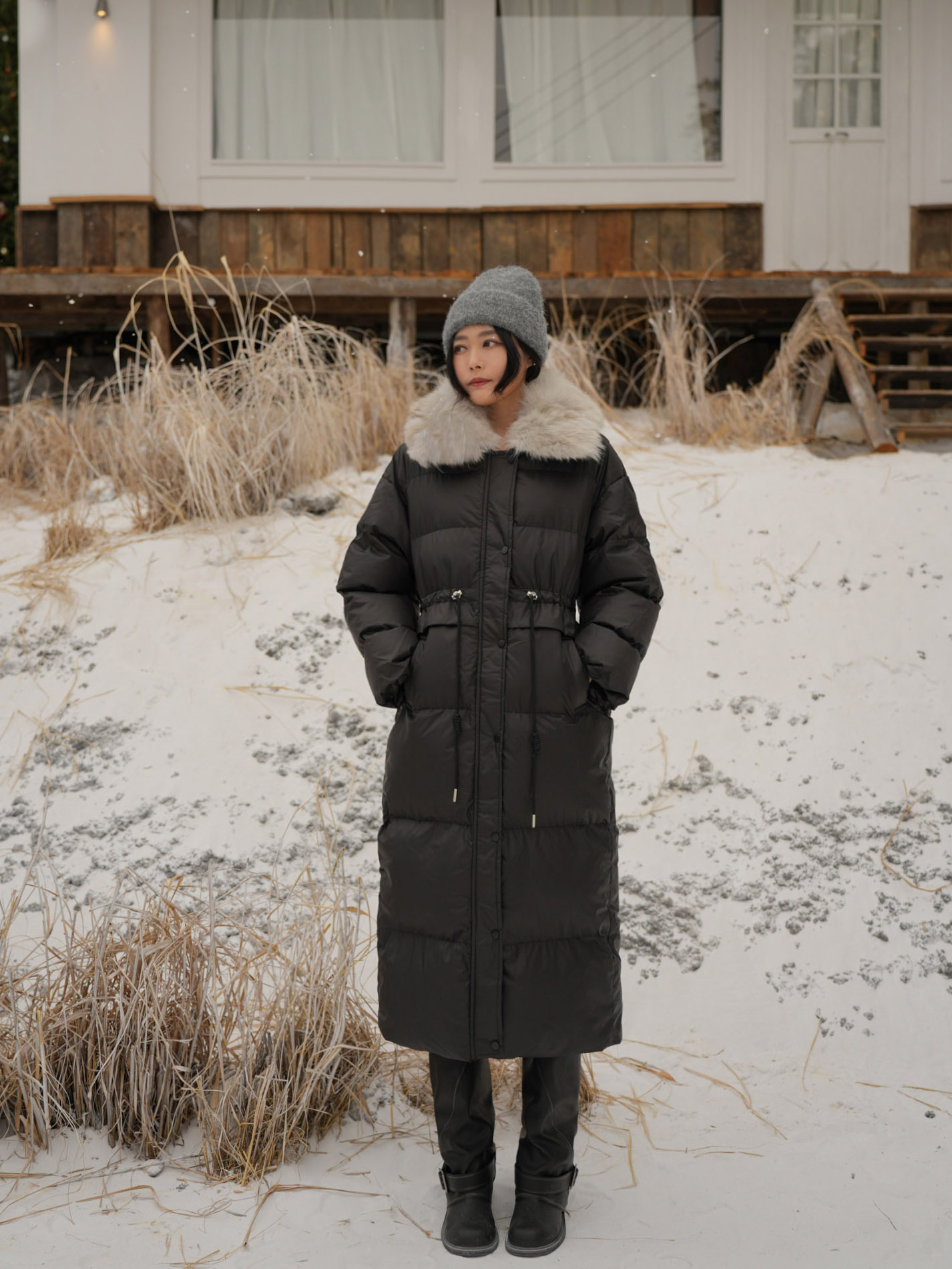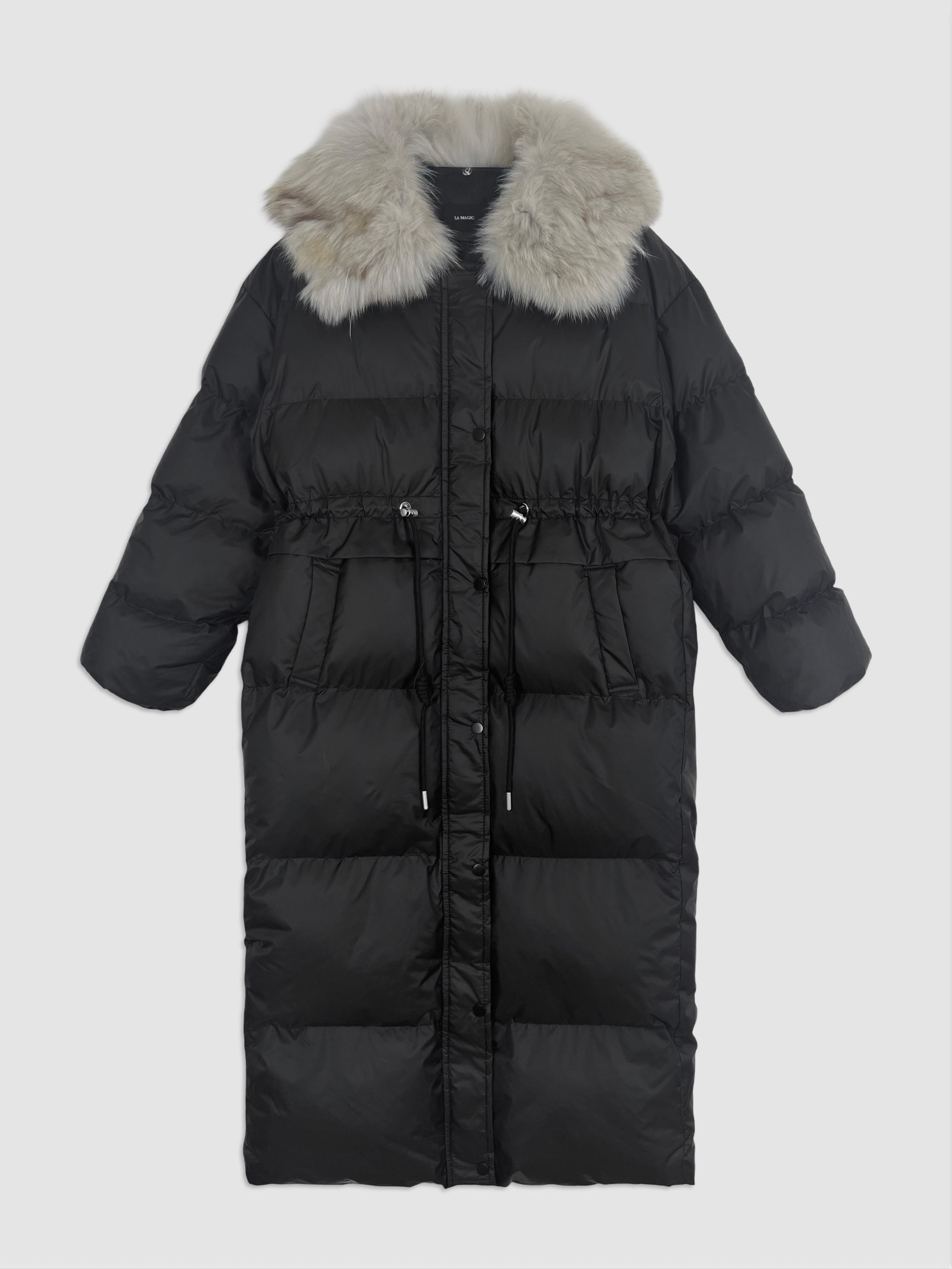 長版大衣 / 保暖鋪棉 / 拉鍊及暗釦 / 可拆式毛領 / 腰部可調節抽繩