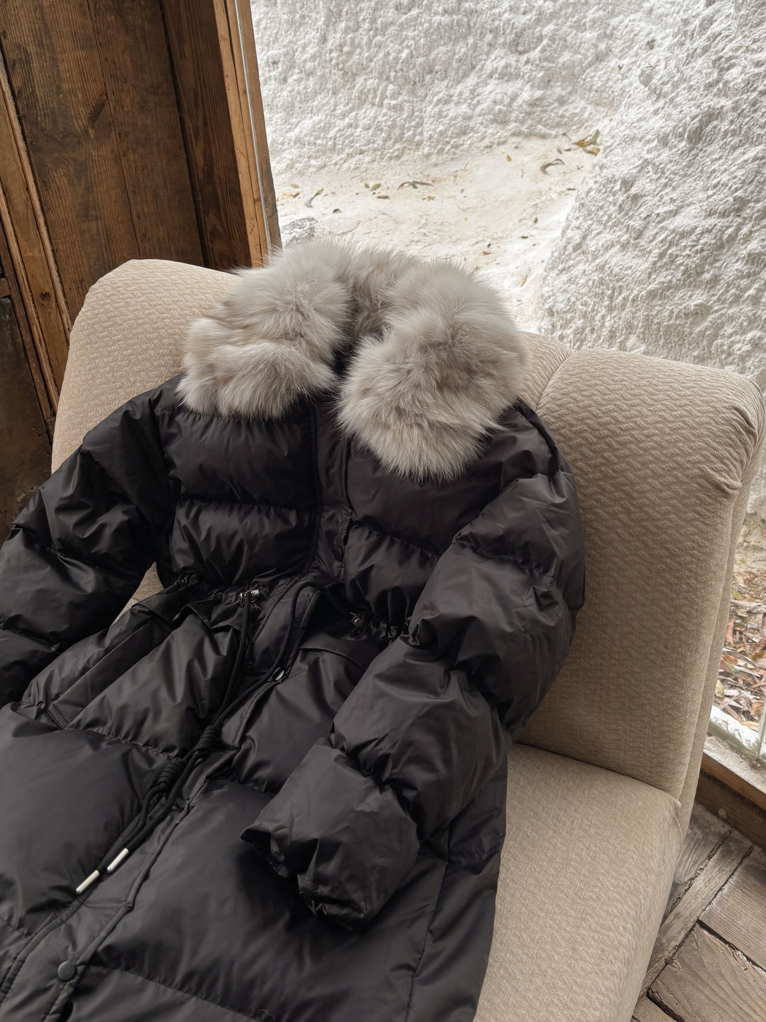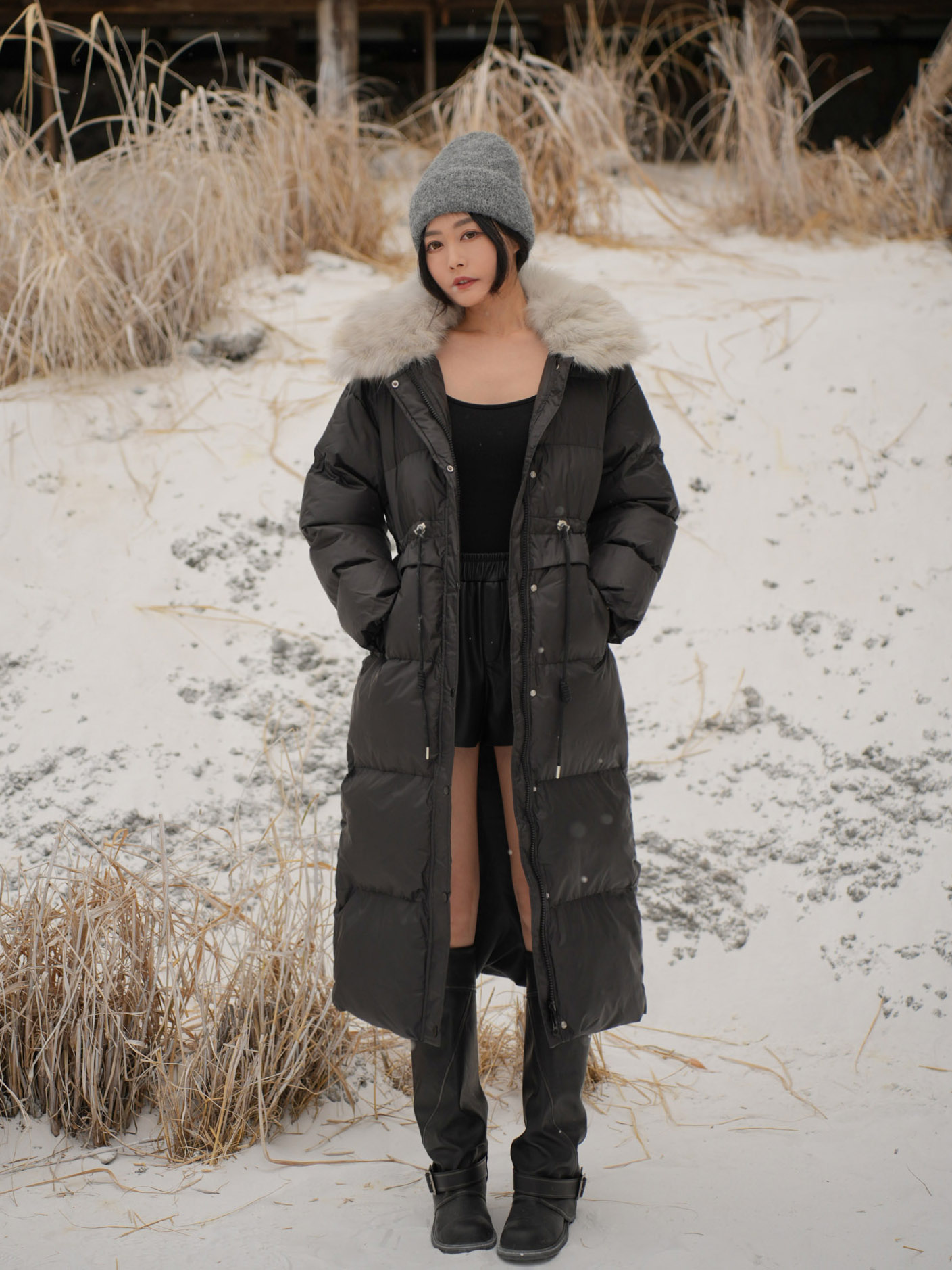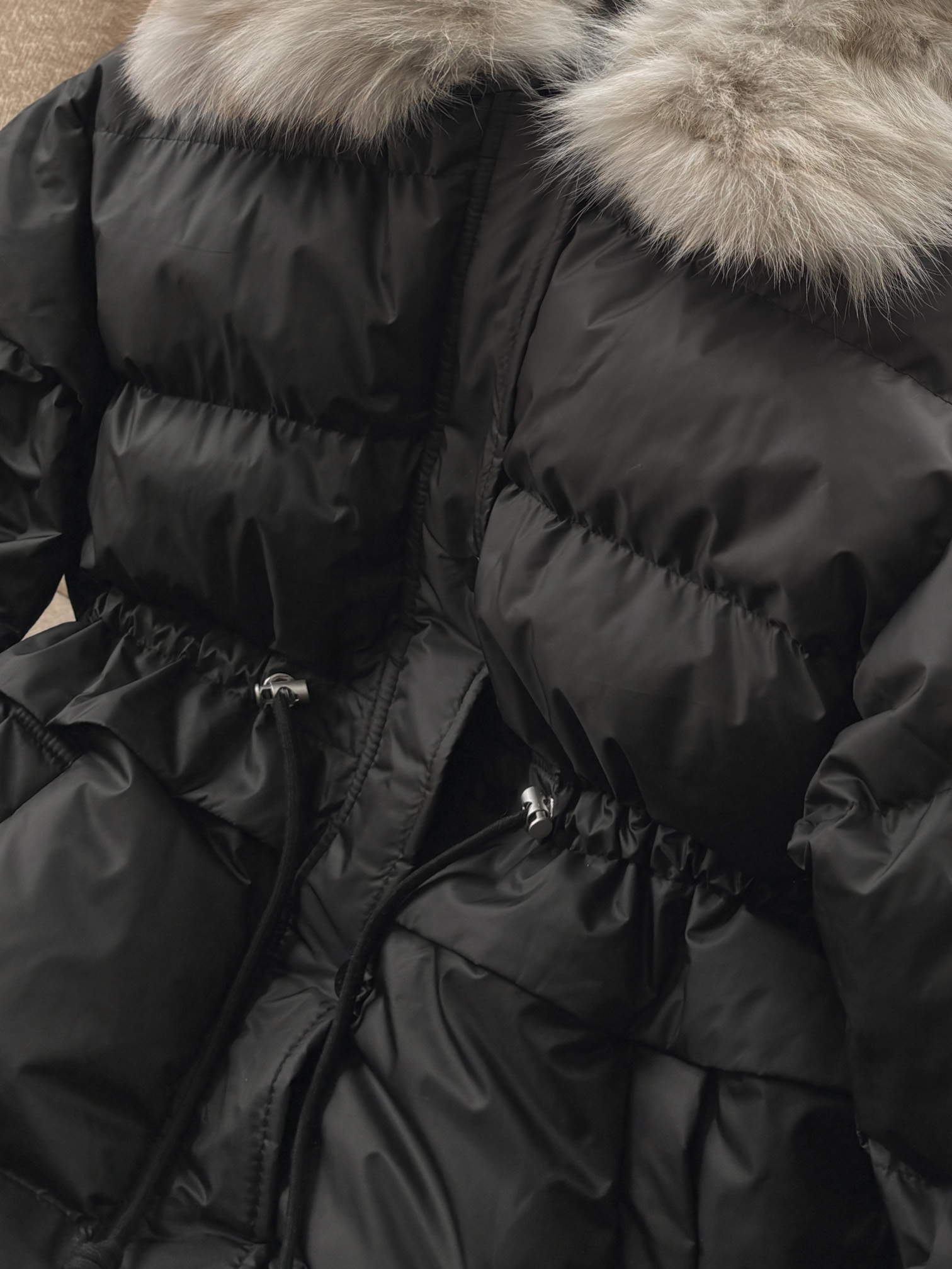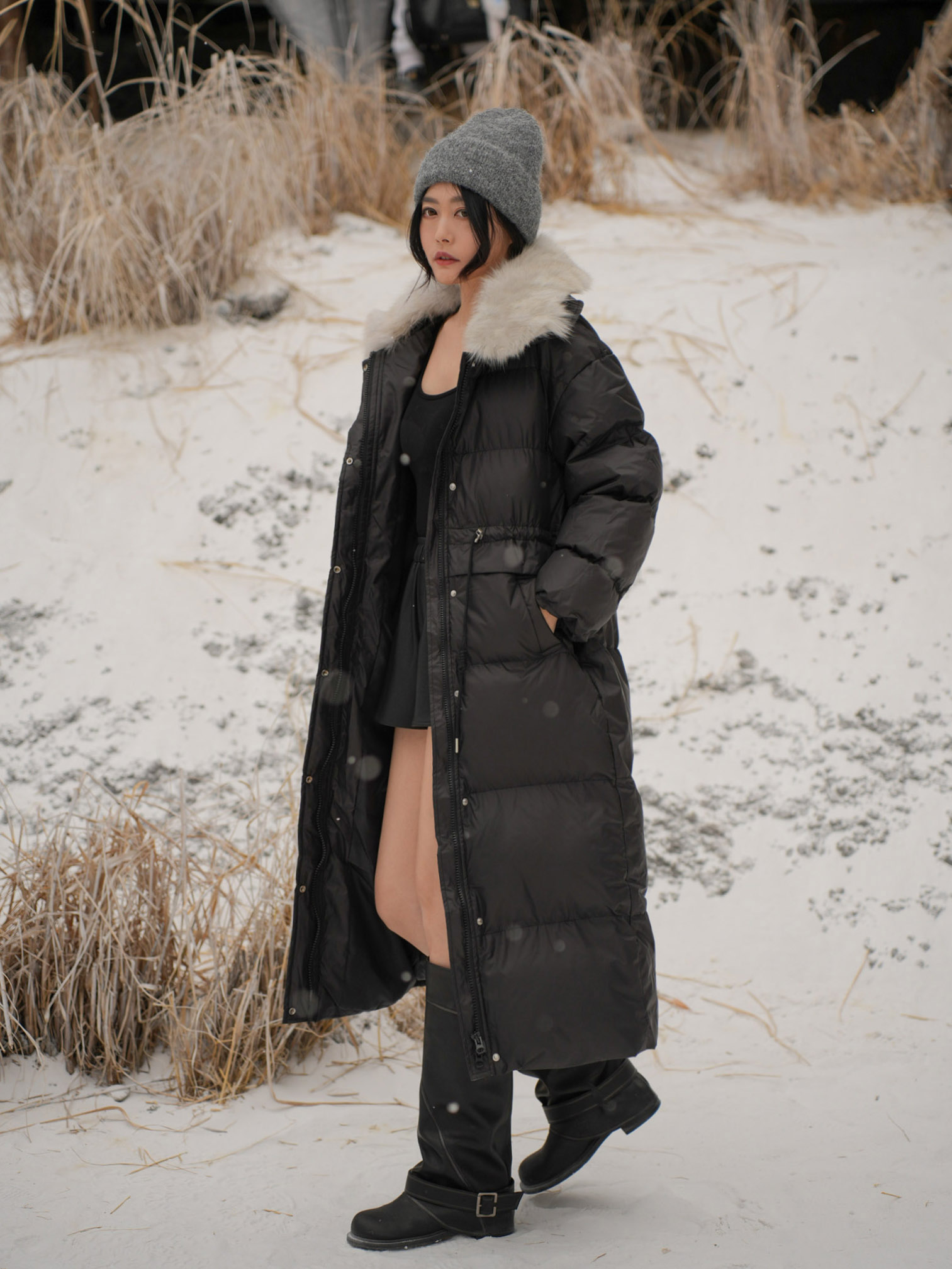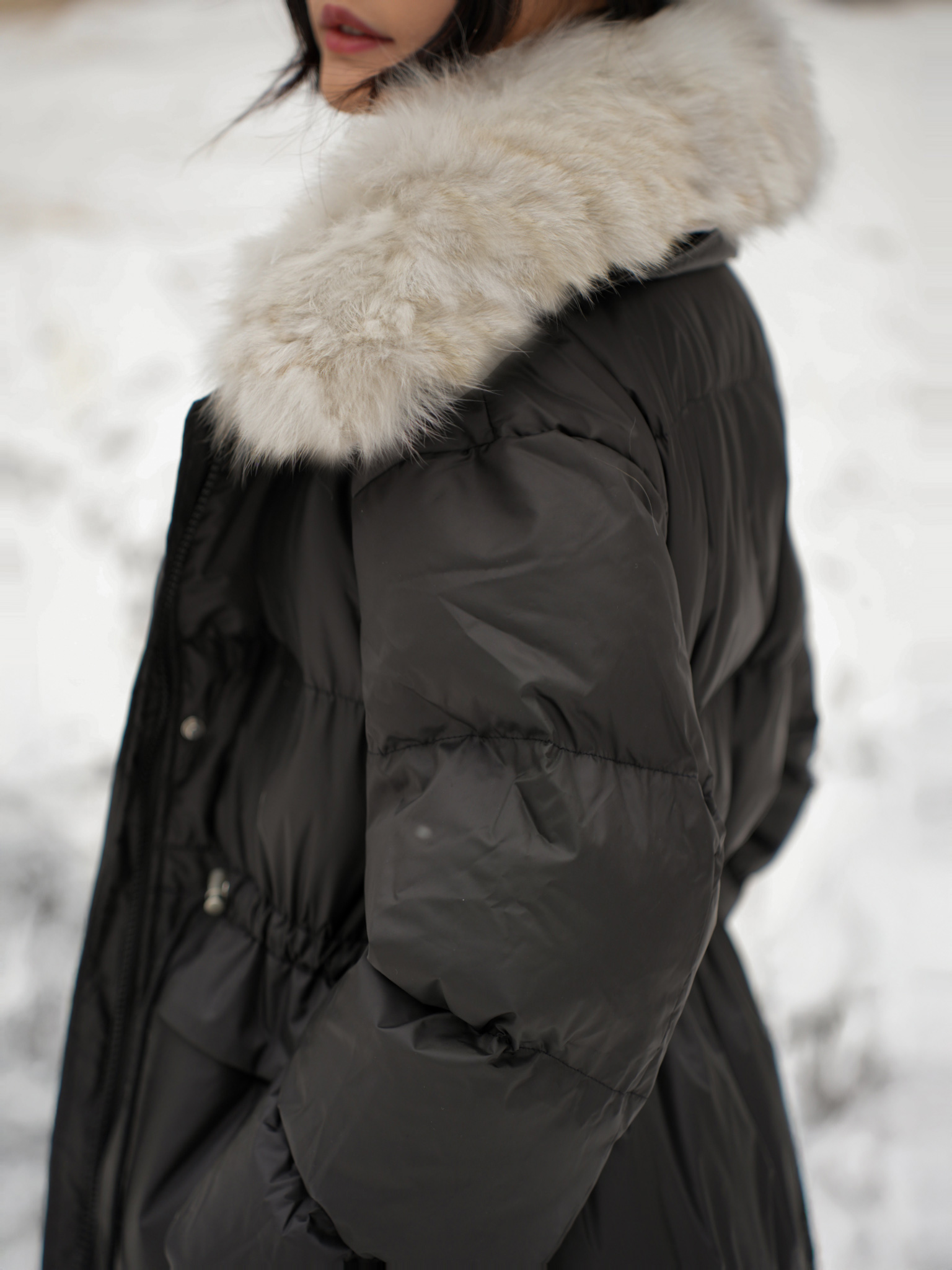 長版大衣 / 保暖鋪棉 / 拉鍊及暗釦 / 可拆式毛領 / 腰部可調節抽繩
