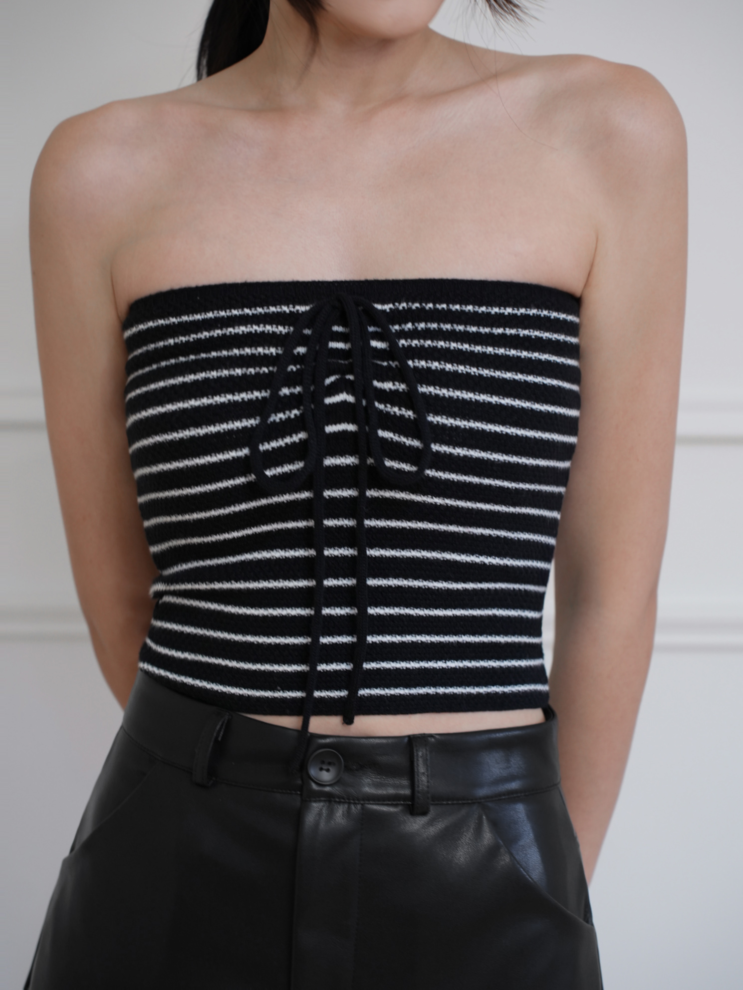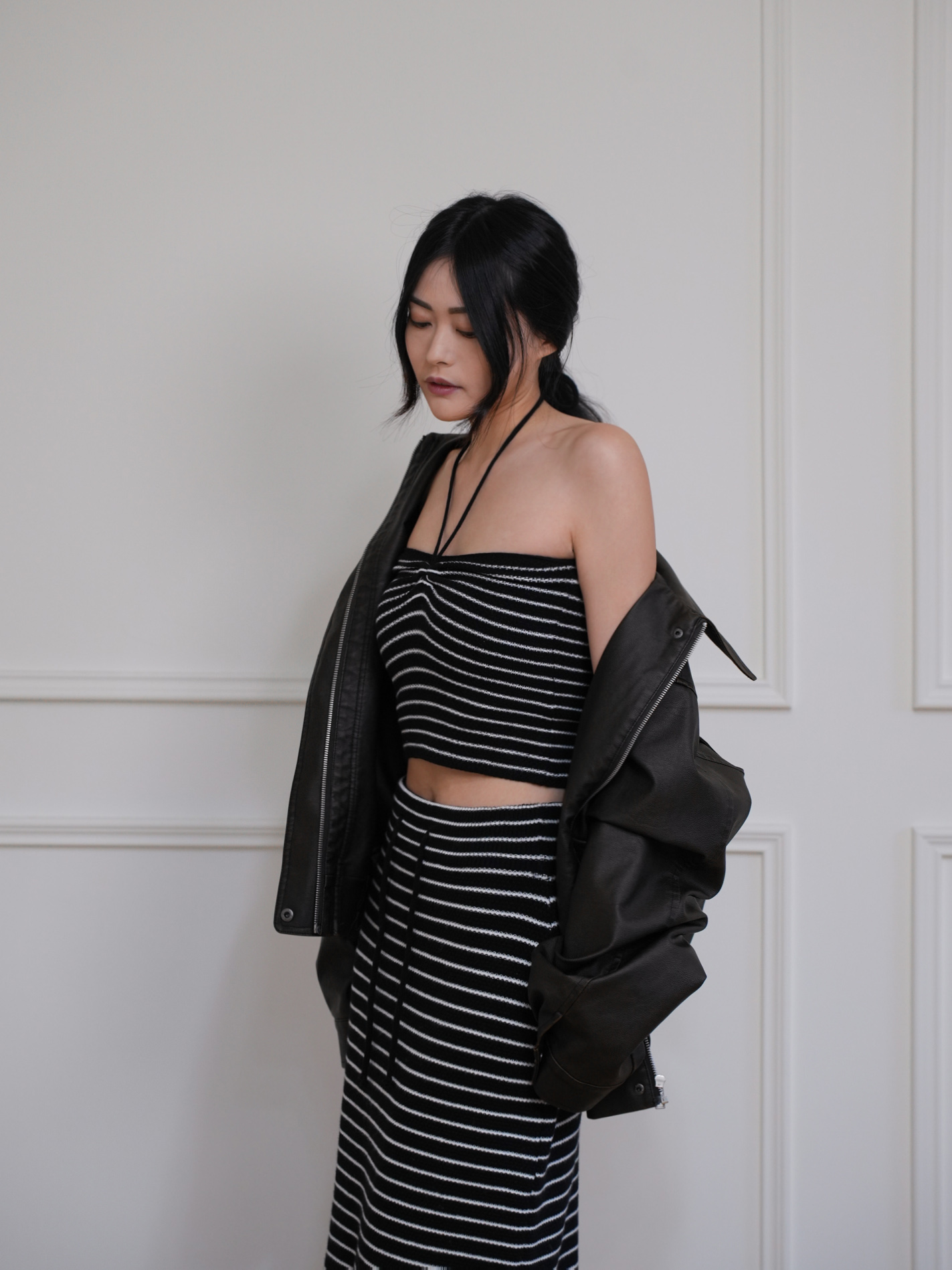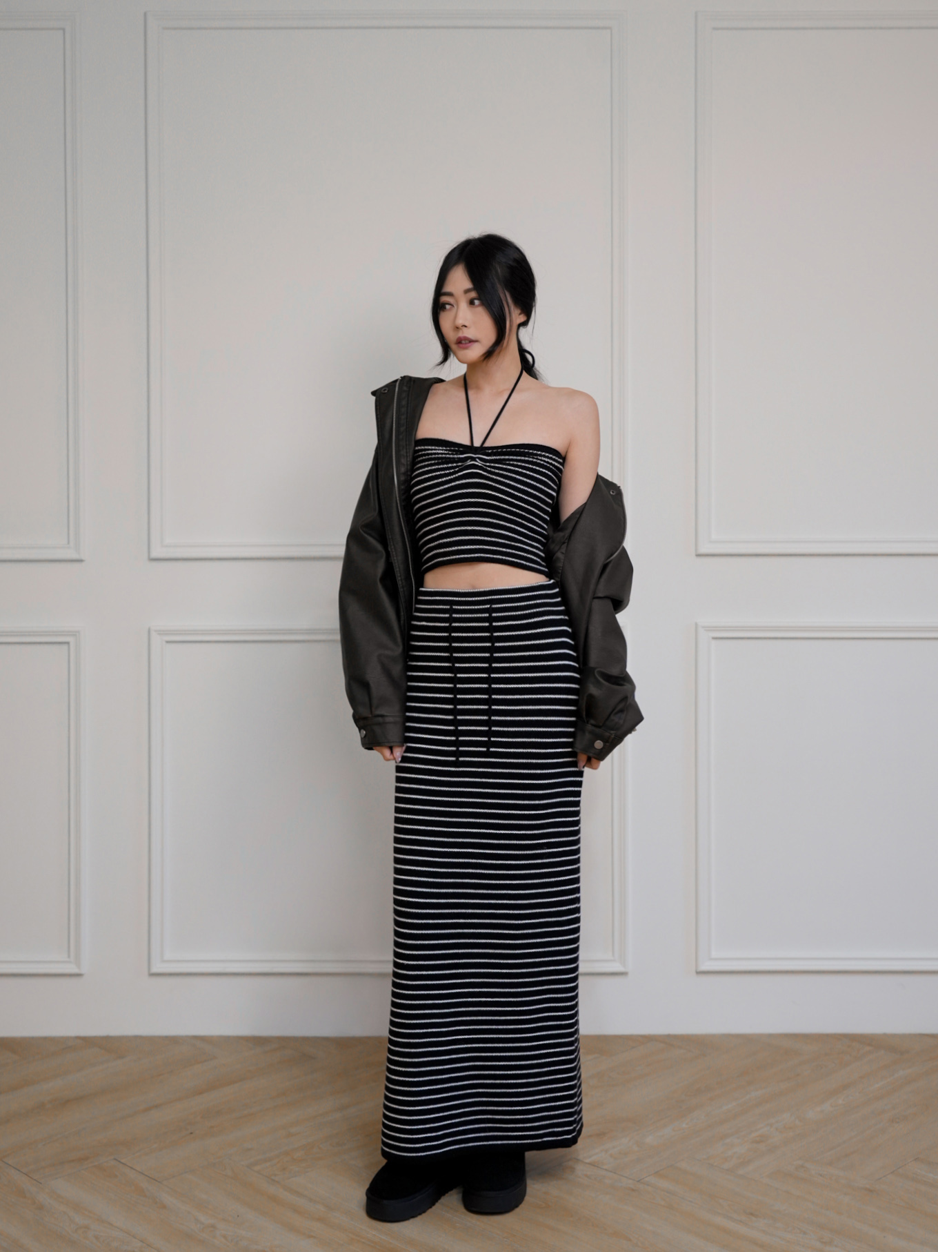 平口 / 胸前綁帶及繞脖兩穿 / 雙色條紋針織 / 整件有彈性