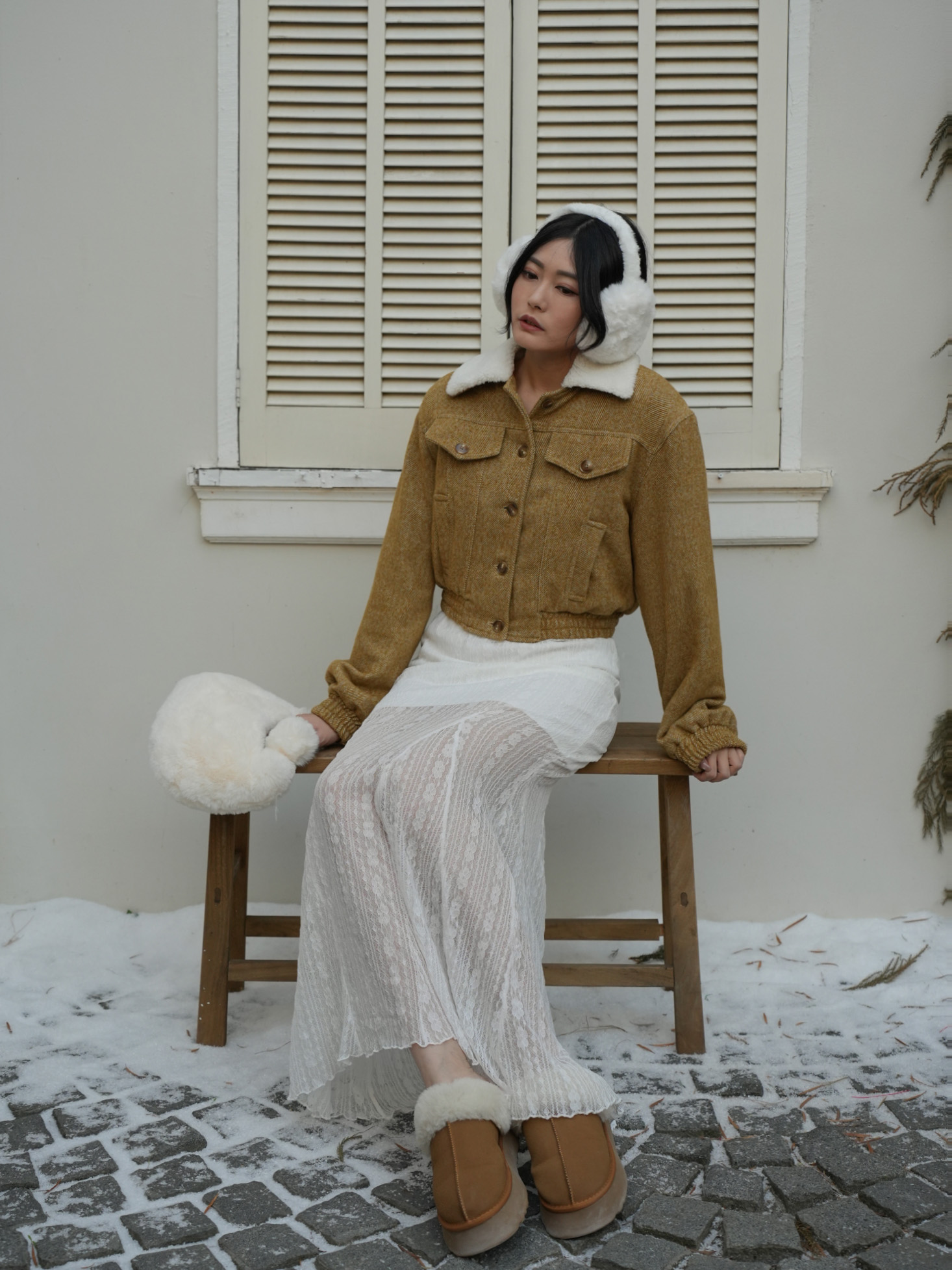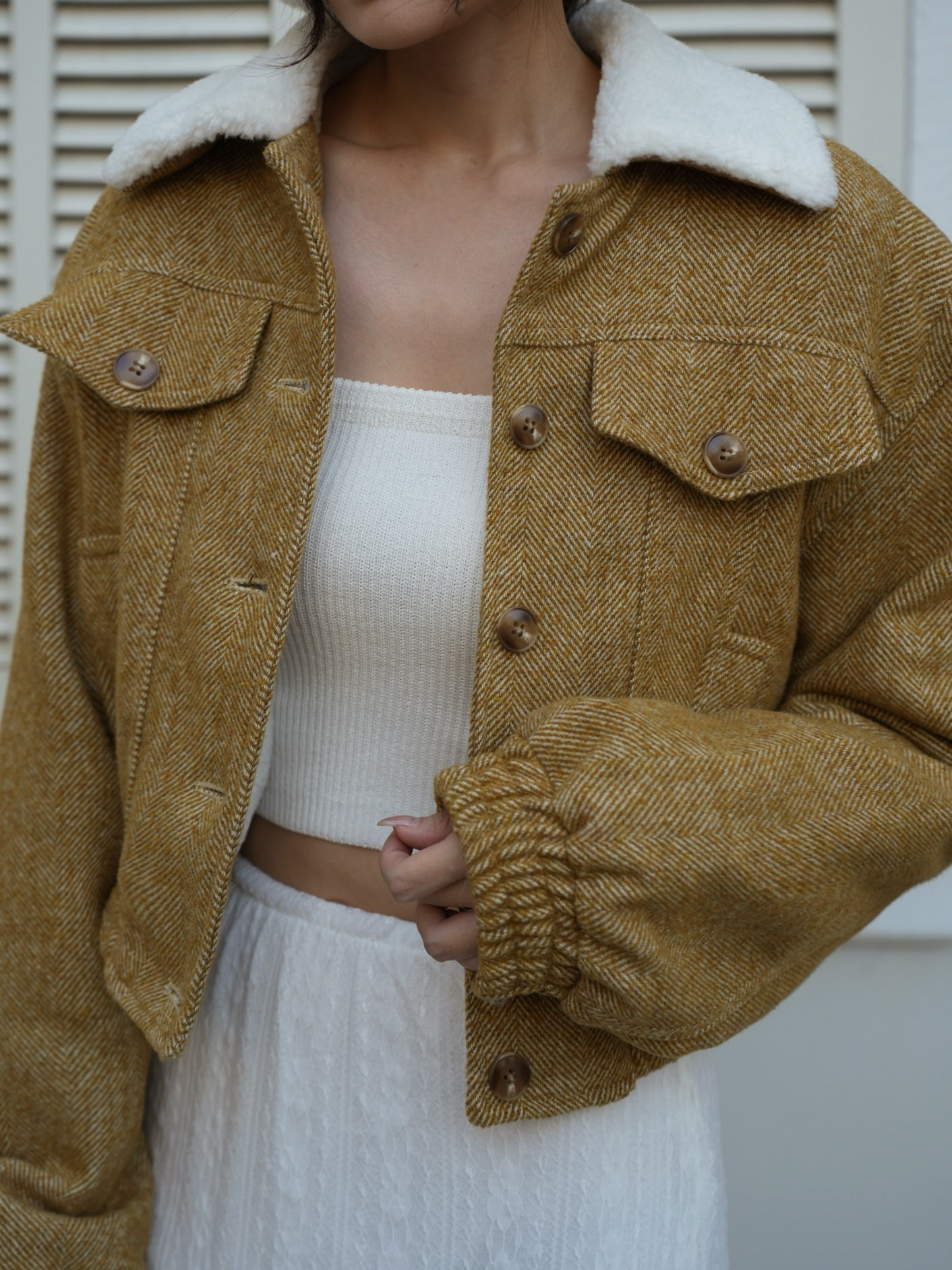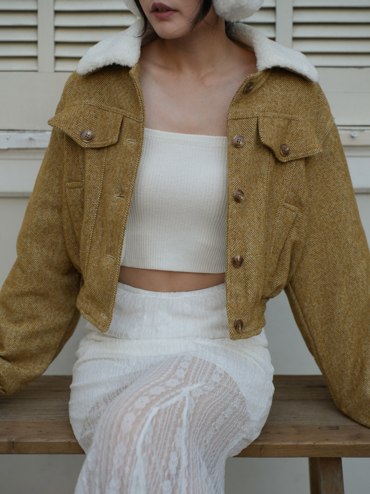 羊羔毛翻領 / 排釦設計 / 假口袋造型 / 微短版 / 保暖內刷毛