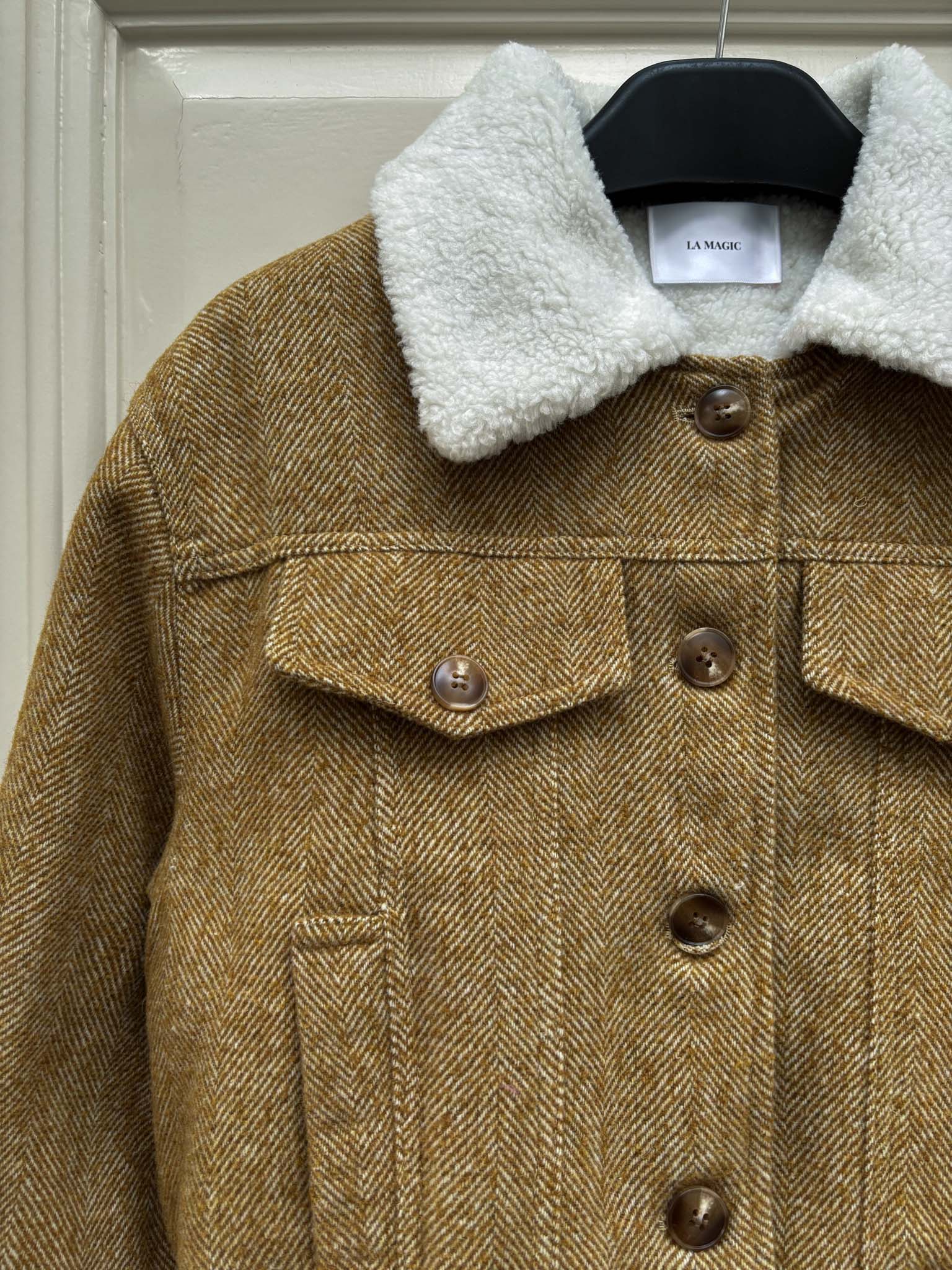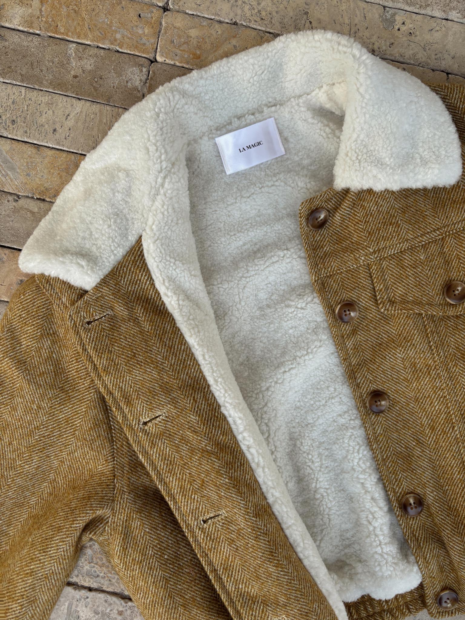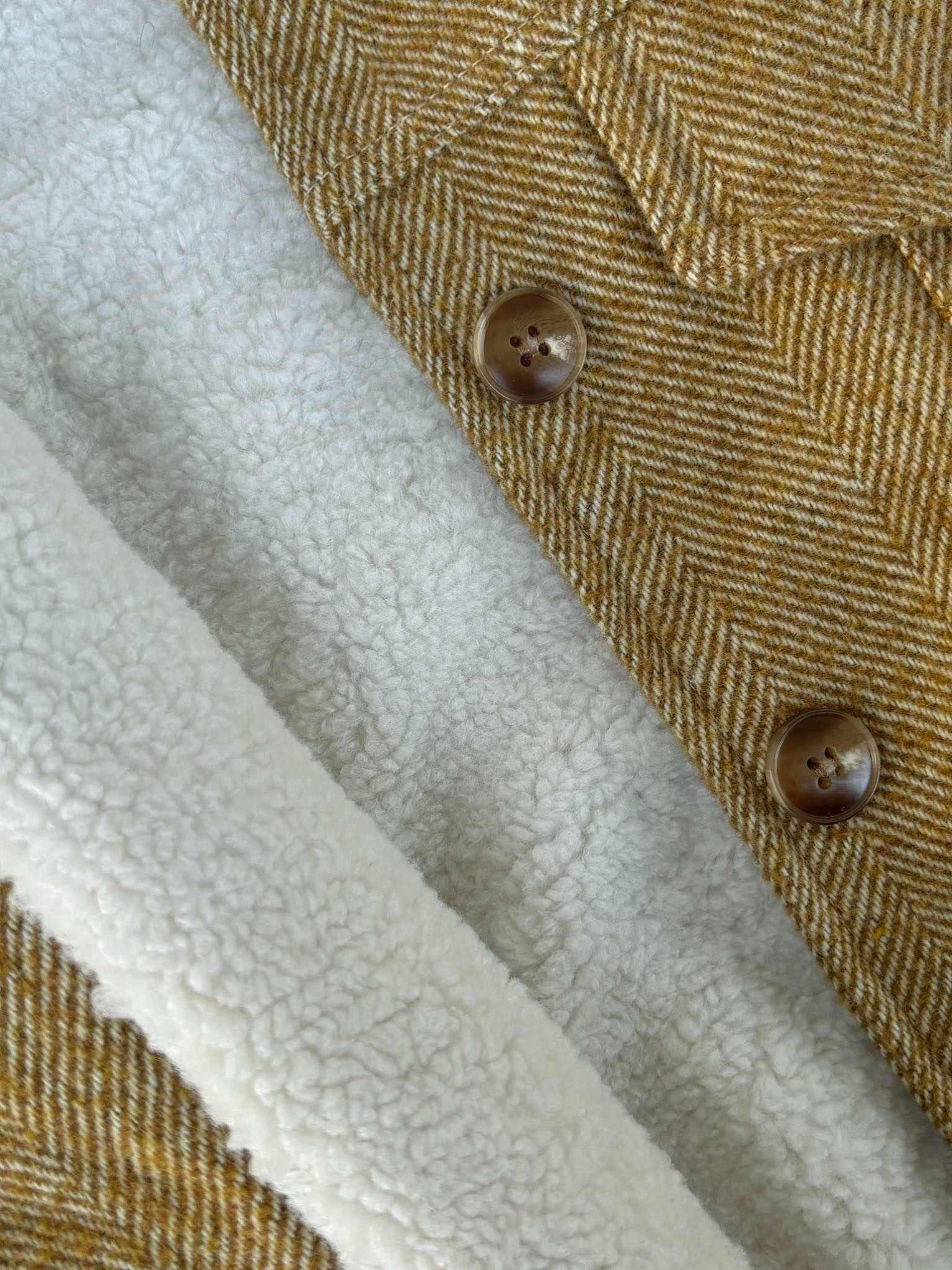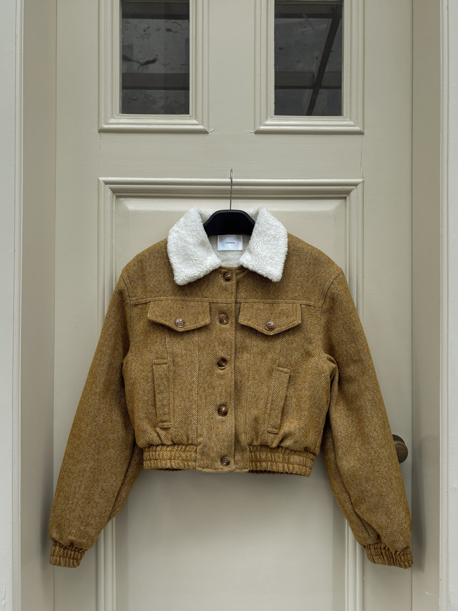 羊羔毛翻領 / 排釦設計 / 假口袋造型 / 微短版 / 保暖內刷毛