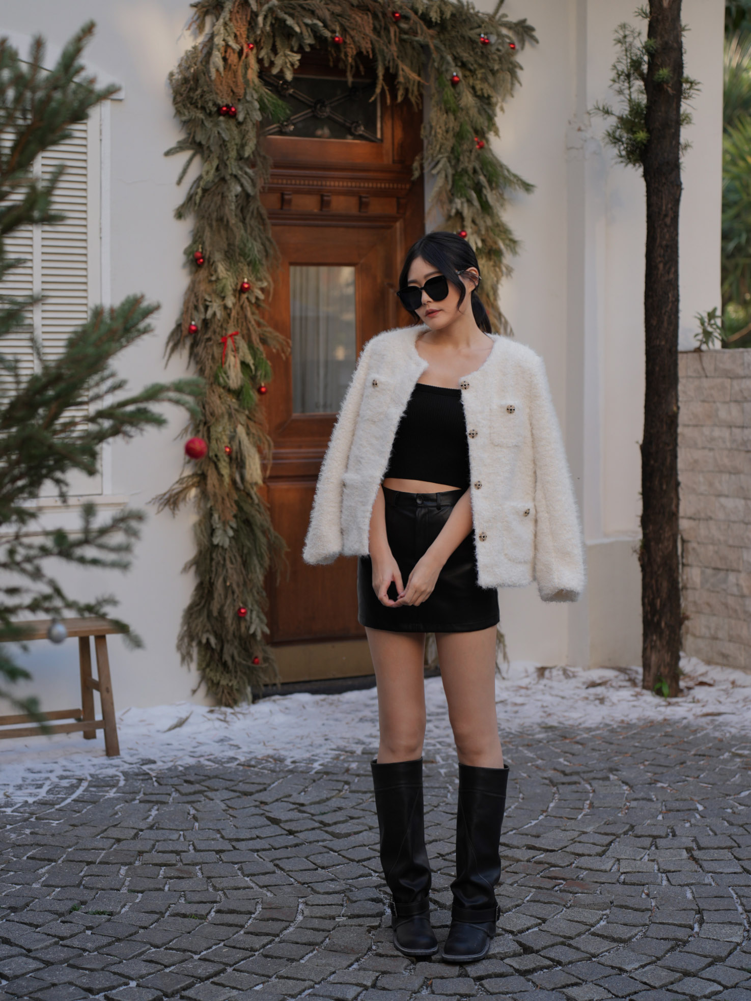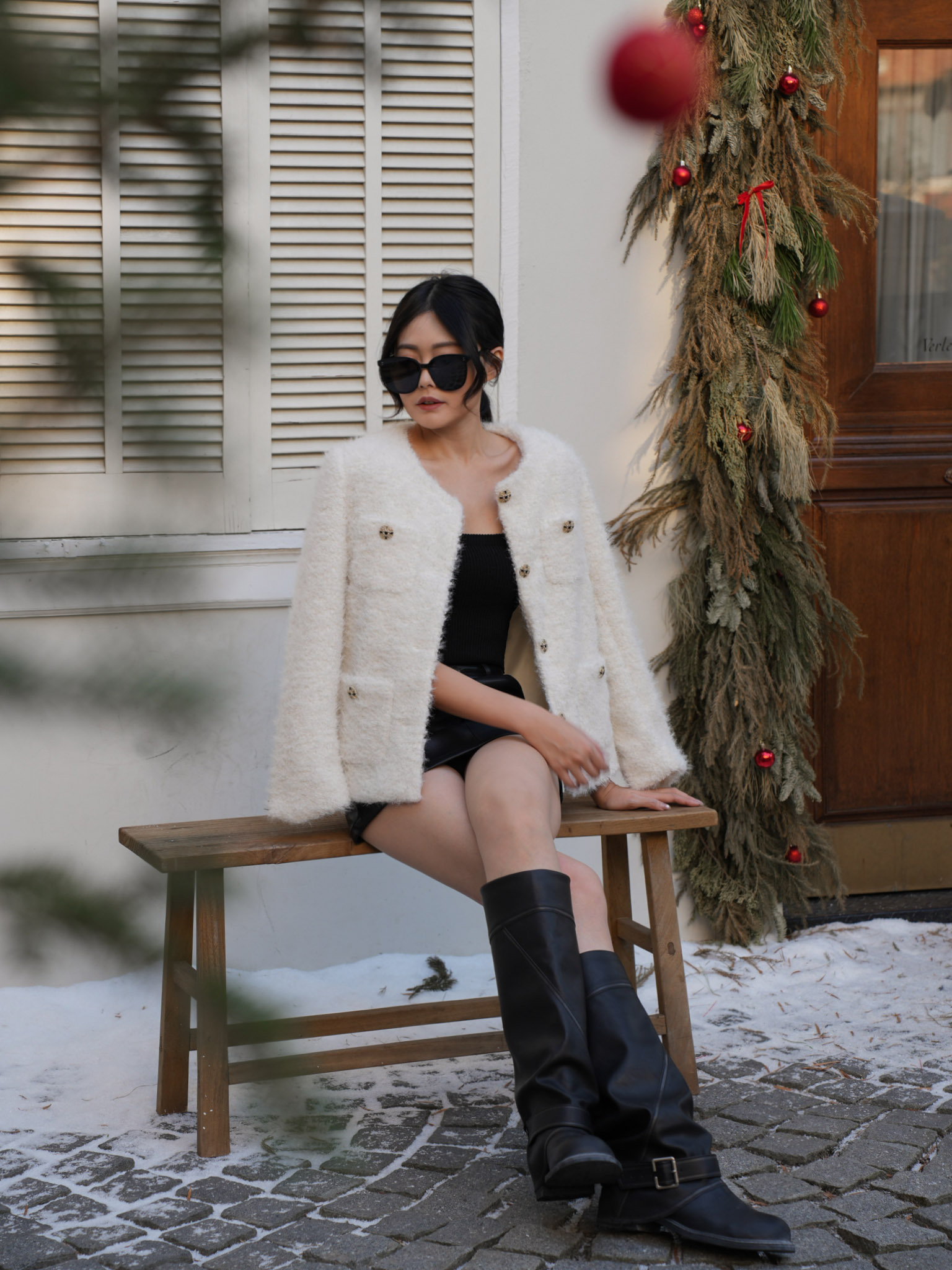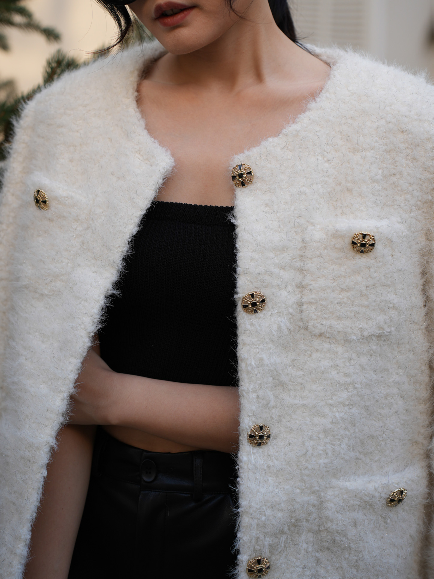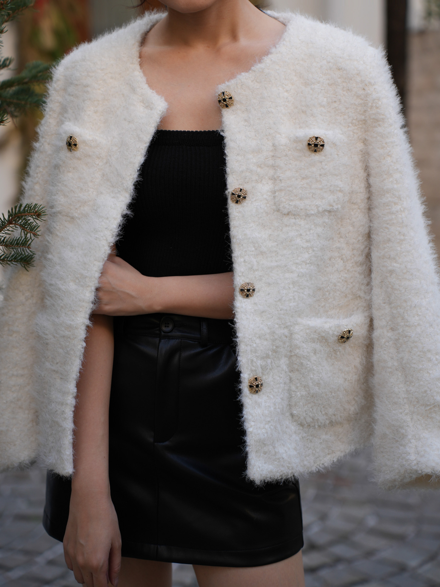 圓領 / 排釦 / 有口袋 / 毛毛織紋面料