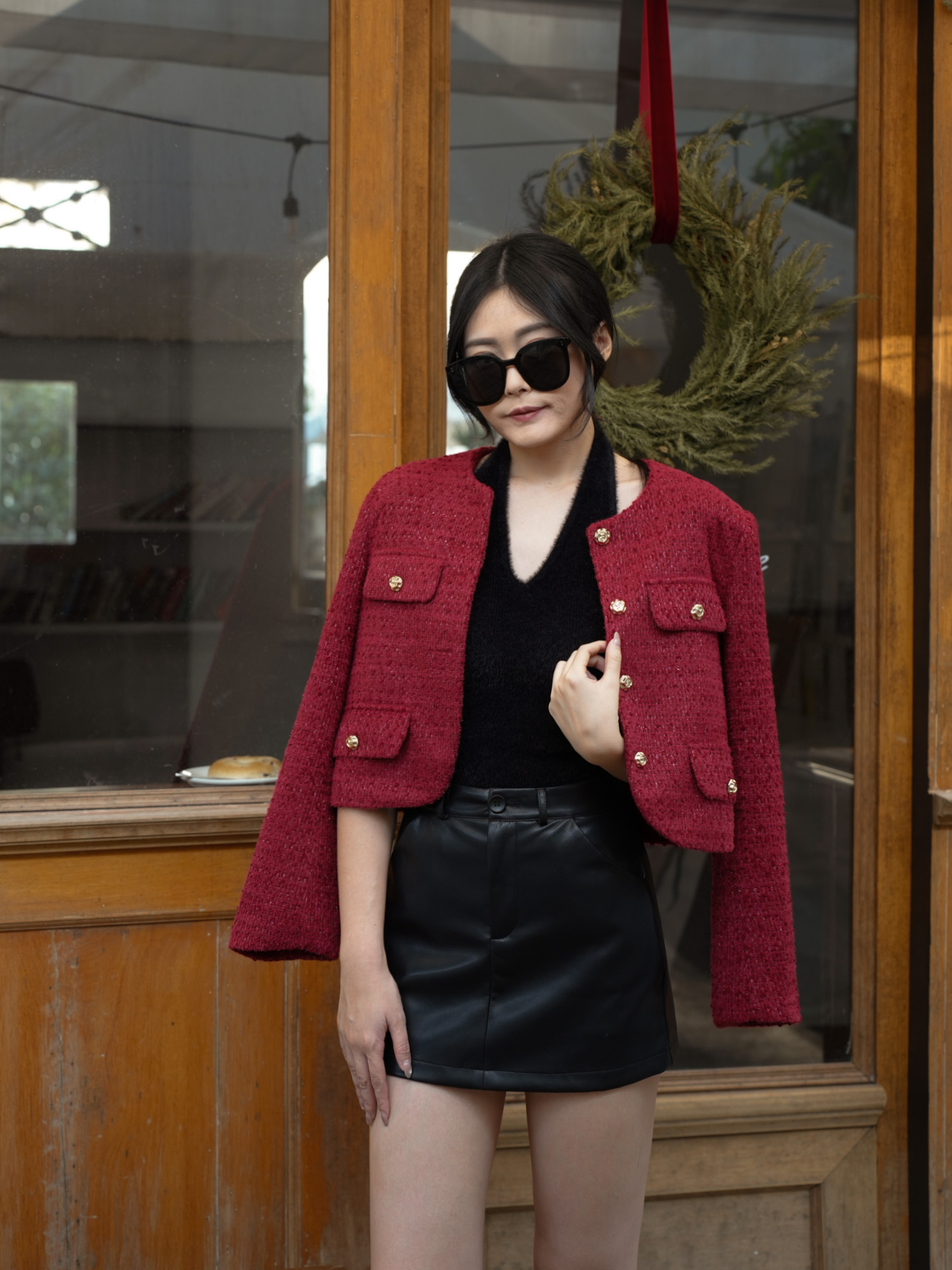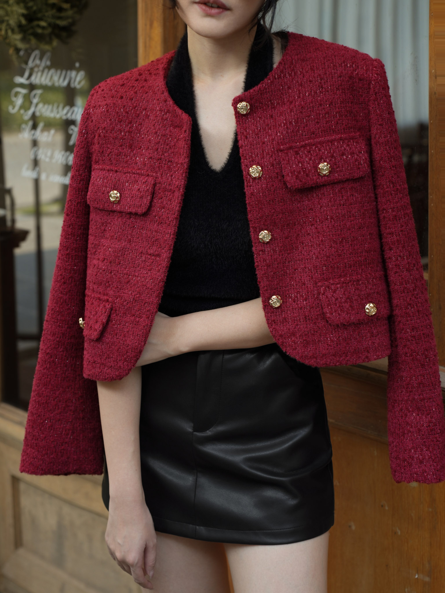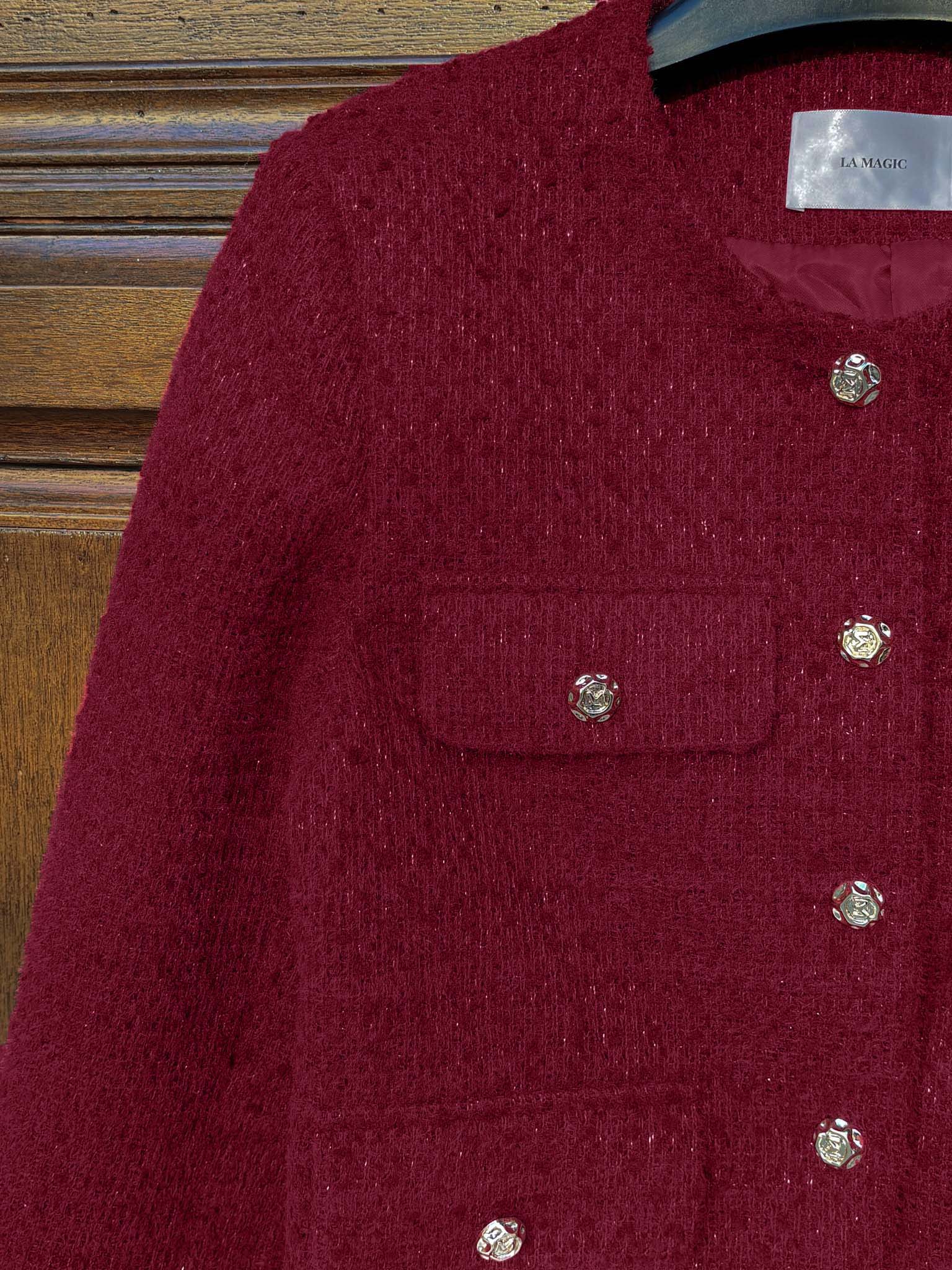 圓領 / 排釦設計 / 造型假口袋 / 小香織紋面料