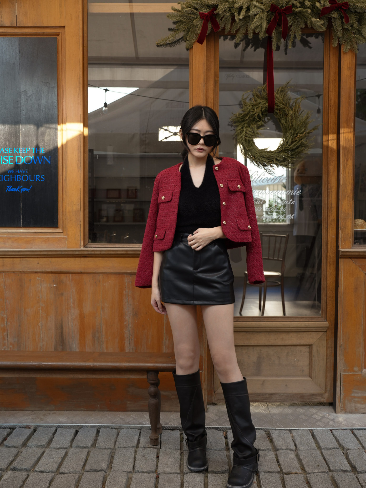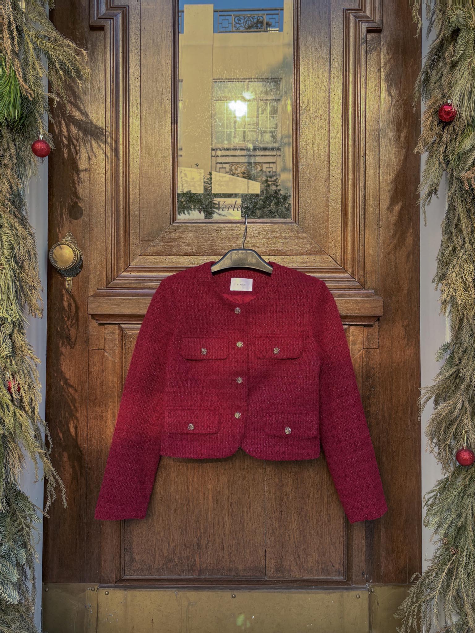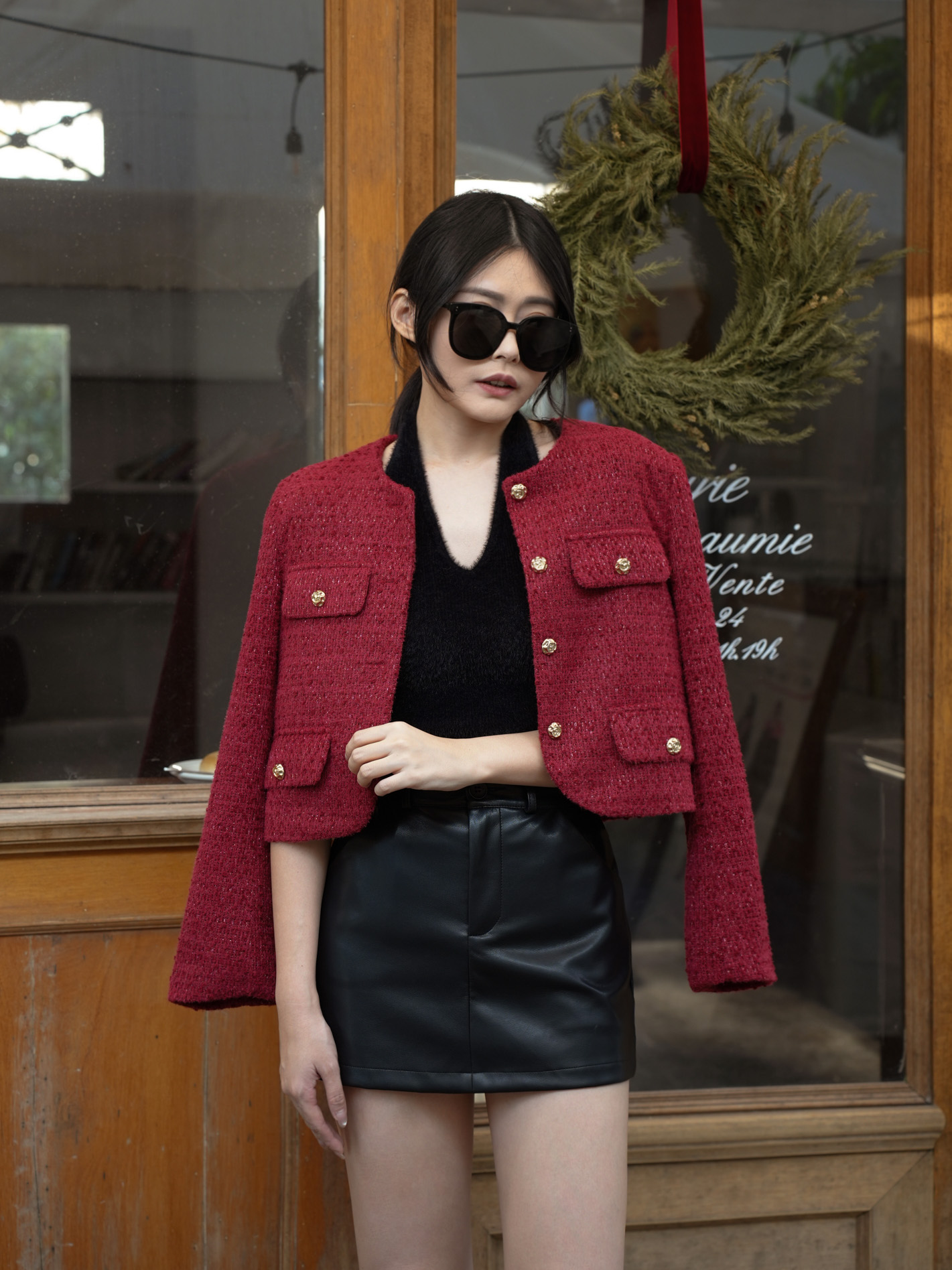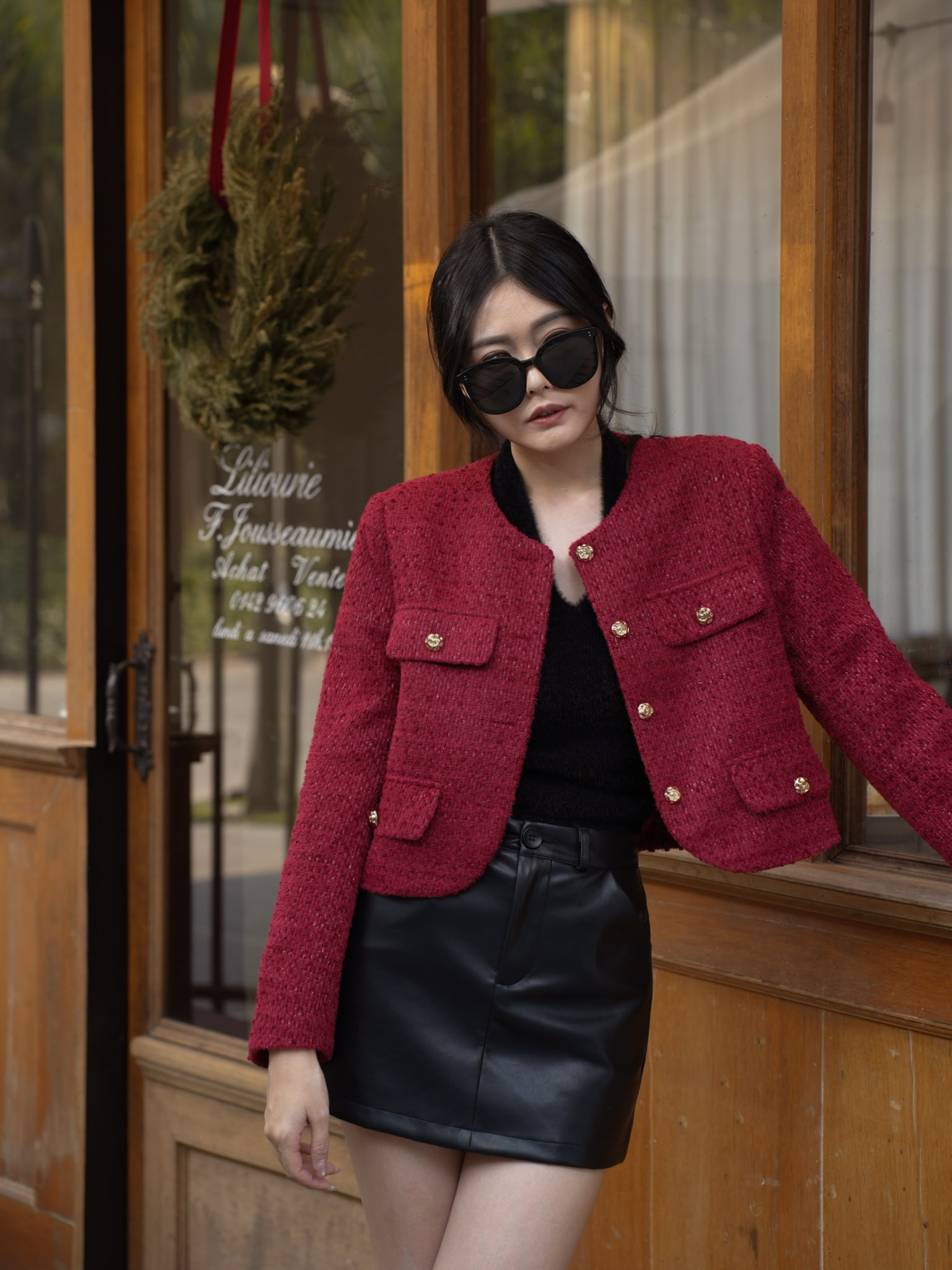 圓領 / 排釦設計 / 造型假口袋 / 小香織紋面料