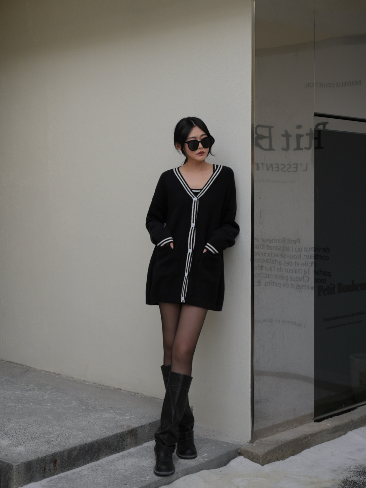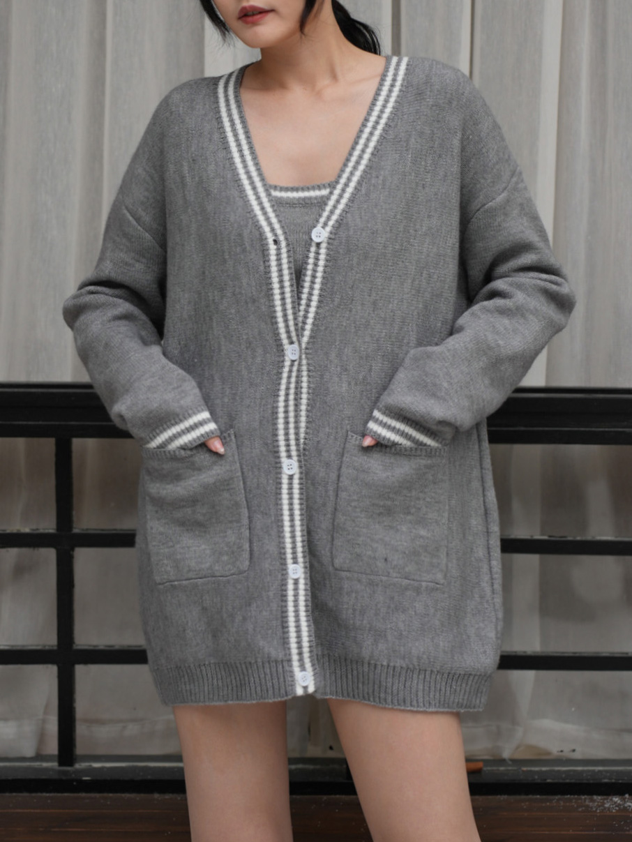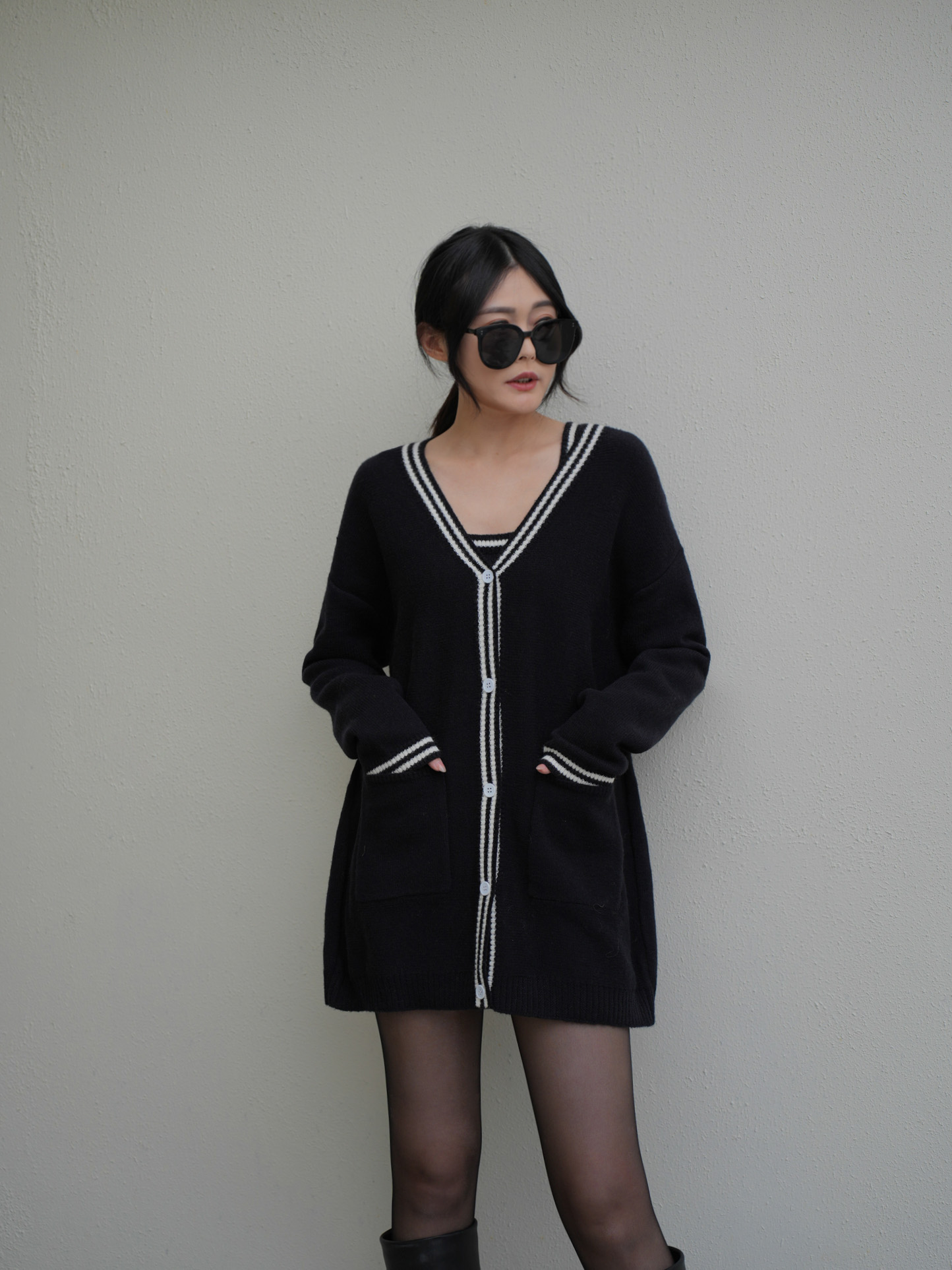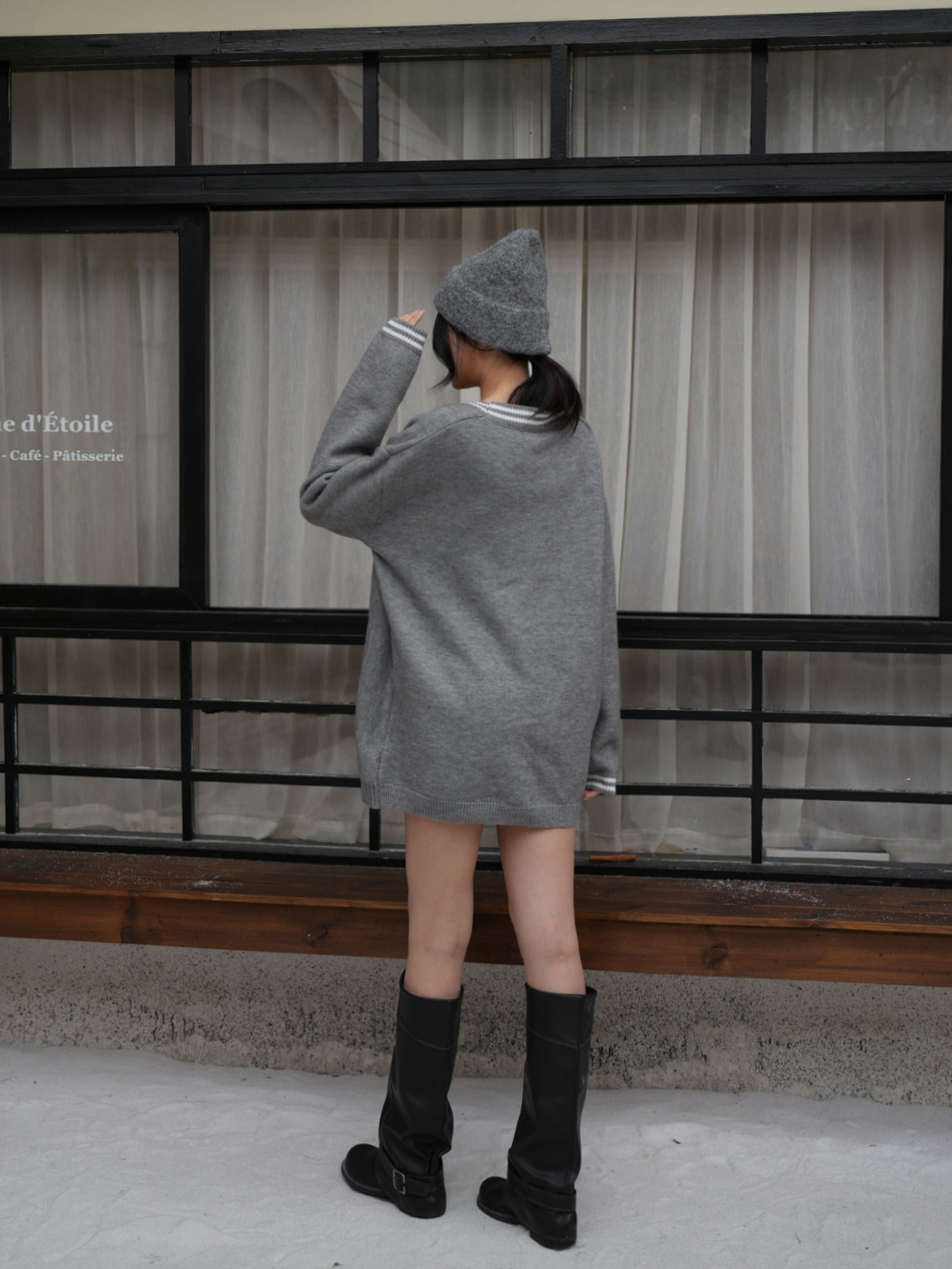 V領剪裁 / 寬鬆落肩版型 / 排釦設計 / 兩側有口袋