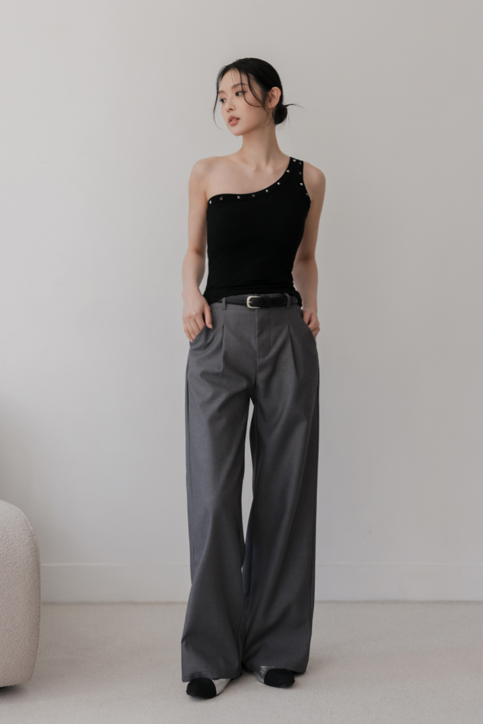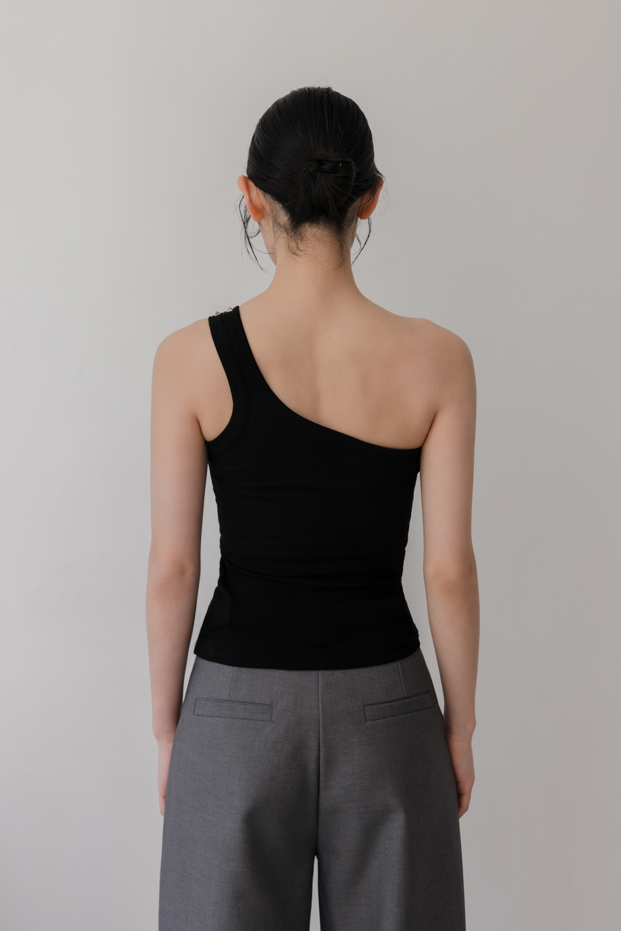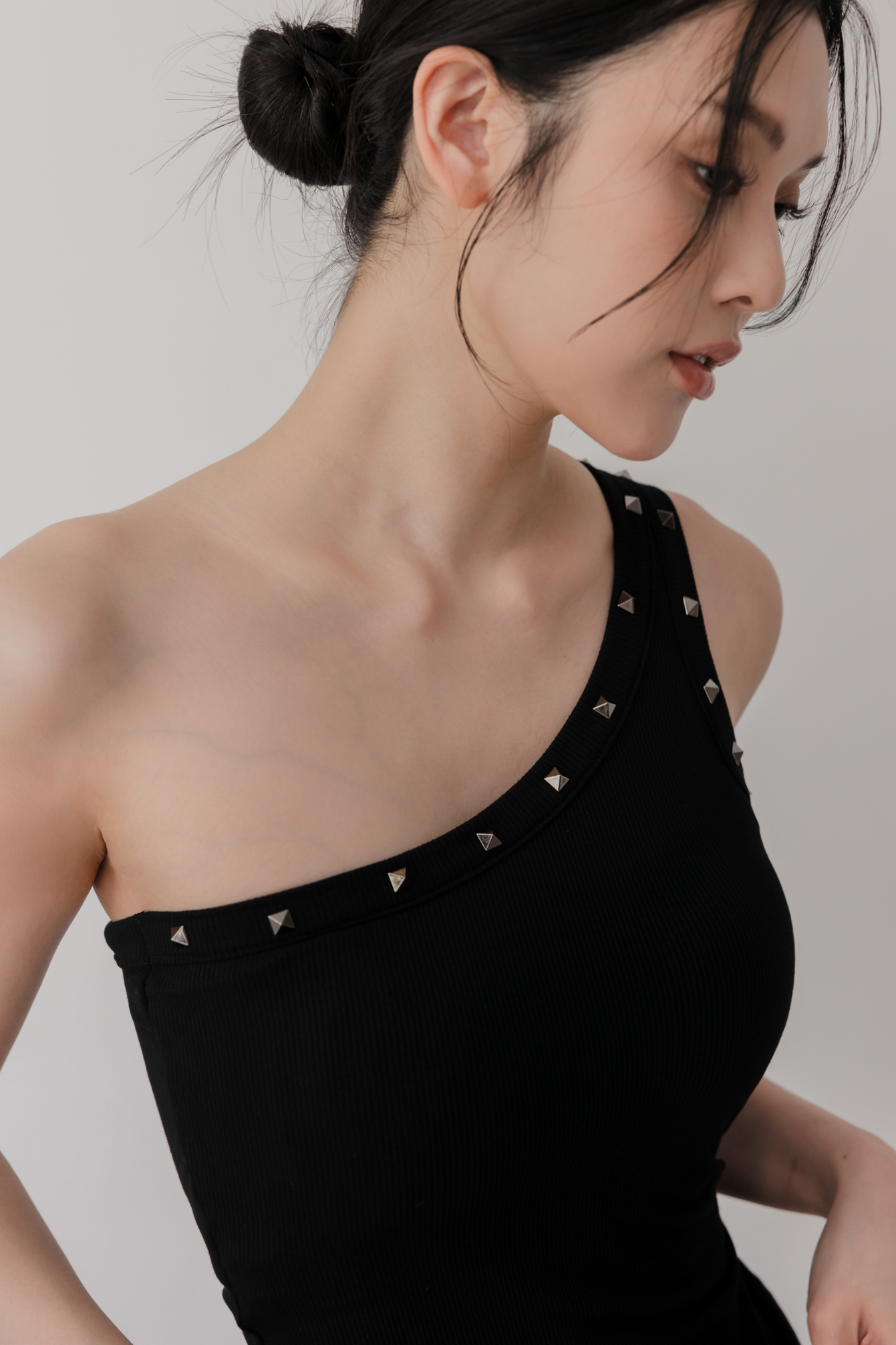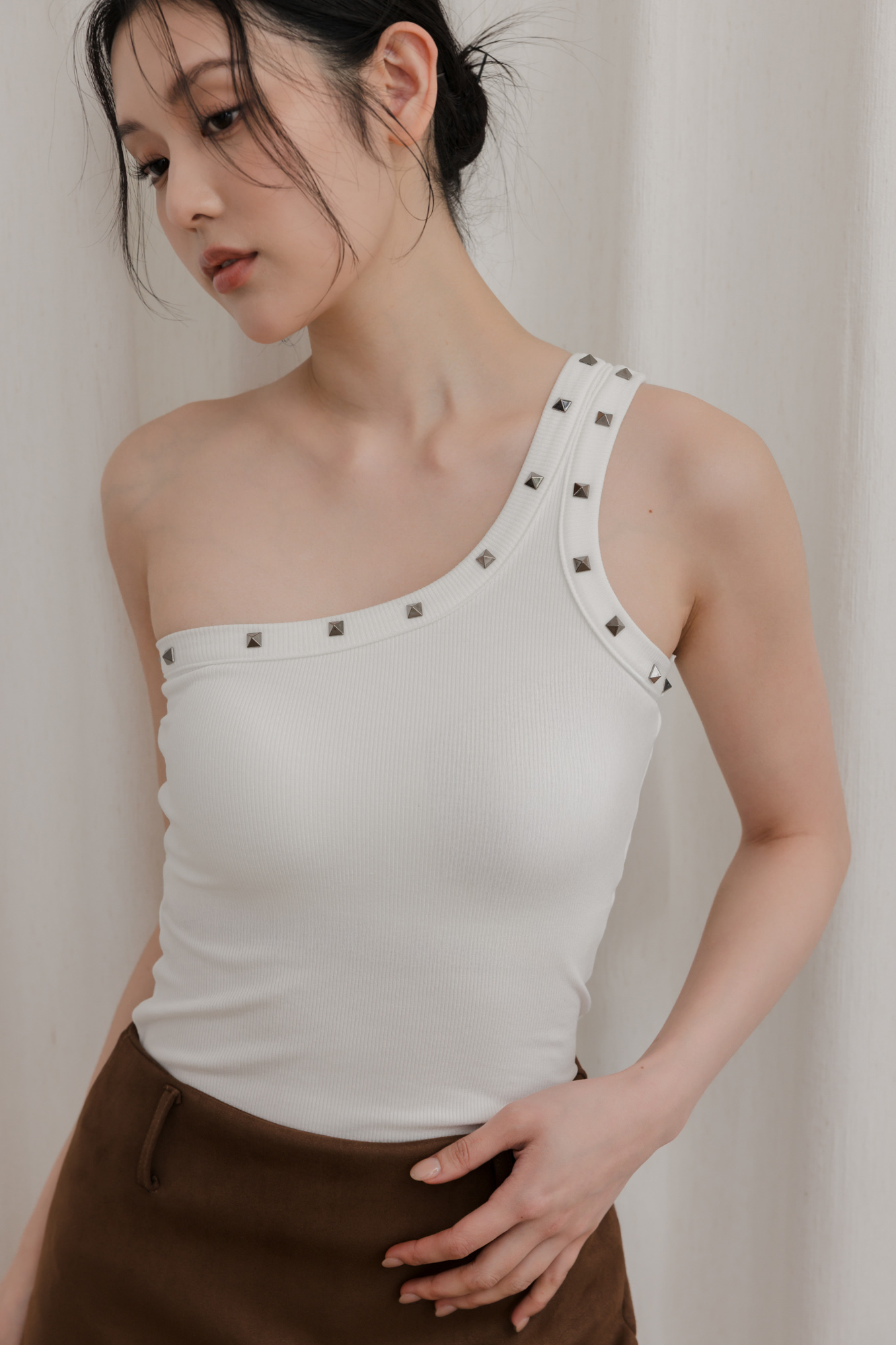 單肩剪裁結合鉚釘,個性中帶點精緻感