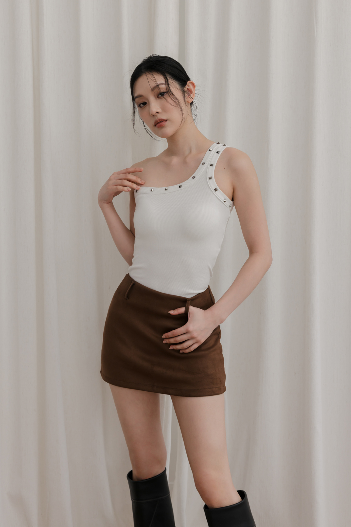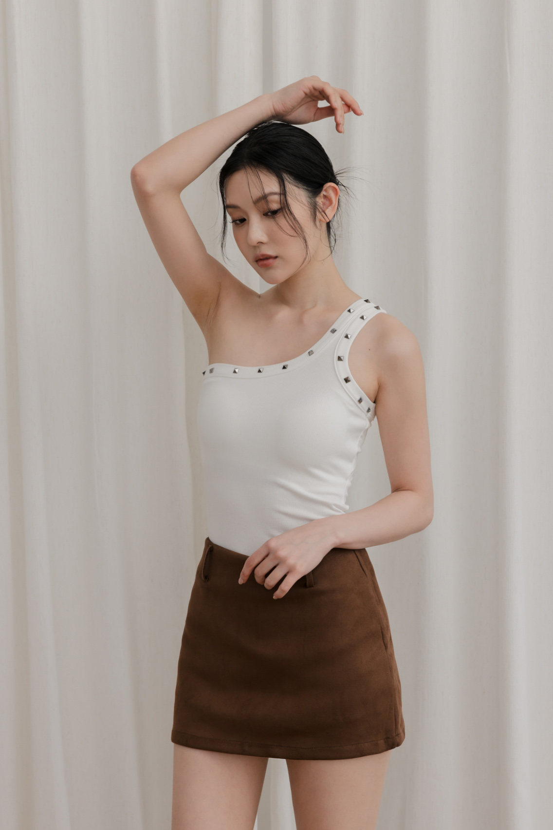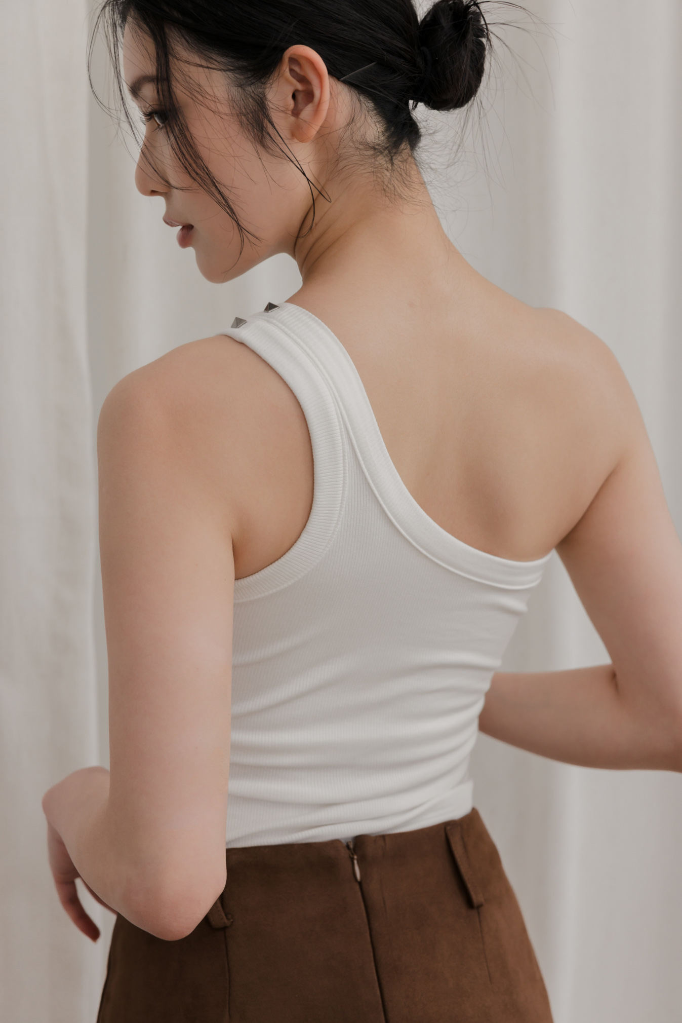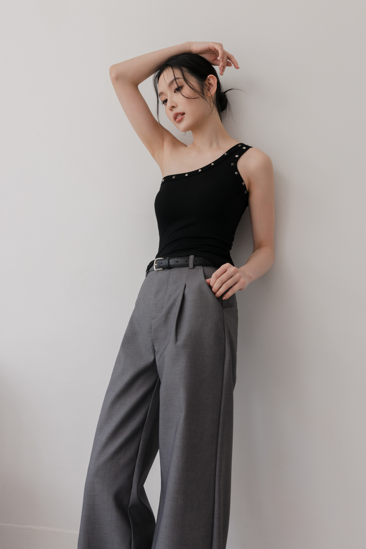 單肩剪裁結合鉚釘,個性中帶點精緻感
