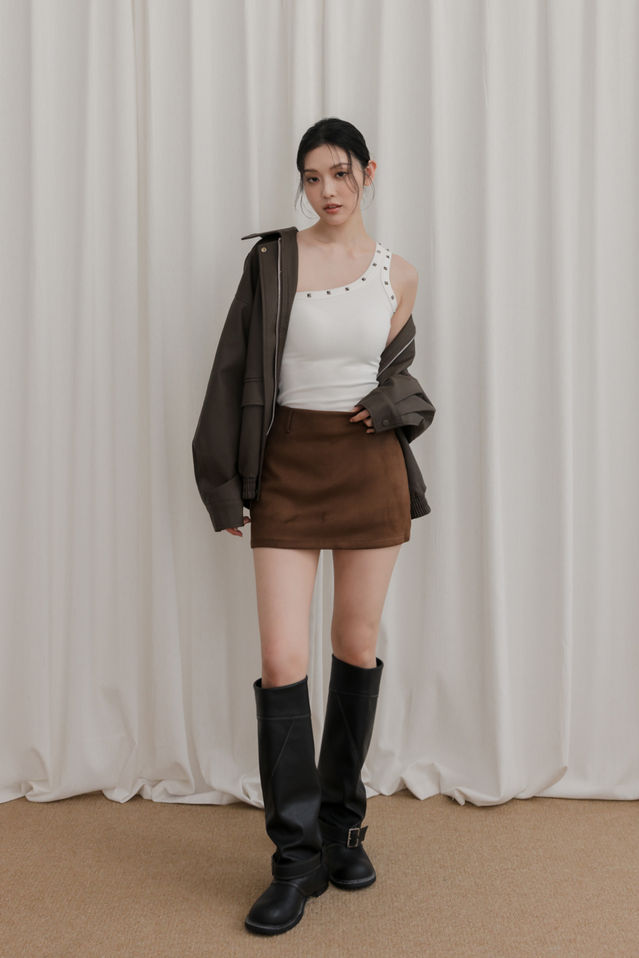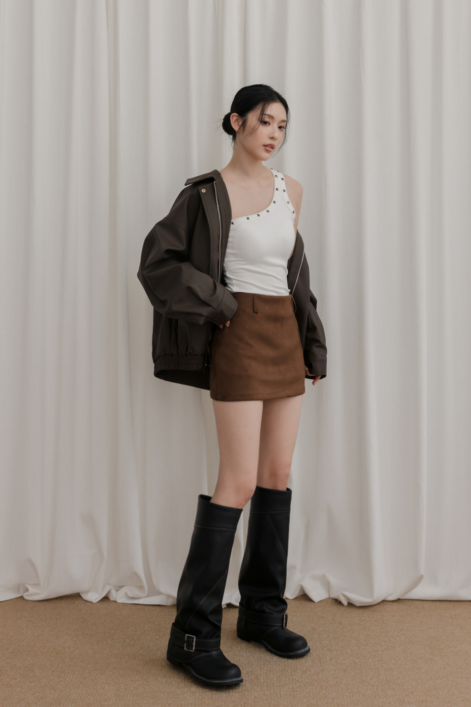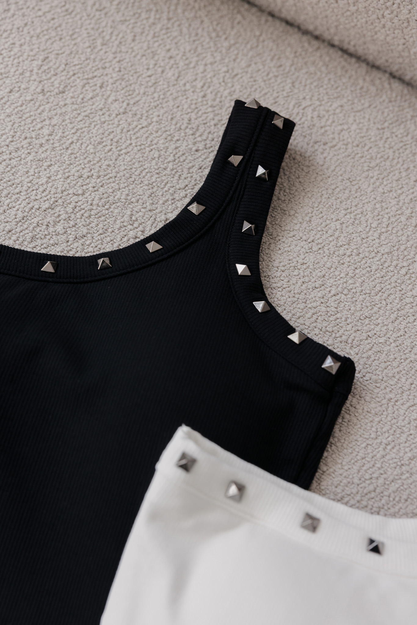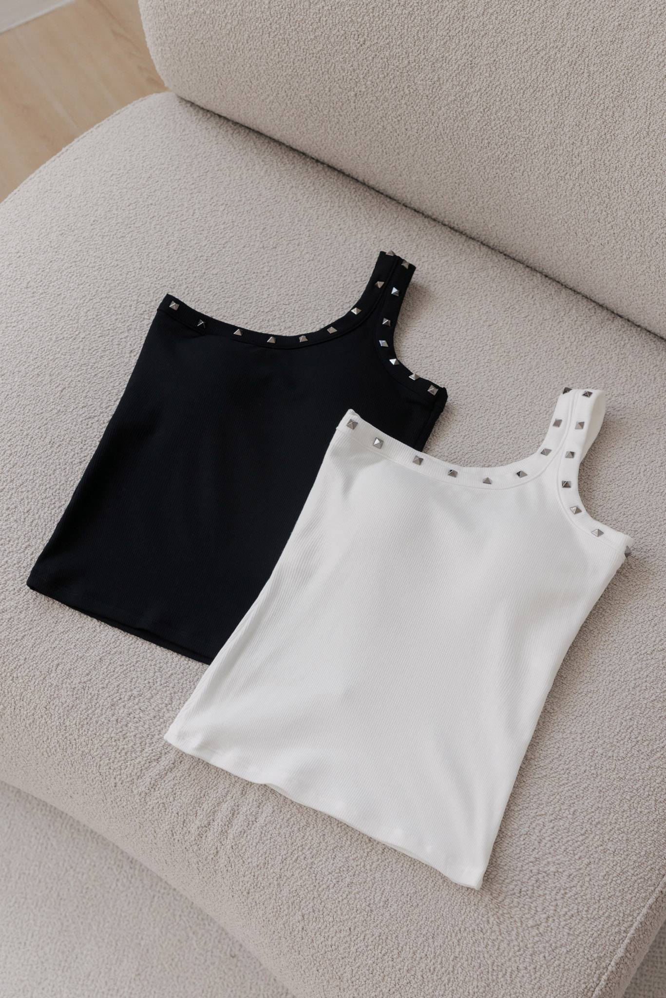 單肩剪裁結合鉚釘,個性中帶點精緻感